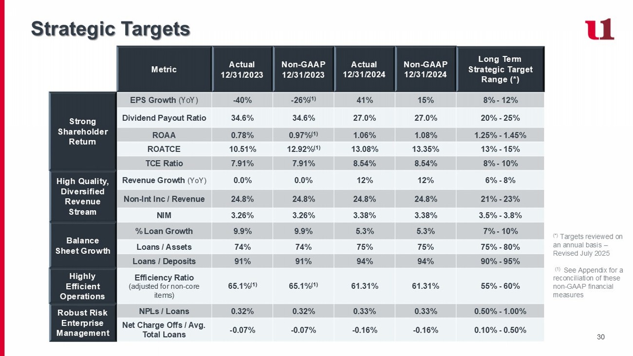 30个战略目标长期战略目标区间(*)Non-GAAP 12/31/2024实际12/31/2024 Non-GAAP 12/31/2023实际12/31/2023指标8%-12% 15% 41%-26%(1)-40% EPS增长(同比)强劲股东回报20%-25% 27.0% 27.0% 34.6% 34.6%派息率1.25%-1.45% 1.08% 1.06% 0.97%(1)0.78% ROAA 13%-15% 13.35% 13.08% 12.92%(1)10.51% ROATCE 8%-10% 8.54% 8.54% 7.91% 7.91% TCE比率6%-8% 12% 12% 12% 0.0% 0.0%收入增长(同比)高质量,多元化收入流21%-23% 24.8% 24.8% 24.8% 24.8% Non-Int Inc/revenue 3.5%-3.8% 3.38% 3.38% 3.26% 3.26% N IM 7%-10% 5.3% 5.3% 9.9% 9.9%贷款增长资产负债表增长75%-80% 75% 75% 75% 74%贷款/资产90%-95% 94% 94% 91% 91%贷款/存款55%-60% 61.31% 61.31% 65.1%(1)65.1%(1)效率比(调整后非核心项目)高效率运营0.50%-1.00% 0.33% 0.33% 0.32% 0.32%不良贷款/贷款稳健风险企业管理0.10%-0.50%-0.16%-0.16%-0.07%-0.07%净冲销/平均贷款总额(*)每年审查的目标– 2025年7月修订(1)这些非公认会计原则财务措施的调节见附录