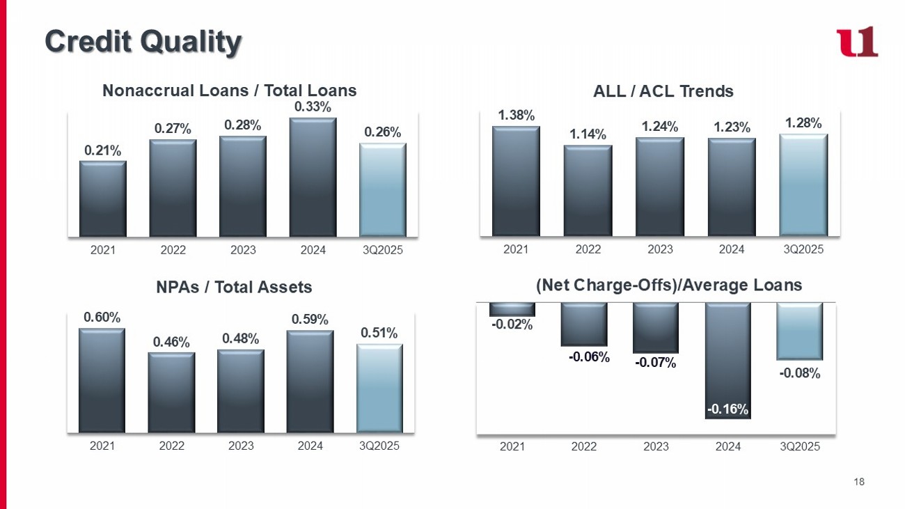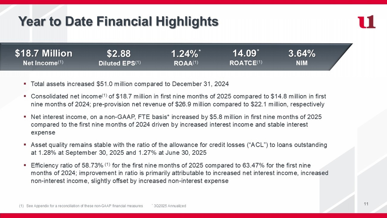 10 $ 690万净收入(1)$ 1.07摊薄后EPS(1)1.35%*ROAA(1)14.93*ROATCE(1)3.69% NIM第三季度财务摘要▪与2025年6月30日相比,总资产增加了1650万美元▪25年第三季度的合并净收入(1)为690万美元,而24年第三季度为580万美元,上一季度为600万美元;拨备前净收入为980万美元,分别为800万美元和8.8美元▪净利息收入,按非公认会计准则,FTE基础*由于利息收入增加和利息支出稳定,与2Q25相比,3Q25增加了70万美元▪资产质量保持稳定,信贷损失准备金(“ACL”)与未偿还贷款的比率在3Q25为1.28%,在联系季度为1.27%▪效率比率为56.97%(1)的2025年第三季,而上季则为59.39%;主要归因于稳定的非利息开支,与出售投资收益和收到支票费用奖励相关的净利息收入增加和非利息收入增加(1)这些非公认会计准则财务指标的对账见附录*2025年第三季度年化