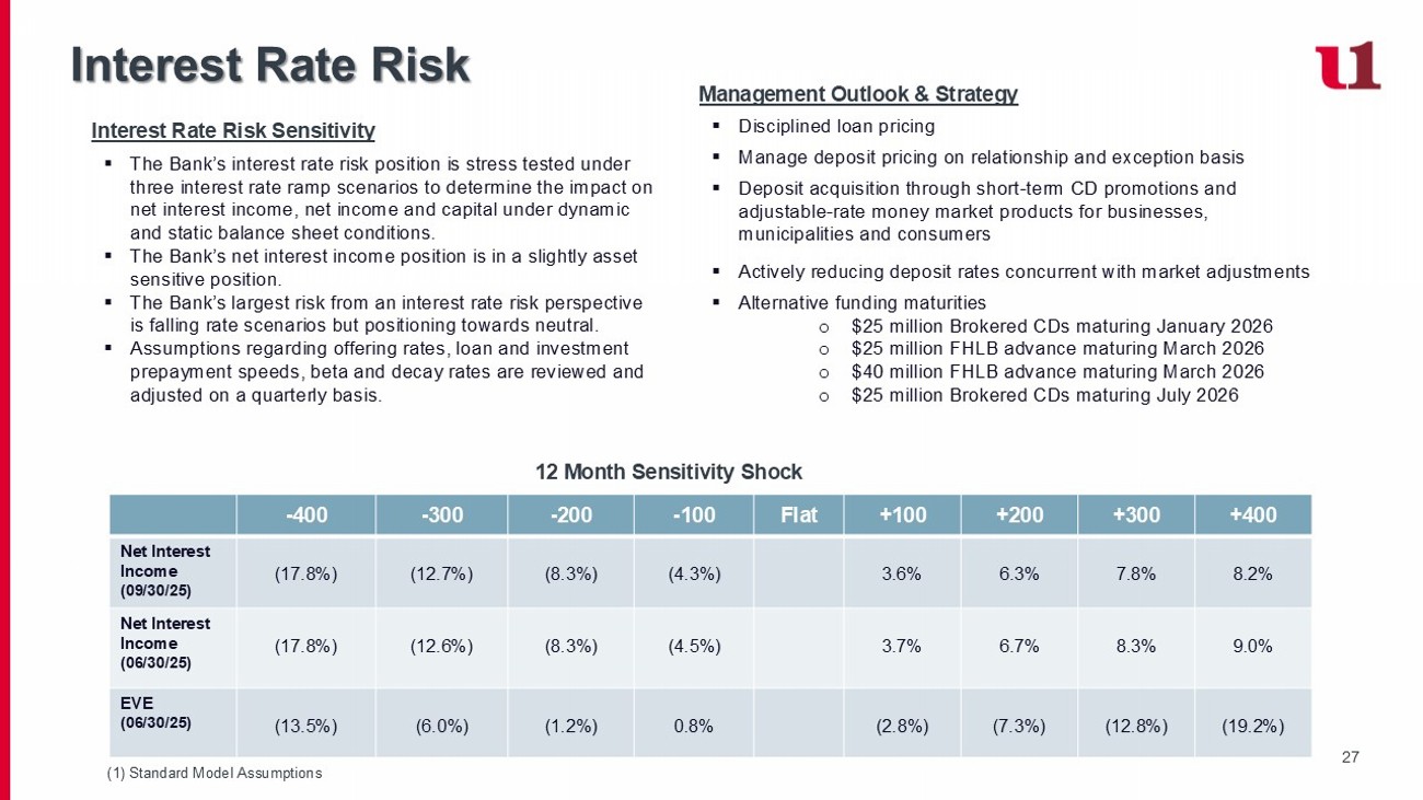26流动性头寸可用净额(千美元)使用金额(千美元)可用金额(千美元)流动性来源(09/30/2025)内部来源72042美元72042美元超额现金21119美元21119美元未质押证券(BV)外部来源84544美元84544美元美联储(贴现窗口)140000美元260,837美元71,921美元140,000美元332,758代理无担保信贷额度FHLB 578,542美元71,921美元650,463资金来源总额