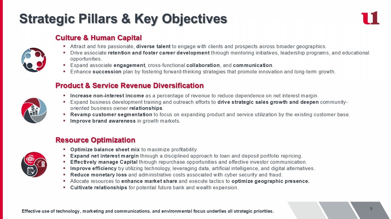 9大战略支柱&关键目标文化&人力资本▪吸引和雇用充满激情、多元化的人才,与更广泛地区的客户和潜在客户互动。▪通过辅导计划、领导力计划和教育机会,推动员工留任并促进职业发展。▪扩大员工参与、跨职能协作和沟通。▪通过培养促进创新和长期增长的前瞻性思维战略,增强继任计划。产品&服务收入多元化▪提高非利息收入占营收比例,减少对净息差的依赖。▪扩大业务拓展培训和外联力度,带动战略销售增长,深化面向社区的企业主关系。▪改造客户细分,专注于扩大现有客户群对产品和服务的利用。▪在成长型市场提高品牌知名度。资源优化▪优化资产负债表组合,实现盈利最大化。▪通过有纪律的贷款和存款组合重新定价方法扩大净息差。▪通过回购机会和有效的投资者沟通有效管理资本。▪通过利用技术、利用数据、人工智能和数字替代品来提高效率。▪减少与网络安全和欺诈相关的金钱损失和管理成本。▪配置资源提升市场份额,执行战术优化地域存在。▪为未来潜在的银行和财富扩张培养关系。有效利用技术、营销和传播以及环境重点是所有战略优先事项的基础。