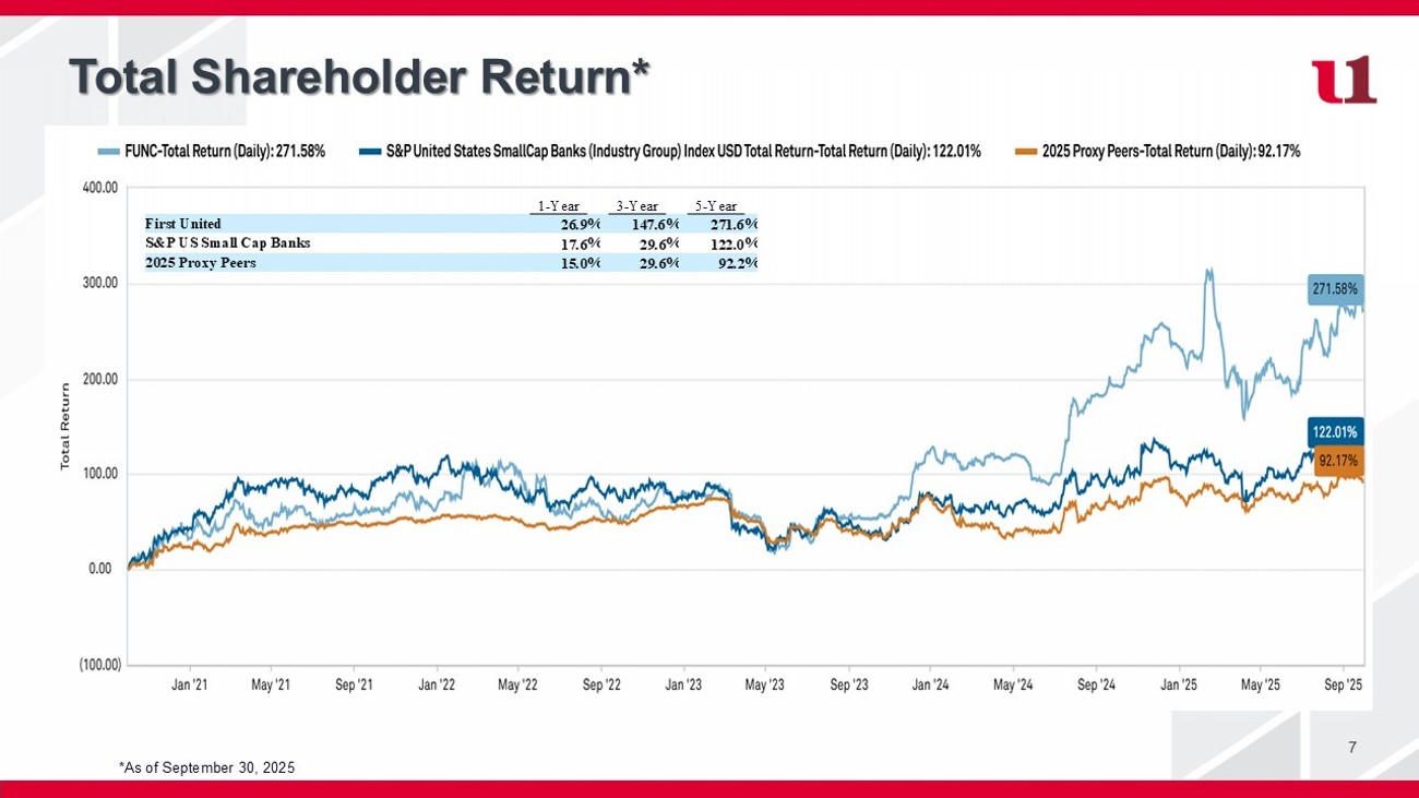 股东总回报*7*截至2025年9月30日止5年期3年期1年期% 271.6% 147.6% 26.9 马里兰第一联合 % 122.0% 29.6% 17.6 标普美国小型股银行% 92.2% 29.6% 15.02025代理同业