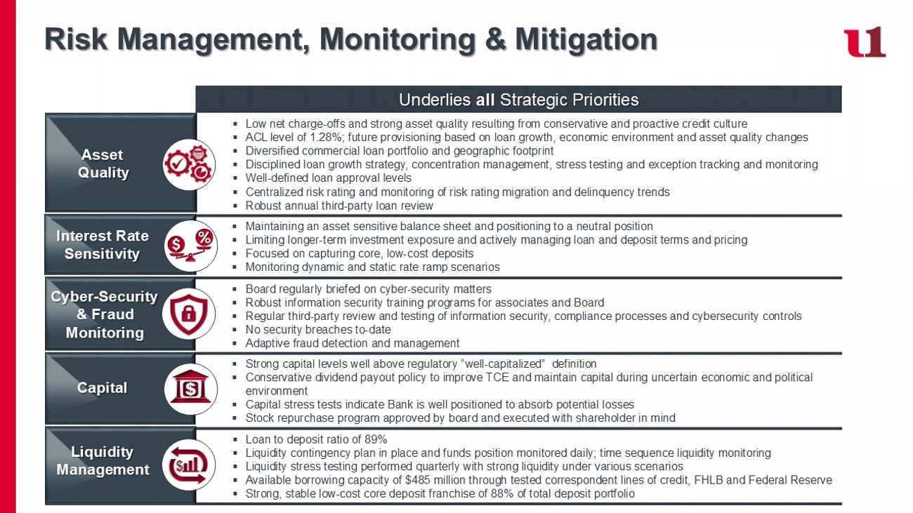 风险管理、监测和缓解是所有战略重点的基础▪保守和积极的信贷文化导致的低净冲销和强劲的资产质量▪ACL水平1.28%;未来基于贷款增速、经济环境和资产质量变化计提拨备▪多元化的商业贷款组合和地理足迹▪有纪律的贷款增长战略、集中度管理、压力测试和异常跟踪和监测▪明确界定的贷款审批水平▪风险等级集中评级及风险等级迁移和拖欠趋势监测▪稳健的年度第三方贷款审查▪维持对资产敏感的资产负债表,定位中性▪限制较长期投资敞口,积极管理贷款和存款条款和定价▪专注于捕获核心,低成本存款▪监测动态和静态速率爬坡场景▪董事会定期就网络安全事项进行简报▪为员工和董事会提供强大的信息安全培训计划▪信息安全定期第三方审查测试,合规流程和网络安全控制▪迄今未发生安全漏洞▪自适应欺诈检测和管理▪强劲的资本水平远高于监管“资本充足”的定义▪保守的派息政策,在不确定的经济和政治环境中改善TCE并保持资本▪资本压力测试显示银行有能力吸收潜在损失▪股票回购计划获董事会批准并在执行时考虑到股东▪贷存比89%▪流动性应急计划到位和基金仓位每日监测;时序流动性监测▪流动性压力测试每季度进行一次,各种情景下流动性较强▪通过测试的代理信贷额度、FHLB和美联储的可用借款能力为4.85亿美元▪强大、稳定的低成本核心存款专营权占总存款组合的88%赛博-安全与欺诈监测资产质量资本流动性管理利率敏感性