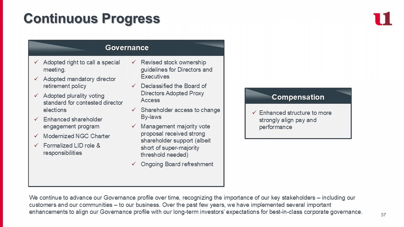 37持续进步随着时间的推移,我们继续推进我们的治理形象,认识到我们的关键利益相关者——包括我们的客户和我们的社区——对我们的业务的重要性。过去几年,我们实施了几项重要的增强措施,以使我们的治理概况与我们的长期投资者对一流公司治理的期望保持一致。x增强结构以更有力地使薪酬和绩效薪酬治理保持一致x修订的董事持股准则和高管x解密董事会采用代理访问权限x股东获得法律变更权限x管理层的多数投票提案获得了股东的大力支持(尽管没有达到所需的超级多数门槛)x正在进行的董事会更新x采用了召开特别会议的权利。x采用了强制性董事退休政策x对有争议的董事选举采用了多数人投票标准x加强了股东参与计划x现代化的NGC章程x正式的LID角色和职责