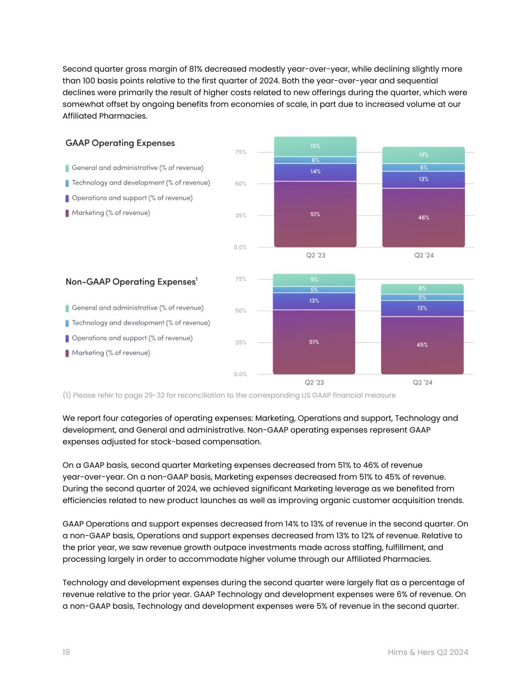 第二季度毛利率为81%,同比略有下降,但与2024年第一季度相比下降略超过100个基点。同比和环比下降主要是由于本季度与新产品相关的成本增加,这在一定程度上被规模经济带来的持续收益所抵消,部分原因是我们附属药店的销量增加。(1)请参阅第29-32页,了解与相应的美国通用会计准则财务指标的对账情况我们报告了四类运营费用:营销、运营和支持、技术和开发以及一般和行政。非美国通用会计准则运营费用是指根据股票薪酬调整的美国通用会计准则费用。按公认会计原则计算,第二季度营销费用占收入的比例从51%同比下降至46%。按非公认会计原则计算,营销费用占收入的比例从51%降至45%。在2024年第二季度,我们实现了显着的营销杠杆,因为我们受益于与新产品发布相关的效率以及有机客户获取趋势的改善。第二季度GAAP运营和支持费用占营收的比例从14%降至13%。按非公认会计原则计算,运营和支持费用占收入的比例从13%降至12%。与上一年相比,我们看到收入增长超过了在人员配置、履行和处理方面的投资,主要是为了通过我们的附属药店容纳更高的销量。与上一年相比,第二季度的技术和开发费用在收入中所占百分比基本持平。GAAP技术和开发费用为收入的6%。按非公认会计原则计算,第二季度技术和开发费用为收入的5%。19 HIMS & HERS 2024年第二季度