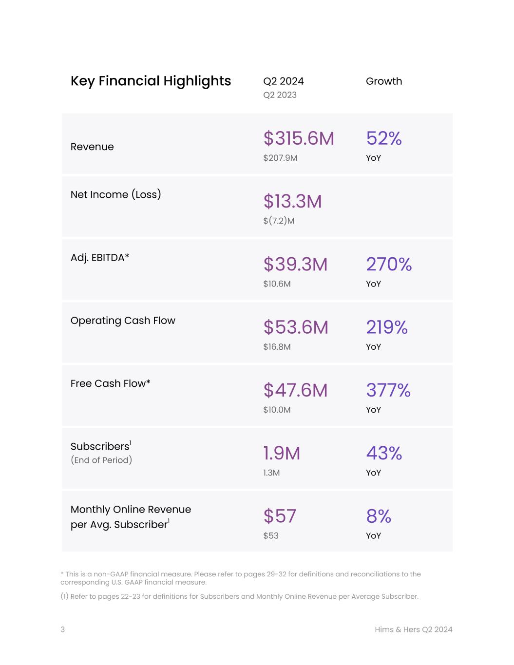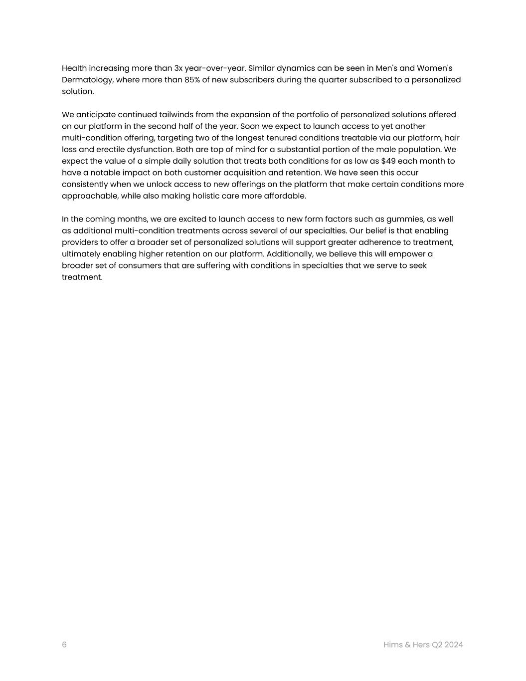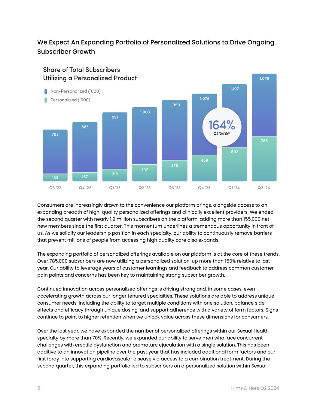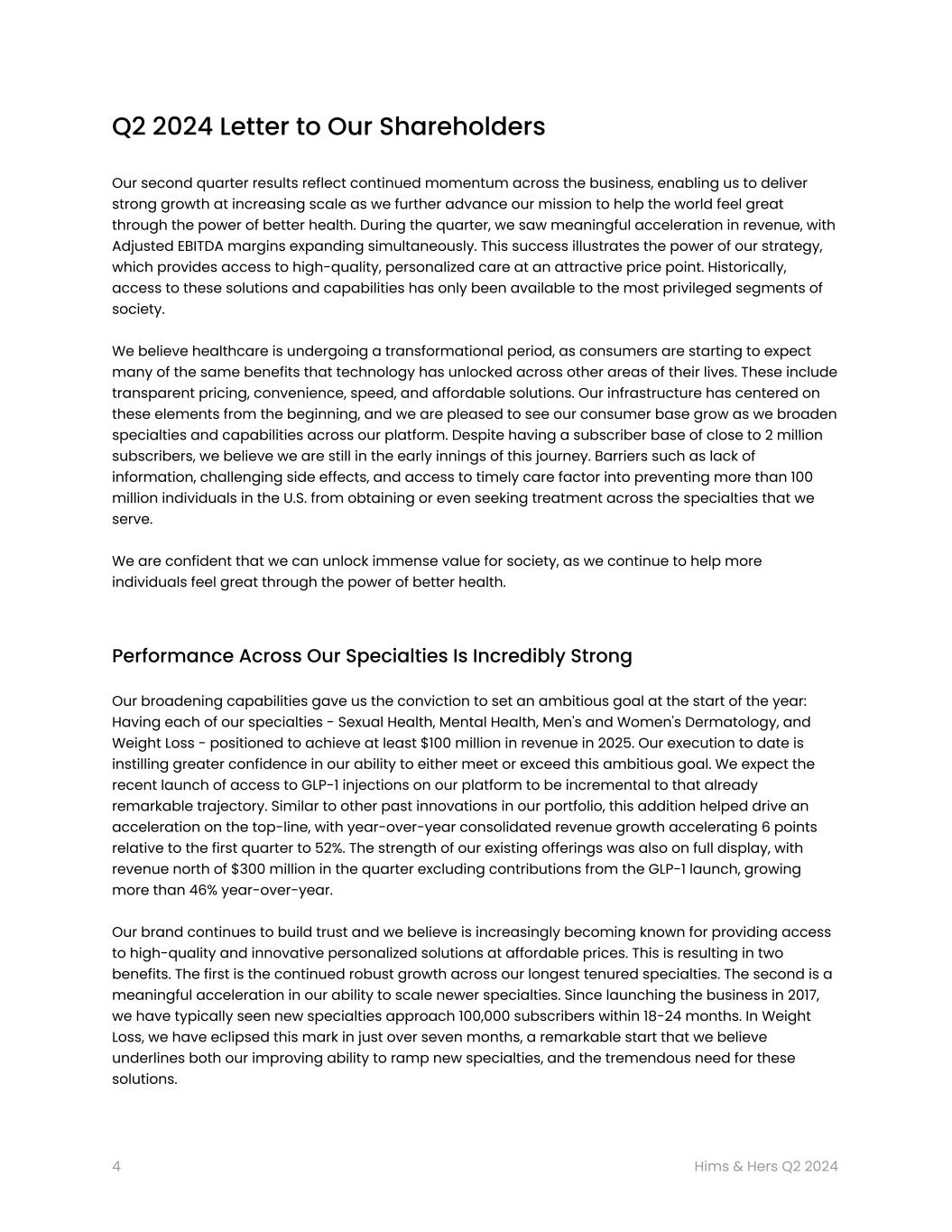 2024年第二季度致股东的信我们第二季度的业绩反映了整个业务的持续势头,使我们能够在规模不断扩大的情况下实现强劲增长,因为我们进一步推进我们的使命,即通过更好的健康力量帮助世界感到伟大。本季度,我们看到收入显着加速,调整后EBITDA利润率同步扩大。这一成功说明了我们战略的力量,该战略以具有吸引力的价格提供了获得高质量、个性化护理的机会。从历史上看,只有社会中最有特权的阶层才能获得这些解决方案和能力。我们认为,医疗保健正在经历一个转型期,因为消费者开始期待技术在他们生活的其他领域释放出的许多相同好处。这些包括透明的定价、便利、速度和负担得起的解决方案。我们的基础设施从一开始就以这些元素为中心,我们很高兴看到我们的消费者基础随着我们在整个平台上拓宽专业和能力而增长。尽管拥有接近200万订户的用户基础,我们相信我们仍处于这一旅程的早期阶段。缺乏信息、具有挑战性的副作用以及获得及时护理等障碍因素阻碍了美国超过1亿人在我们所服务的专业领域获得甚至寻求治疗。我们有信心,我们可以为社会释放巨大的价值,因为我们继续通过更好的健康的力量帮助更多的人感到伟大。我们各专业的表现令人难以置信的强大我们的拓宽能力让我们有信心在年初制定一个雄心勃勃的目标:让我们的每一个专业——性健康、心理健康、男性和女性皮肤科以及减肥——在2025年实现至少1亿美元的收入。我们迄今为止的执行正在为我们实现或超过这一宏伟目标的能力注入更大的信心。我们预计,最近在我们的平台上推出的GLP-1注射液的准入将增加这一已经引人注目的轨迹。与我们投资组合中过去的其他创新类似,这一新增有助于推动收入加速增长,与第一季度相比,综合收入同比增长加快了6个百分点,达到52%。我们现有产品的实力也得到了充分展示,不包括GLP-1发布的贡献,本季度的收入超过了3亿美元,同比增长超过46%。我们的品牌继续建立信任,我们相信以提供以可承受的价格获得高质量和创新的个性化解决方案而日益为人所知。这就产生了两个好处。首先是我们最长的终身专业的持续强劲增长。第二个是我们扩展较新专业的能力有意义的加速。自2017年推出该业务以来,我们通常在18-24个月内看到新的专业接近10万名订阅用户。在减肥方面,我们仅用了七个多月就超越了这一指标,这是一个了不起的开端,我们认为这突显了我们提升新专业的能力,以及对这些解决方案的巨大需求。4他和她2024年第二季度