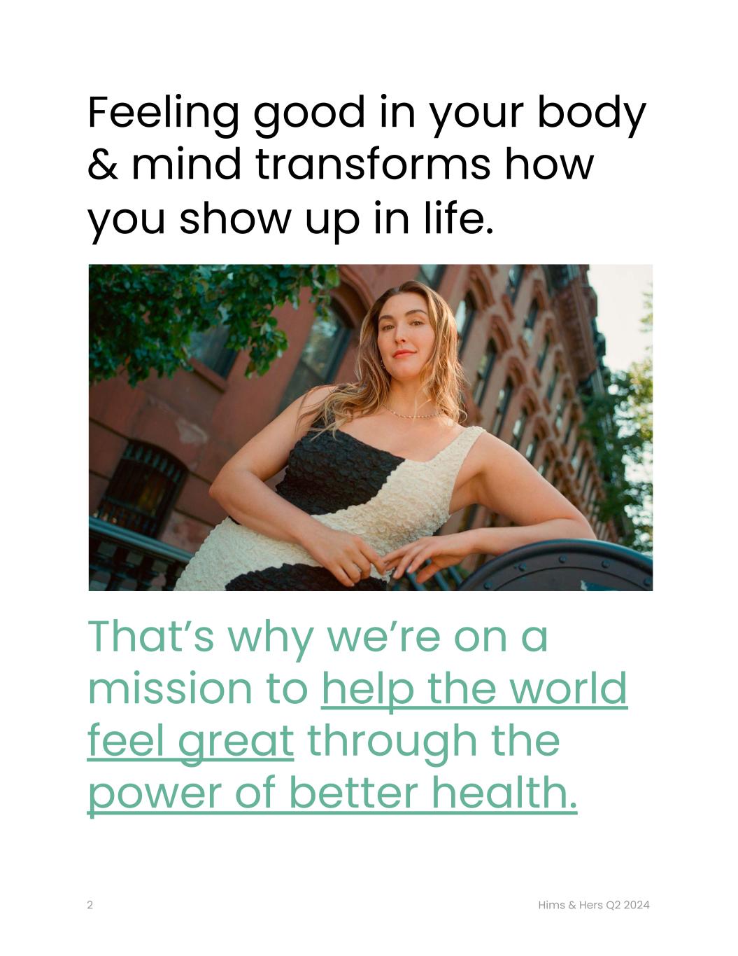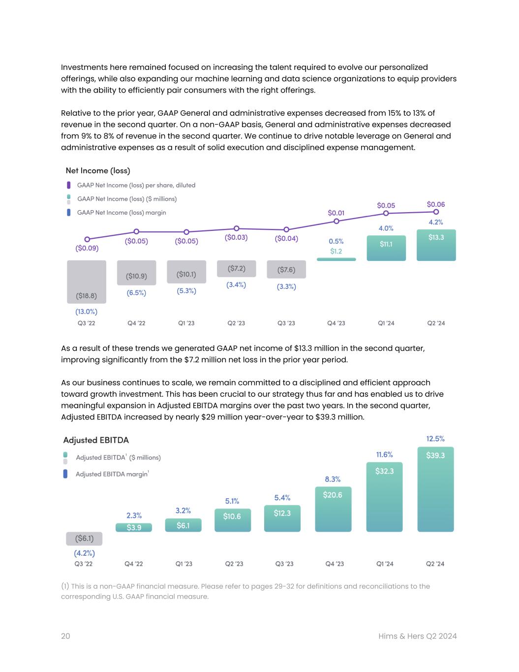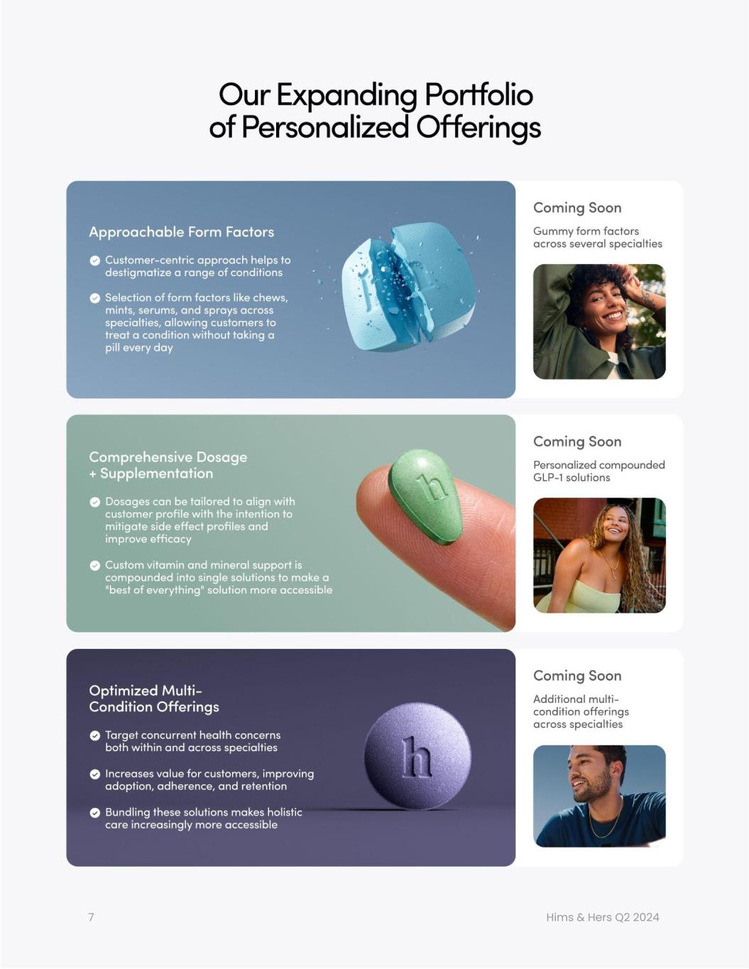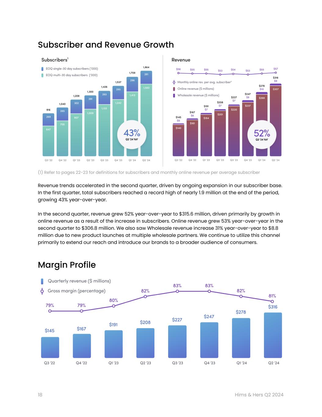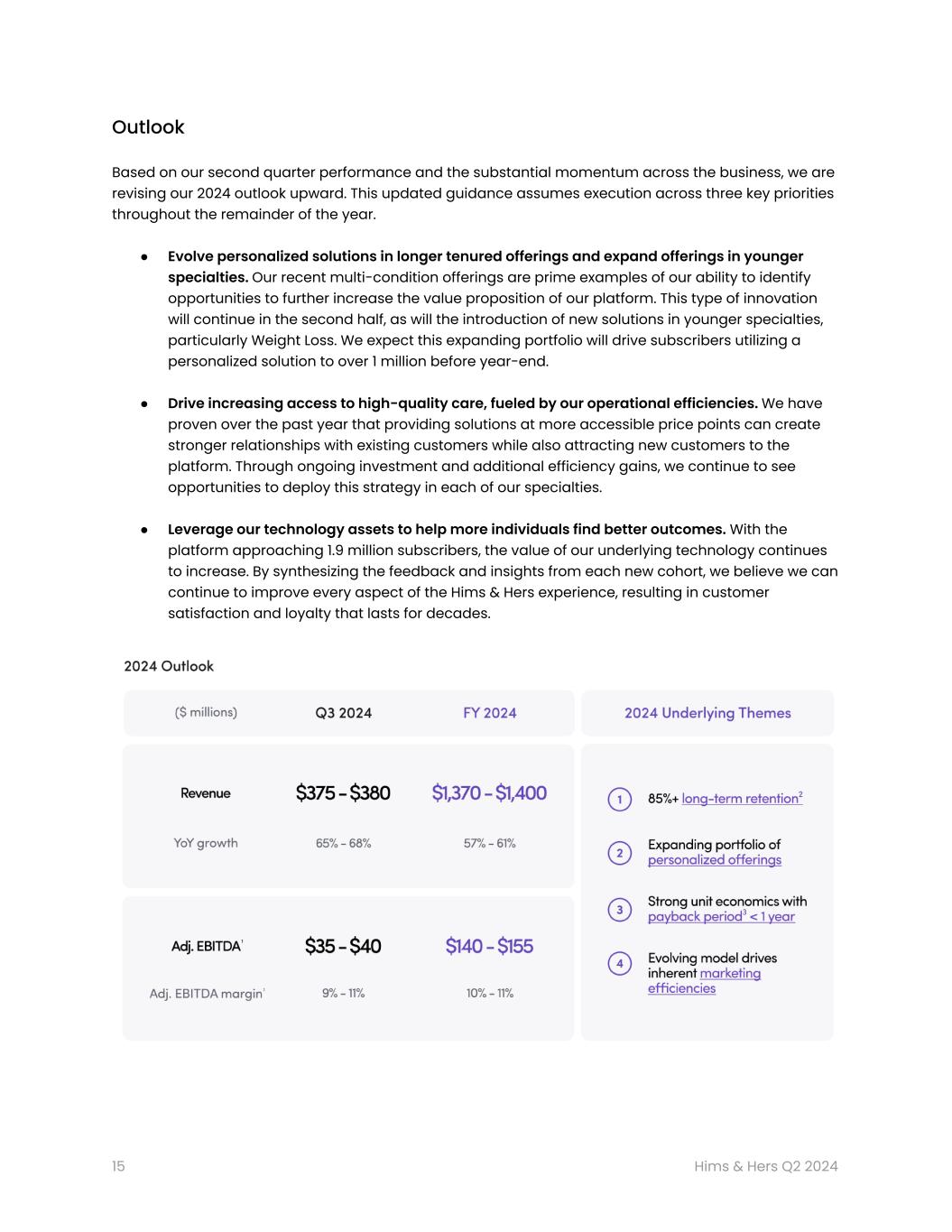 2024年第二季度致股东的信我们第二季度的业绩反映了整个业务的持续势头,使我们能够在规模不断扩大的情况下实现强劲增长,因为我们进一步推进我们的使命,即通过更好的健康力量帮助世界感到伟大。本季度,我们看到收入显着加速,调整后EBITDA利润率同步扩大。这一成功说明了我们战略的力量,该战略以具有吸引力的价格提供了获得高质量、个性化护理的机会。从历史上看,只有社会中最有特权的阶层才能获得这些解决方案和能力。我们认为,医疗保健正在经历一个转型期,因为消费者开始期待技术在他们生活的其他领域释放出的许多相同好处。这些包括透明的定价、便利、速度和负担得起的解决方案。我们的基础设施从一开始就以这些元素为中心,我们很高兴看到我们的消费者基础随着我们在整个平台上拓宽专业和能力而增长。尽管拥有接近200万订户的用户基础,我们相信我们仍处于这一旅程的早期阶段。缺乏信息、具有挑战性的副作用以及获得及时护理等障碍因素阻碍了美国超过1亿人在我们所服务的专业领域获得甚至寻求治疗。我们有信心,我们可以为社会释放巨大的价值,因为我们继续通过更好的健康的力量帮助更多的人感到伟大。我们各专业的表现令人难以置信的强大我们的拓宽能力让我们有信心在年初制定一个雄心勃勃的目标:让我们的每一个专业——性健康、心理健康、男性和女性皮肤科以及减肥——在2025年实现至少1亿美元的收入。我们迄今为止的执行正在为我们实现或超过这一宏伟目标的能力注入更大的信心。我们预计,最近在我们的平台上推出的GLP-1注射液的准入将增加这一已经引人注目的轨迹。与我们投资组合中过去的其他创新类似,这一新增有助于推动收入加速增长,与第一季度相比,综合收入同比增长加快了6个百分点,达到52%。我们现有产品的实力也得到了充分展示,不包括GLP-1发布的贡献,本季度的收入超过了3亿美元,同比增长超过46%。我们的品牌继续建立信任,我们相信以提供以可承受的价格获得高质量和创新的个性化解决方案而日益为人所知。这就产生了两个好处。首先是我们最长的终身专业的持续强劲增长。第二个是我们扩展较新专业的能力有意义的加速。自2017年推出该业务以来,我们通常在18-24个月内看到新的专业接近10万名订阅用户。在减肥方面,我们仅用了七个多月就超越了这一指标,这是一个了不起的开端,我们认为这突显了我们提升新专业的能力,以及对这些解决方案的巨大需求。4他和她2024年第二季度