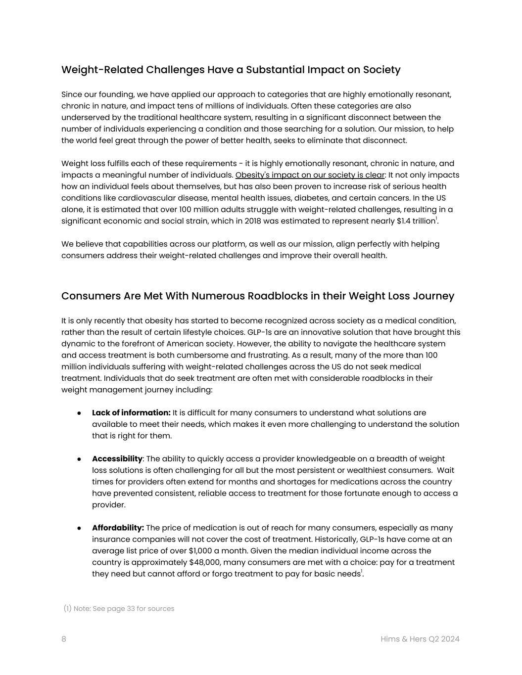 与体重相关的挑战对社会产生了实质性影响自我们成立以来,我们将我们的方法应用于具有高度情感共鸣、慢性性质、并影响数千万个人的类别。通常,这些类别也没有得到传统医疗保健系统的充分服务,导致出现疾病的人数与寻求解决方案的人数之间存在显着脱节。我们的使命,通过更好的健康的力量帮助世界感到伟大,寻求消除这种脱节。减肥满足了这些要求中的每一个——它在情感上具有高度的共鸣性、长期性,并影响了相当多的个体。肥胖对我们社会的影响是显而易见的:它不仅会影响个人对自己的感受,还会被证明会增加患严重健康状况的风险,如心血管疾病、心理健康问题、糖尿病和某些癌症。据估计,仅在美国,就有超过1亿成年人在与体重相关的挑战中苦苦挣扎,造成了严重的经济和社会压力,2018年的经济和社会压力估计近1.4万亿美元1。我们相信,我们整个平台的能力,以及我们的使命,与帮助消费者应对与体重相关的挑战并改善他们的整体健康状况完全一致。消费者在减肥之旅中遇到了无数障碍直到最近,肥胖才开始被全社会公认为一种医疗状况,而不是某些生活方式选择的结果。GLP-1是一种创新的解决方案,将这种动态带到了美国社会的最前沿。然而,驾驭医疗保健系统和获得治疗的能力既繁琐又令人沮丧。因此,美国各地因体重相关挑战而遭受痛苦的1亿多人中,有许多人没有就医。确实寻求治疗的个人在他们的体重管理之旅中经常会遇到相当大的障碍,包括:●缺乏信息:许多消费者很难理解有哪些解决方案可以满足他们的需求,这使得理解适合他们的解决方案变得更加具有挑战性。●可访问性:快速访问对广泛的减肥解决方案有知识的供应商的能力,对于除了最顽固或最富有的消费者之外的所有人来说,通常都具有挑战性。提供者的等待时间通常会延长数月,全国各地的药物短缺阻碍了那些有幸获得提供者的人持续、可靠地获得治疗。●可负担性:药品价格对于很多消费者来说是遥不可及的,尤其是很多保险公司不会承担治疗费用。从历史上看,GLP-1的平均标价每月超过1000美元。鉴于全国个人收入中位数约为4.8万美元,许多消费者面临着一个选择:为他们需要的治疗付费,但负担不起或放弃治疗来支付基本需求1。(1)注:来源见第33页8 HIMS & HER2024 Q2