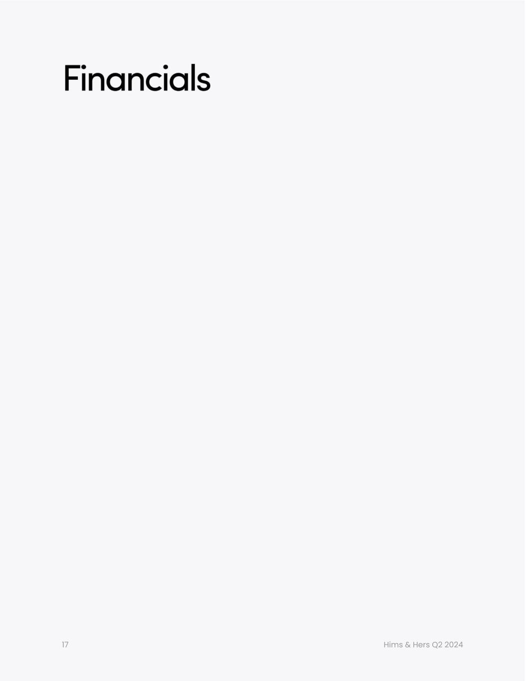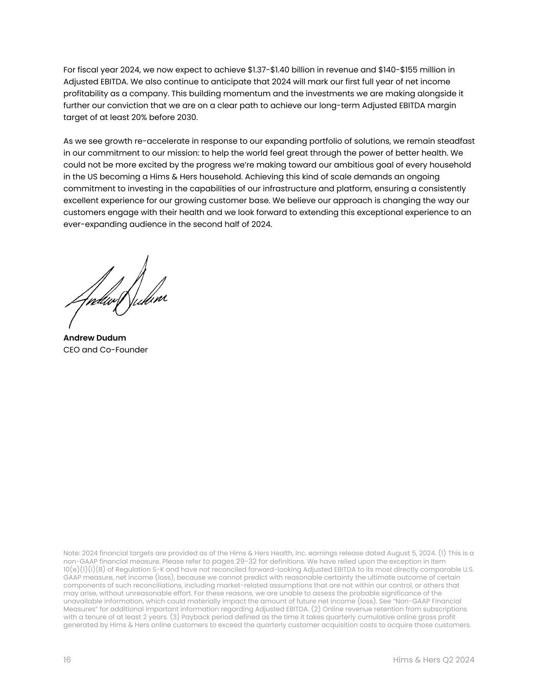 对于2024财年,我们现在预计将实现13.7-14.0亿美元的收入和1.40-1.55亿美元的调整后EBITDA。我们还继续预计,2024年将是我们作为一家公司实现净收入盈利的第一个完整年度。这种建立势头以及我们与之一起进行的投资进一步证明了我们的信念,即我们正走在一条明确的道路上,以在2030年之前实现至少20%的长期调整后EBITDA利润率目标。随着我们看到增长因应我们不断扩大的解决方案组合而重新加速,我们仍然坚定地致力于我们的使命:通过更好的健康的力量帮助世界感到伟大。我们正在朝着美国每个家庭都成为HIMS & Hers家庭的宏伟目标取得进展,我们对此感到无比兴奋。实现这种规模需要持续致力于投资于我们的基础设施和平台的能力,确保为我们不断增长的客户群提供始终如一的卓越体验。我们相信,我们的方法正在改变我们的客户与他们的健康互动的方式,我们期待在2024年下半年将这种非凡的体验扩展到不断扩大的受众。Andrew Dudum首席执行官兼联合创始人注:2024年的财务目标是截至2024年8月5日发布的Hims & Hers Health健康公司收益报告中提供的。(1)这是一个非GAAP财务指标。有关定义,请参阅第29-32页。我们依赖S-K条例第10(e)(1)(i)(b)项中的例外情况,没有将前瞻性调整后EBITDA与其最直接可比的美国公认会计原则衡量标准——净收入(亏损)进行核对,因为我们无法合理确定地预测此类核对的某些组成部分的最终结果,包括不在我们控制范围内的市场相关假设,或可能出现的其他假设,而无需做出不合理的努力。由于这些原因,我们无法评估无法获得的信息的可能重要性,这可能会对未来净收入(亏损)的金额产生重大影响。有关调整后EBITDA的更多重要信息,请参见“非GAAP财务指标”。(2)任期至少2年的订阅在线收入留存。(3)投资回收期定义为HIMS & Hers线上客户产生的季度累计线上毛利超过季度获客成本获得这些客户所需的时间。16 HIMS & HERS 2024年第二季度