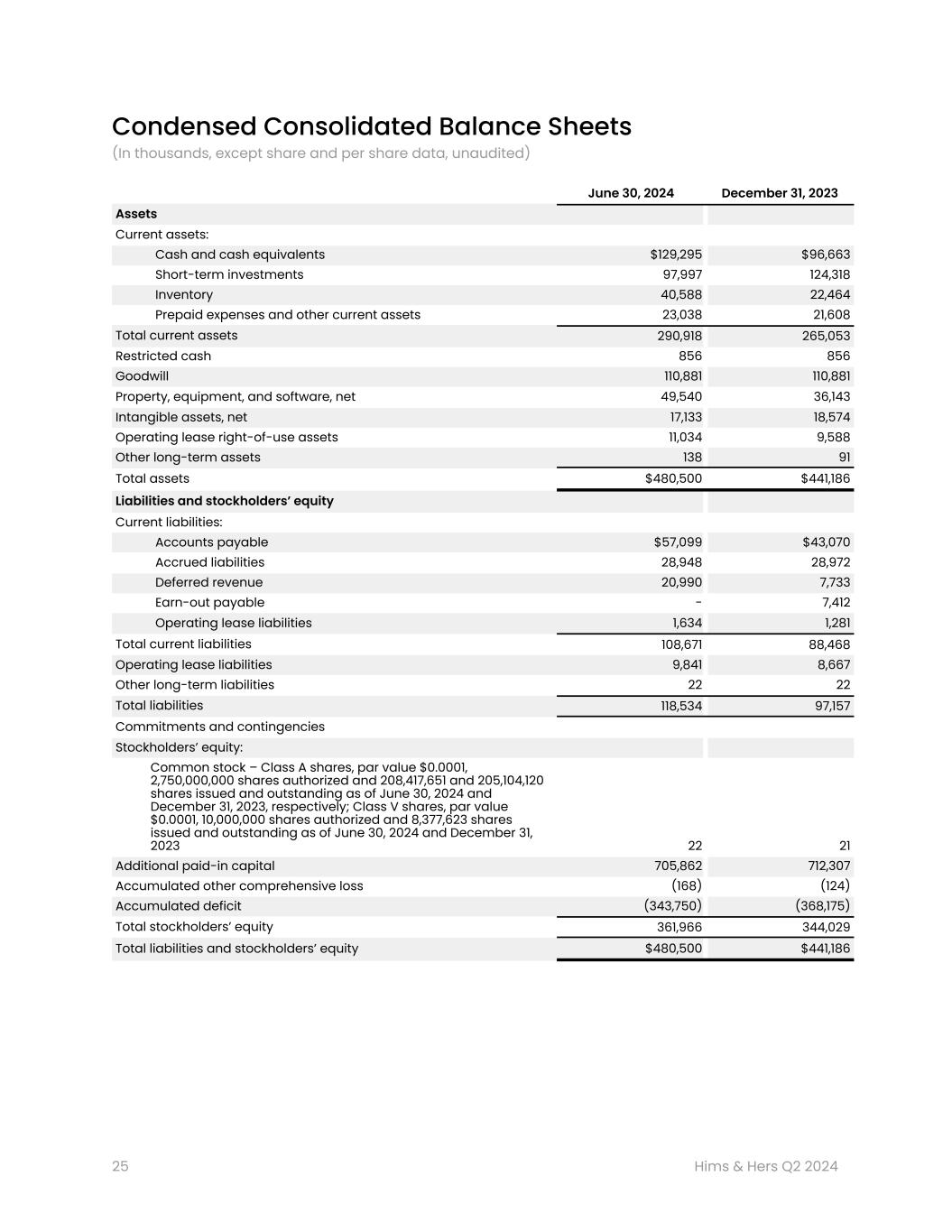 简明合并资产负债表(单位:千,除股份和每股数据外,未经审计)2024年6月30日2023年12月31日资产流动资产:现金和现金等价物129,295美元96,663美元短期投资97,997124,318存货40,58822,464预付费用和其他流动资产23,03821,608流动资产总额290,918265,053受限制现金856856商誉110,881110,881财产、设备、软件净额49,54036,143无形资产,净额17,13318,574经营租赁使用权资产11,0349,588其他长期资产13891总资产480,500美元441,186美元负债和股东权益流动负债:应付账款57,099美元43,070美元应计负债28,94828,972递延收入20,9907,733应付盈余-7,412经营租赁负债1,6341,281流动负债总额108,67188,468经营租赁负债9,8418,667其他长期负债2222负债总额118,53497,157承诺和或有事项股东权益:普通股– A类股,面值0.0001美元,已授权2,750,000,000股,截至2024年6月30日和2023年12月31日已发行和流通股分别为208,417,651和205,104,120股,分别;V类股份,面值0.0001美元,截至2024年6月30日和2023年12月31日已授权10,000,000股,已发行和流通在外的股份8,377,623股2221 额外实收资本 705,862712,307累计其他综合亏损(168)(124)累计亏损(343,750)(368,175)股东权益总额361,966344,029负债和股东权益总额480,500美元441,18625 HIMS & HERS Q2 2024