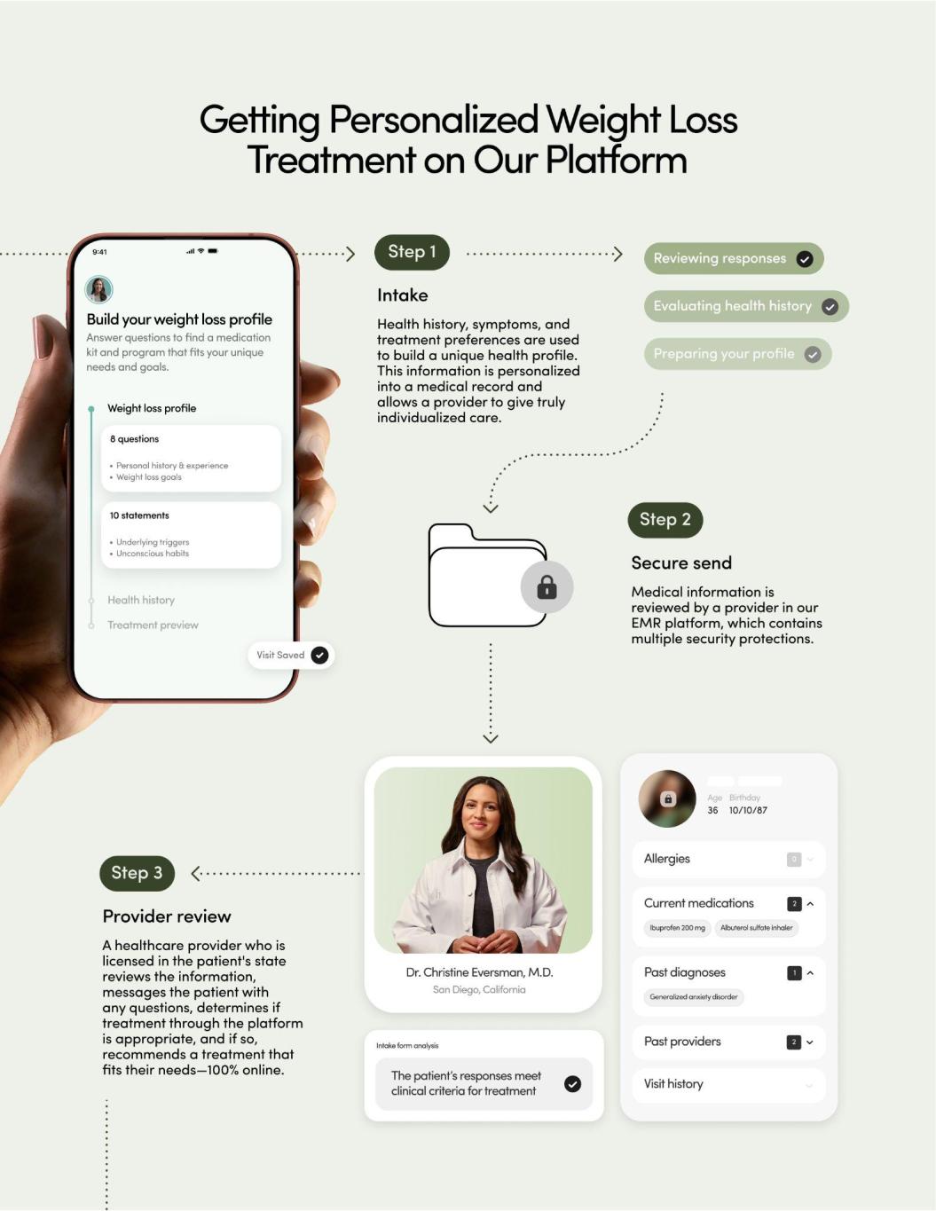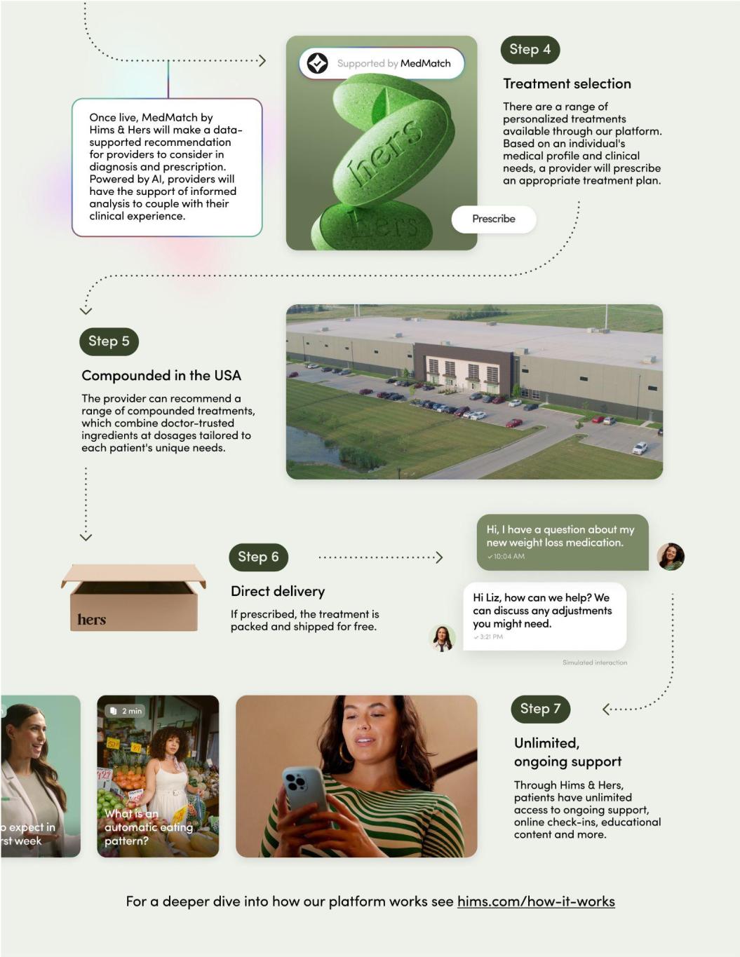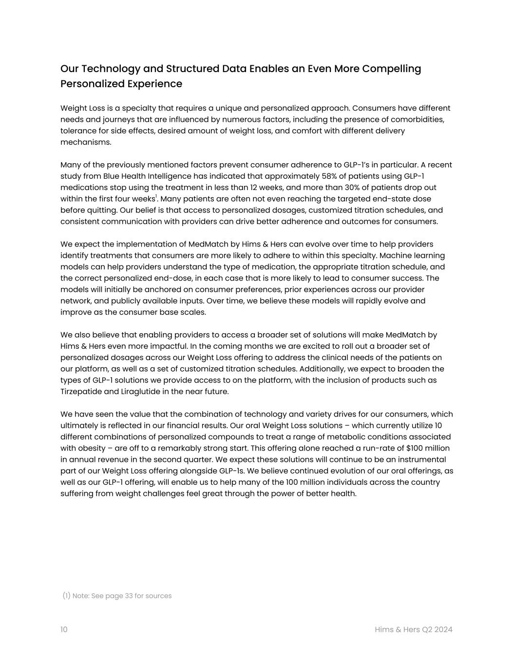 我们的技术和结构化数据可实现更令人信服的个性化体验减肥是一项需要独特和个性化方法的专业。消费者有不同的需求和旅程,这些需求和旅程受到多种因素的影响,包括是否存在合并症、对副作用的耐受性、所需的减肥量以及对不同交付机制的舒适度。前面提到的许多因素尤其阻碍了消费者对GLP-1的坚持。Blue Health Intelligence最近的一项研究表明,大约58%的使用GLP-1药物的患者在不到12周的时间内停止使用该治疗,超过30%的患者在前四周内退出1。许多患者在戒烟前往往甚至达不到目标终点状态剂量。我们的信念是,获得个性化剂量、定制的滴定时间表以及与供应商的一致沟通可以为消费者带来更好的依从性和结果。我们预计,HIMS & Hers对MedMatch的实施可以随着时间的推移而发展,以帮助提供者确定消费者更有可能在该专业范围内坚持的治疗方法。机器学习模型可以帮助提供者了解药物类型、适当的滴定时间表以及正确的个性化最终剂量,在每种情况下更有可能导致消费者成功。这些模型最初将基于消费者的偏好、我们供应商网络中的先前体验以及公开可用的输入。随着时间的推移,我们相信这些模式将随着消费者基础的扩大而迅速发展和改善。我们还认为,使供应商能够访问更广泛的解决方案集,将使HIMS & Hers的MedMatch更具影响力。在接下来的几个月里,我们很高兴在我们的减肥产品中推出一套更广泛的个性化剂量,以满足我们平台上患者的临床需求,以及一套定制的滴定时间表。此外,我们预计将扩大我们在平台上提供接入的GLP-1解决方案的类型,在不久的将来包括Tirzepatide和Liraglutide等产品。我们看到了技术和品种的结合为我们的消费者带来的价值,这最终反映在我们的财务业绩中。我们的口服减肥解决方案——目前利用10种不同的个性化化合物组合来治疗与肥胖相关的一系列代谢疾病——开局非常强劲。仅这一项发行就在第二季度达到了1亿美元的年营收运行率。我们预计这些解决方案将继续与GLP-1一起成为我们减肥产品的重要组成部分。我们相信,我们口服产品的持续发展,以及我们的GLP-1产品,将使我们能够通过改善健康的力量,帮助全国1亿遭受体重挑战的人中的许多人感觉很棒。(1)注:资料来源见第33页10 HIMS & HERS Q2 2024