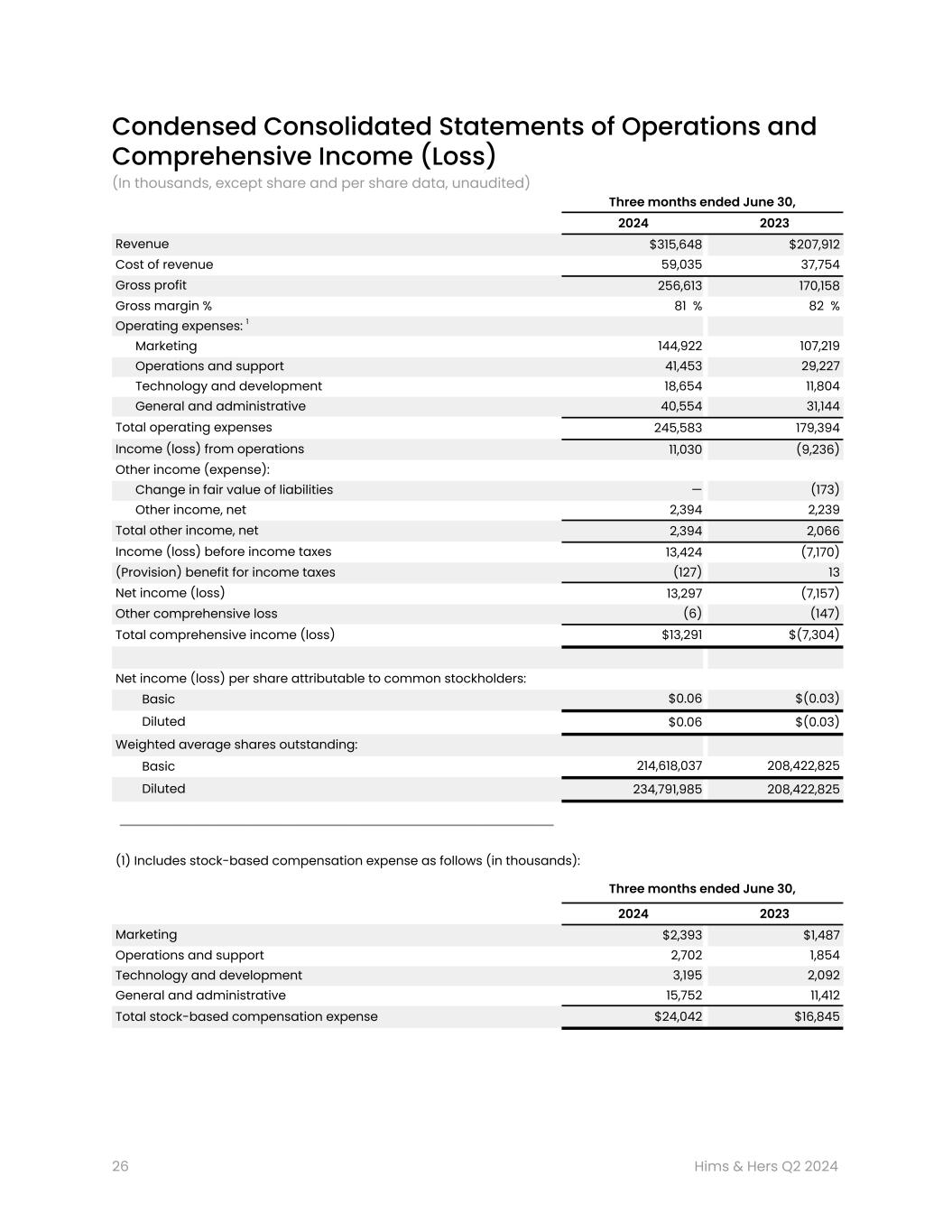 简明合并经营报表及综合收益(亏损)(单位:千,股份及每股数据除外,未经审计)截至2024年6月30日止三个月2023年收入315,648美元207,912美元收入成本59,03537,754毛利润256,613170,158毛利率% 81% 82%营业费用:1营销144,922107,219运营及支持41,45329,227技术及发展18,65411,804一般及行政40,55431,144总营业费用245,583179,394营业收入(亏损)11,030(9,236)其他收入(费用):负债公允价值变动—(173)其他收入净额2,3942,239其他收入总额,净收入2,3942,066所得税前收入(亏损)13,424(7,170)(拨备)所得税收益(127)13净收入(亏损)13,297(7,157)其他综合亏损(6)(147)综合收益总额(亏损)$ 13,291 $(7,304)归属于普通股股东的每股净收益(亏损):基本$ 0.06 $(0.03)稀释后$ 0.06 $(0.03)加权平均流通股:基本214,618,037208,422,825稀释后234,791,985208,422,825(1)包括以下基于股票的补偿费用(单位:千):截至6月30日止三个月,20242023营销2,393美元1,487美元运营和支持2,7021,854技术和发展3,1952,092一般和行政15,75211,412基于股票的补偿费用总额24,042美元16,84526 HIMS & Hers 2024年第二季度