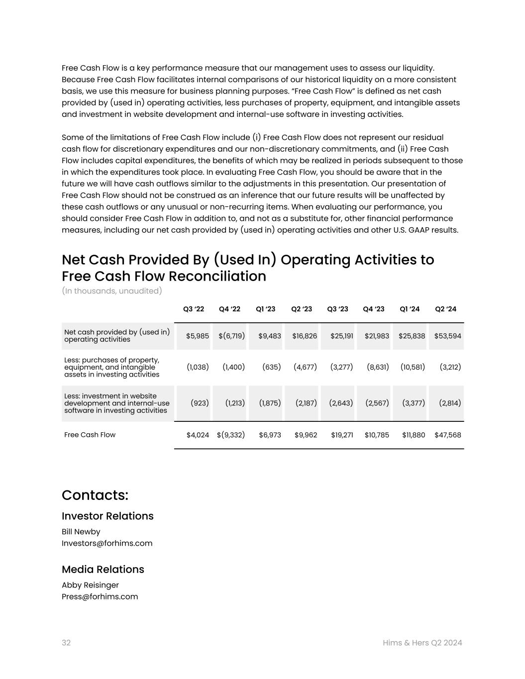 自由现金流是我们管理层用来评估流动性的关键绩效衡量指标。因为自由现金流有助于在更一致的基础上对我们的历史流动性进行内部比较,我们将这一衡量标准用于业务规划目的。“自由现金流”定义为经营活动提供(用于)的净现金,减去购买财产、设备和无形资产以及投资活动中网站开发和内部使用软件的投资。自由现金流的一些限制包括(i)自由现金流不代表我们用于可自由支配支出和非可自由支配承诺的剩余现金流,以及(ii)自由现金流包括资本支出,其收益可能会在支出发生的时期之后的时期实现。在评估自由现金流时,您应该意识到,未来我们将出现与本演示文稿中的调整类似的现金流出。我们对自由现金流的表述不应被解释为推断我们未来的业绩将不受这些现金流出或任何不寻常或非经常性项目的影响。在评估我们的业绩时,您应该考虑自由现金流是对其他财务业绩指标的补充,而不是作为替代,包括我们由(用于)经营活动和其他美国公认会计原则结果提供的净现金。经营活动提供(用于)自由现金流调节的现金净额(以千计,未经审计)Q3‘22 Q4’22 Q1‘23 Q2’23 Q3‘23 Q4’23 Q1‘24 Q2’24经营活动提供(用于)的现金净额$ 5,985 $(6,719)$ 9,483 $ 16,826 $ 25,191 $ 21,983 $ 25,838 $ 53,594减:购买财产、设备、和投资活动中的无形资产(1,038)(1,400)(635)(4,677)(3,277)(8,631)(10,581)(3,212)减:投资活动中的网站开发和内部使用软件投资(923)(1,213)(1,875)(2,187)(2,643)(2,567)(3,377)(2,814)自由现金流$ 4,024 $(9,332)$ 6,973 $ 9,962 $ 19,271 $ 10,785 $ 11,880 $ 47,568联系人:投资者关系Bill Newby Investors@forhims.com媒体关系Abby Reisinger Press@forhims.com 32 Hims & Hers Q2 2024
