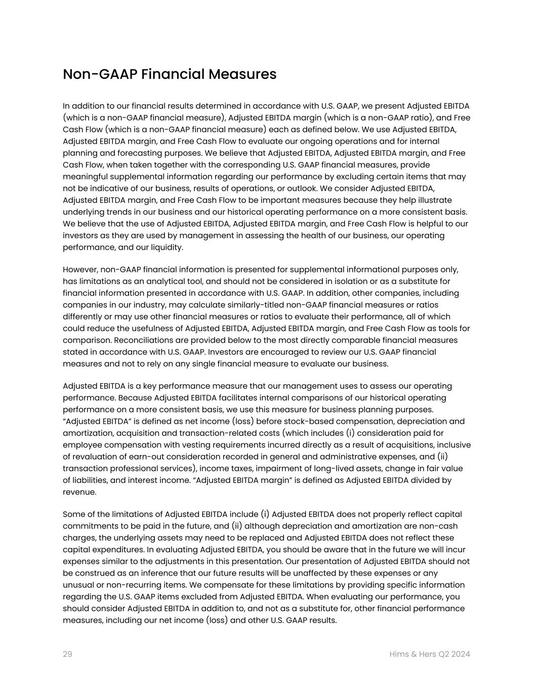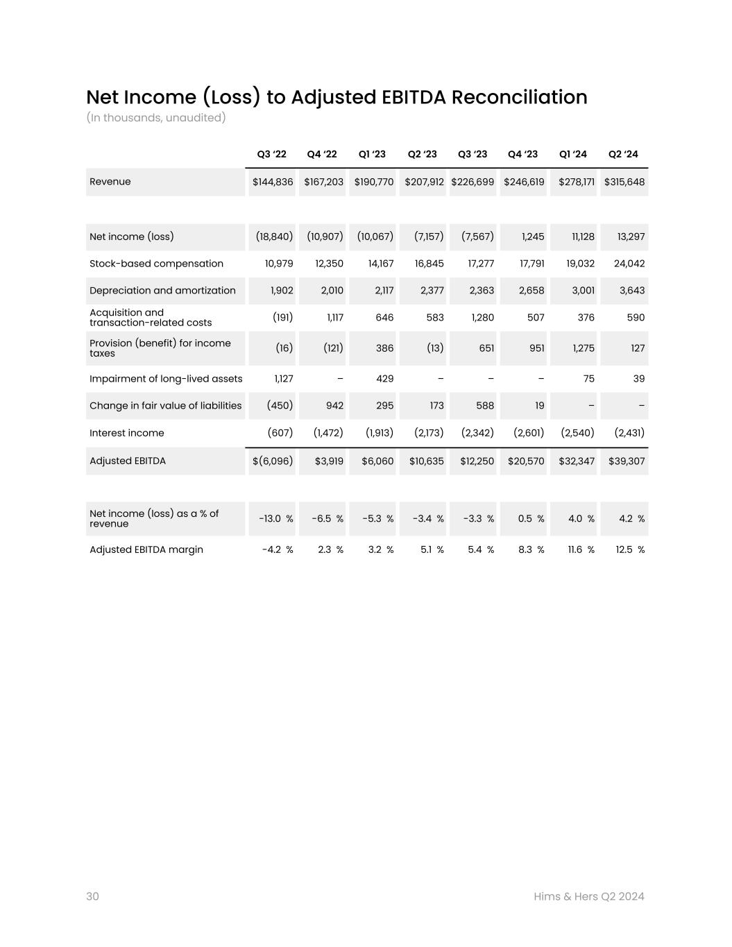 非GAAP财务指标除了我们根据美国公认会计原则确定的财务业绩外,我们提出调整后EBITDA(这是一种非GAAP财务指标)、调整后EBITDA利润率(这是一种非GAAP比率)和自由现金流(这是一种非GAAP财务指标),定义如下。我们使用调整后的EBITDA、调整后的EBITDA利润率和自由现金流来评估我们的持续运营,并用于内部规划和预测目的。我们认为,调整后的EBITDA、调整后的EBITDA利润率和自由现金流,当与相应的美国公认会计原则财务指标一起考虑时,通过排除某些可能不代表我们的业务、经营业绩或前景的项目,为我们的业绩提供了有意义的补充信息。我们认为调整后EBITDA、调整后EBITDA利润率和自由现金流是重要的衡量标准,因为它们有助于在更一致的基础上说明我们业务的基本趋势和我们的历史经营业绩。我们认为,使用调整后EBITDA、调整后EBITDA利润率和自由现金流对我们的投资者有帮助,因为管理层使用它们来评估我们的业务健康状况、我们的经营业绩和我们的流动性。然而,非GAAP财务信息仅用于补充信息目的,作为一种分析工具存在局限性,不应孤立地考虑或替代根据美国GAAP提供的财务信息。此外,其他公司,包括我们行业的公司,可能会以不同的方式计算类似标题的非GAAP财务指标或比率,或者可能会使用其他财务指标或比率来评估其业绩,所有这些都可能降低调整后EBITDA、调整后EBITDA利润率和自由现金流作为比较工具的有用性。下文提供了根据美国公认会计原则规定的最直接可比财务指标的对账情况。我们鼓励投资者审查我们的美国公认会计准则财务指标,不要依赖任何单一的财务指标来评估我们的业务。调整后EBITDA是我们的管理层用来评估我们的经营业绩的关键绩效衡量标准。由于调整后的EBITDA有助于在更一致的基础上对我们的历史经营业绩进行内部比较,我们将这一衡量标准用于业务规划目的。“调整后EBITDA”定义为扣除基于股票的补偿、折旧和摊销、收购和交易相关成本(其中包括(i)为直接因收购而产生的具有归属要求的员工薪酬支付的对价,包括一般和管理费用中记录的盈利对价的重估,以及(ii)交易专业服务)、所得税、长期资产减值、负债公允价值变动和利息收入之前的净收入(亏损)。“调整后EBITDA利润率”定义为调整后EBITDA除以收入。调整后EBITDA的一些限制包括(i)调整后EBITDA未能正确反映未来将支付的资本承诺,以及(ii)尽管折旧和摊销是非现金费用,但基础资产可能需要更换,调整后EBITDA并未反映这些资本支出。在评估调整后的EBITDA时,您应该知道,未来我们将产生与本演示文稿中的调整类似的费用。我们对调整后EBITDA的表述不应被解释为推断我们未来的业绩将不受这些费用或任何不寻常或非经常性项目的影响。我们通过提供有关不包括在调整后EBITDA中的美国公认会计原则项目的具体信息来弥补这些限制。在评估我们的业绩时,您应该考虑将调整后的EBITDA作为其他财务业绩指标的补充,而不是作为替代,包括我们的净收入(亏损)和其他美国公认会计原则结果。29 HIMS & HERS 2024年第二季度