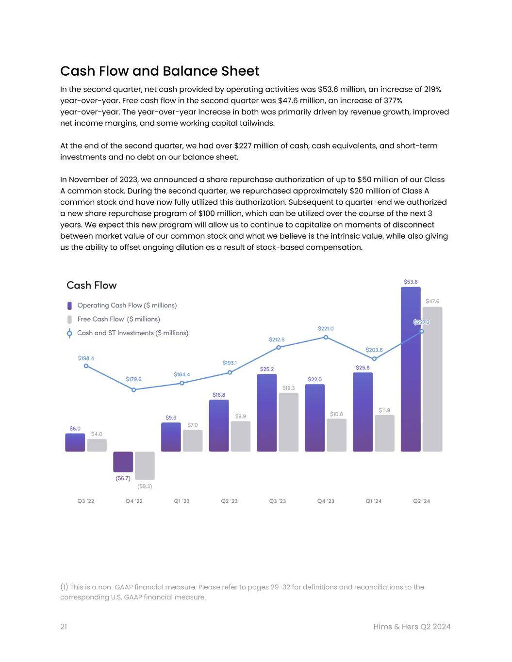 现金流和资产负债表,第二季度经营活动提供的净现金为5360万美元,同比增长219%。第二季度自由现金流为4760万美元,同比增长377%。两者的同比增长主要是由收入增长、净利润率改善以及一些营运资本顺风推动的。在第二季度末,我们拥有超过2.27亿美元的现金、现金等价物和短期投资,我们的资产负债表上没有债务。2023年11月,我们宣布了高达5000万美元的A类普通股的股票回购授权。在第二季度,我们回购了大约2000万美元的A类普通股,现在已经充分利用了这一授权。在季度末之后,我们授权了一项1亿美元的新股票回购计划,该计划可在未来3年内使用。我们预计,这一新计划将使我们能够继续利用我们普通股的市场价值与我们认为的内在价值之间脱节的时刻,同时也使我们能够抵消由于基于股票的薪酬而导致的持续稀释。(1)这是一个非GAAP财务指标。请参阅第29-32页,了解与相应的美国公认会计原则财务指标的定义和对账。21 HIMS & HERS 2024年第二季度