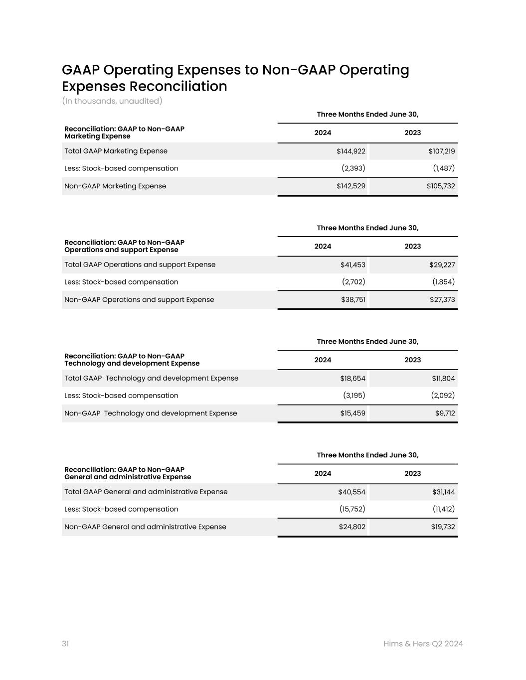 GAAP运营费用与非GAAP运营费用的对账(以千计,未经审计)截至6月30日的三个月,对账:GAAP与非GAAP营销费用20242023 GAAP营销费用总额144,922美元107,219美元减:基于股票的薪酬(2,393)(1,487)非GAAP营销费用142,529美元105,732美元截至6月30日的三个月,对账:GAAP与非GAAP运营和支持费用20242023 GAAP运营和支持费用总额41,453美元29,227美元减:基于股票的薪酬(2,702)(1,854)非GAAP运营和支持费用38,751美元27,373美元截至6月30日的三个月,对账:GAAP与非GAAP技术和开发费用20242023总GAAP技术和开发费用18654美元11804美元减:股票薪酬(3,195)(2,092)非GAAP技术和开发费用15,459美元9,712美元截至6月30日的三个月,对账:GAAP与非GAAP一般和行政费用20242023总GAAP一般和行政费用40,554美元31,144美元减:股票薪酬(15,752)(11,412)非GAAP一般和行政费用24,802美元19,73231 HIMS & HERS Q2 2024