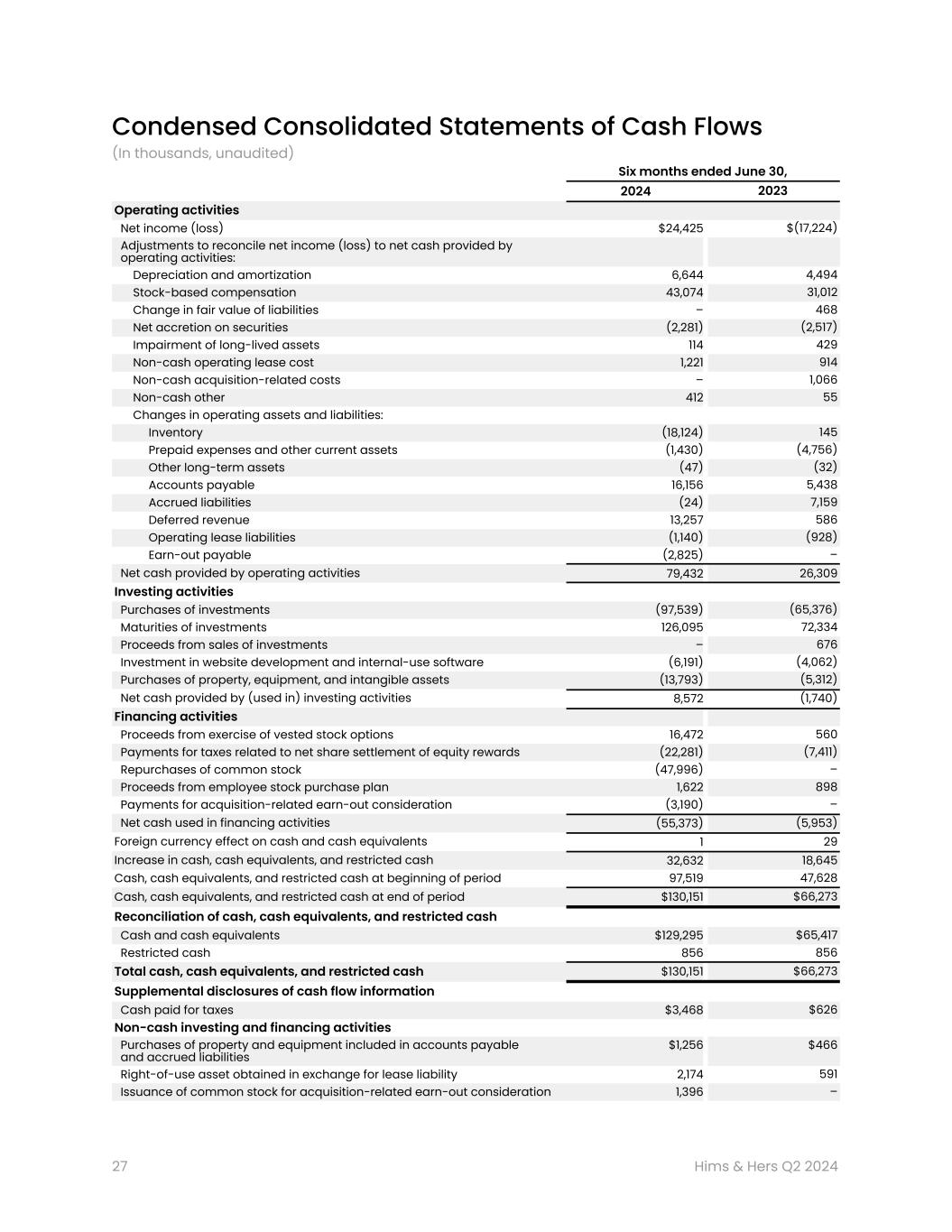 简明合并现金流量表(单位:千,未经审计)截至6月30日的六个月,20242023经营活动净收入(亏损)$ 24,425 $(17,224)调整净收入(亏损)与经营活动提供的净现金:折旧和摊销6,6444,494基于股票的补偿43,07431,012负债公允价值变动– 468证券净增值(2,281)(2,517)长期资产减值114429非现金经营租赁成本1,221914非现金购置相关成本– 1,066非现金其他41255经营资产和负债变动:存货(18,124)145预付费用及其他流动资产(1,430)(4,756)其他长期资产(47)(32)应付账款16,1565,438应计负债(24)7,159递延收入13,257586经营租赁负债(1,140)(928)应付盈余(2,825)–经营活动提供的现金净额79,43226,309投资活动购买投资(97,539)(65,376)投资到期126,09572,334出售投资收益– 676网站开发和内部使用软件投资(6,191)(4,062)购买物业、设备、和无形资产(13,793)(5,312)投资活动提供(用于)的现金净额8,572(1,740)融资活动行使既得股票期权所得款项16,472560支付与股权奖励的股份净额结算相关的税款(22,281)(7,411)回购普通股(47,996)–员工股票购买计划所得款项1,622898支付与收购相关的盈利对价(3,190)–筹资活动使用的现金净额(55,373)(5,953)对现金和现金等价物的外币影响129现金、现金等价物和限制性现金增加32,63218,645现金、现金等价物,和期初受限制现金97,51947,628现金、现金等价物和期末受限制现金130,151美元66,273现金、现金等价物和受限制现金现金及现金等价物的调节129,295美元65,417受限制现金856856现金、现金等价物总额,和受限现金130,151美元66,273美元补充披露现金流信息支付的税款现金3,468美元626美元非现金投资和融资活动购买包括在应付账款和应计负债中的财产和设备1,256美元466美元获得的使用权资产以换取租赁负债2,174591发行普通股用于与收购相关的盈利对价1,396 – 27 HIMS & HERS Q2 2024