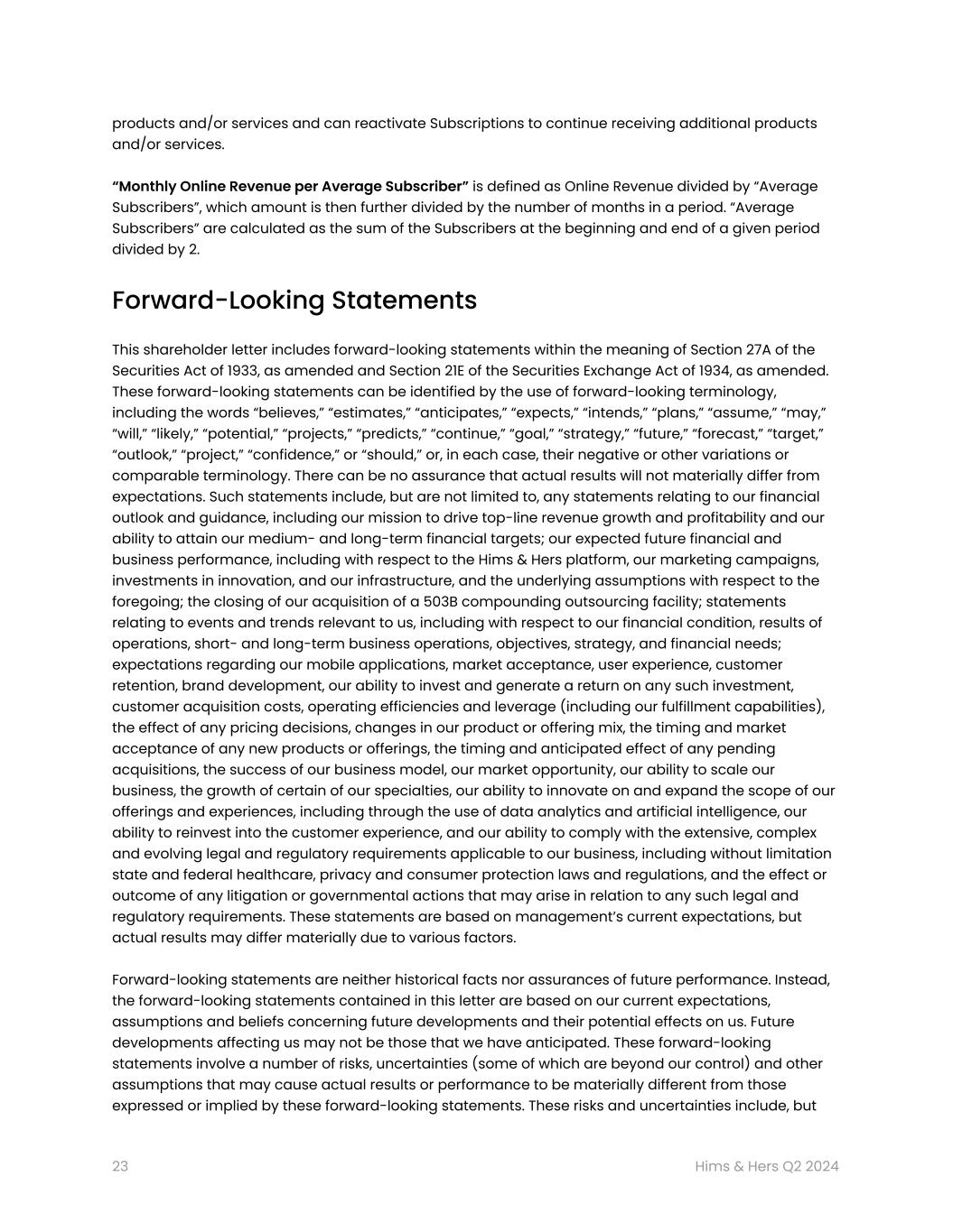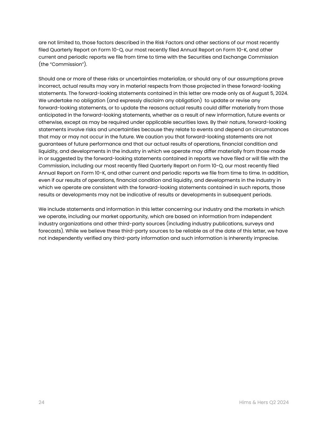 产品和/或服务,并可以重新激活订阅以继续接收额外的产品和/或服务。“每个平均订阅用户的每月在线收入”定义为在线收入除以“平均订阅用户”,然后将该金额进一步除以一个时期的月数。“平均订阅用户”的计算方法是给定期间开始和结束时的订阅用户的总和除以2。前瞻性陈述这封股东信包括经修订的1933年《证券法》第27A条和经修订的1934年《证券交易法》第21E条含义内的前瞻性陈述。这些前瞻性陈述可以通过使用前瞻性术语来识别,包括“相信”、“估计”、“预期”、“预期”、“打算”、“计划”、“假设”、“可能”、“将”、“可能”、“潜在”、“项目”、“预测”、“继续”、“目标”、“战略”、“未来”、“预测”、“目标”、“展望”、“项目”、“信心”或“应该”,或者在每种情况下,它们的负面或其他变体或类似术语。无法保证实际结果不会与预期产生重大差异。此类声明包括但不限于与我们的财务前景和指导有关的任何声明,包括我们推动收入增长和盈利能力的使命以及我们实现中长期财务目标的能力;我们预期的未来财务和业务表现,包括与HIMS & Hers平台、我们的营销活动、创新投资和我们的基础设施有关的表现,以及与上述相关的基本假设;我们完成对503B复合外包设施的收购;与与我们相关的事件和趋势有关的声明,包括关于我们的财务状况、运营结果、短期和长期业务运营、目标、战略和财务需求;对我们的移动应用程序、市场接受度、用户体验、客户保留、品牌发展、我们对任何此类投资的投资和产生回报的能力、客户获取成本、运营效率和杠杆(包括我们的履行能力)的期望、任何定价决策的影响、我们的产品或产品组合的变化、任何新产品或产品的时机和市场接受度、任何未决收购的时机和预期效果、我们的商业模式的成功、我们的市场机会,我们扩展业务的能力、我们某些专业的增长、我们对产品和体验进行创新和扩大范围的能力,包括通过使用数据分析和人工智能、我们对客户体验进行再投资的能力,以及我们遵守适用于我们业务的广泛、复杂和不断变化的法律和监管要求的能力,包括但不限于州和联邦医疗保健、隐私和消费者保护法律法规,以及与任何此类法律和监管要求相关的任何诉讼或政府行为的效果或结果。这些陈述是基于管理层目前的预期,但实际结果可能因各种因素而存在重大差异。前瞻性陈述既不是历史事实,也不是对未来业绩的保证。相反,这封信中包含的前瞻性陈述是基于我们目前对未来发展及其对我们的潜在影响的预期、假设和信念。影响我们的未来发展可能不是我们预期的那些。这些前瞻性陈述涉及许多风险、不确定性(其中一些超出我们的控制范围)和其他可能导致实际结果或业绩与这些前瞻性陈述明示或暗示的结果或业绩存在重大差异的假设。这些风险和不确定性包括,但23 HIMS & HERS Q2 2024