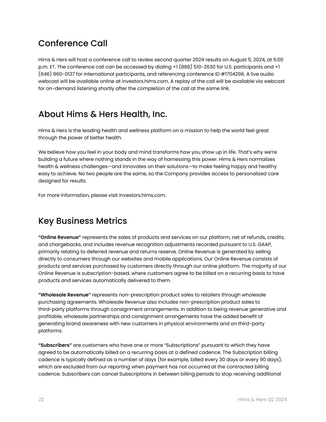 电话会议HIMS & Hers将于美国东部时间2024年8月5日下午5:00召开电话会议,审查2024年第二季度业绩。美国与会者可拨打+ 1(888)510-2630,国际与会者可拨打+ 1(646)960-0137,并参考会议ID # 1704296参加电话会议。将在Investors.hims.com上在线提供现场音频网络广播。通话结束后不久,将在同一链接上通过网络广播提供通话重播,供按需收听。关于Hims & Hers Health, Inc. HIMS & Hers是领先的健康和保健平台,其使命是通过更好的健康的力量帮助世界感到伟大。我们相信,你在身心中的感受会改变你在生活中的表现方式。这就是为什么我们正在建设一个没有任何东西阻碍利用这种力量的未来。HIMS & Hers将健康和保健挑战正常化——并在其解决方案上进行创新——以使感觉快乐和健康变得容易实现。没有两个人是相同的,因此该公司提供针对结果设计的个性化护理。欲了解更多信息,请访问investors.hims.com。关键业务指标“在线收入”代表我们平台上产品和服务的销售,扣除退款、贷记和退款,包括根据美国公认会计原则记录的收入确认调整,主要与递延收入和退货准备金有关。在线收入是通过我们的网站和移动应用程序直接向消费者销售而产生的。我们的线上收入包括客户直接通过我们的线上平台购买的产品和服务。我们的大部分在线收入是基于订阅的,客户同意定期计费,让产品和服务自动交付给他们。“批发收入”是指通过批发采购协议向零售商销售非处方产品。批发收入还包括通过寄售安排向第三方平台销售非处方产品。除了可以产生收入和盈利外,批发合作和寄售安排还具有在物理环境和第三方平台上与新客户产生品牌知名度的额外好处。“订阅者”是指有一个或多个“订阅”的客户,据此,他们同意以规定的节奏在经常性基础上自动计费。订阅计费节奏通常定义为几天(例如,每30天或每90天计费一次),当未按约定的计费节奏发生付款时,我们的报告不包括这些天数。订阅者可以在账期之间取消订阅,以停止接收额外的22 HIMS & HERS Q2 2024