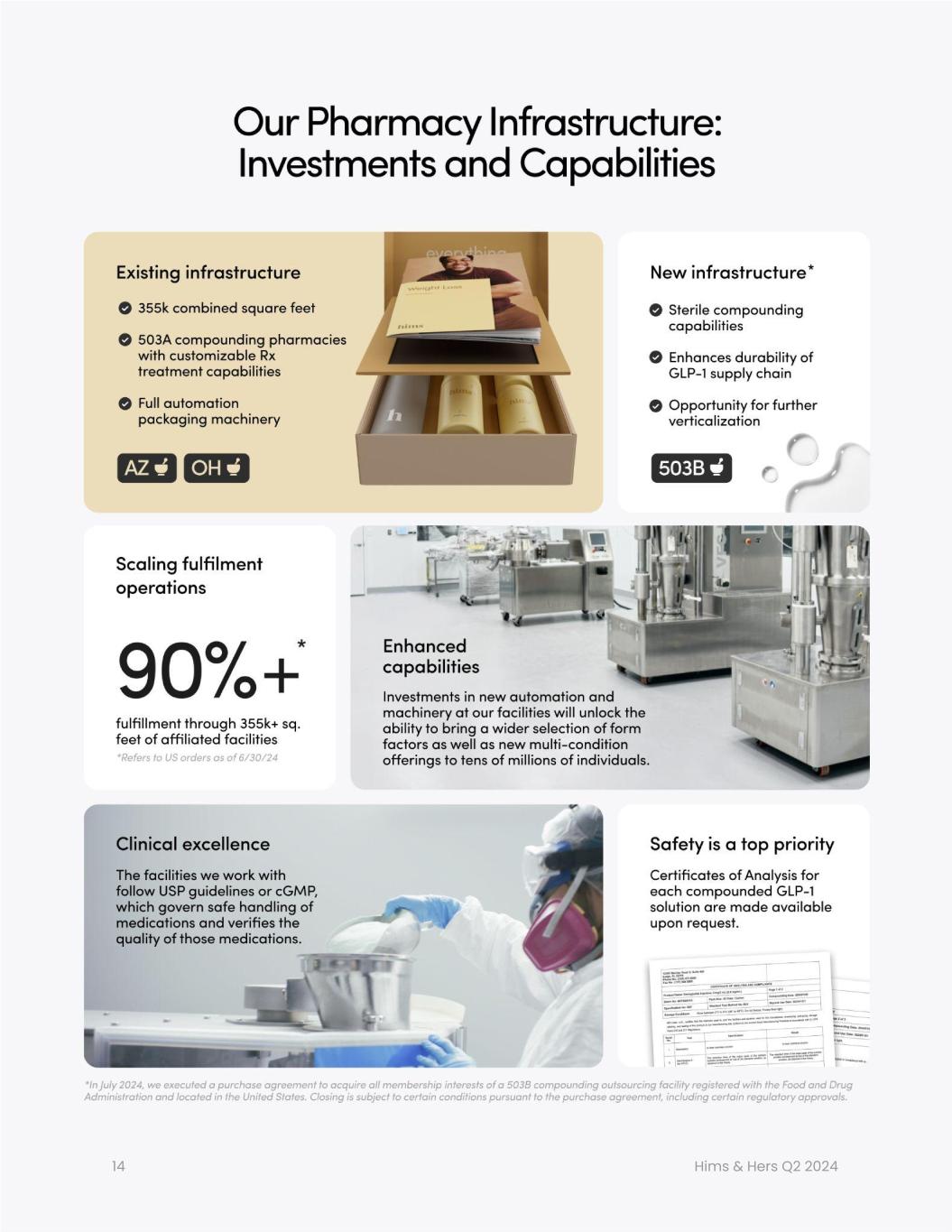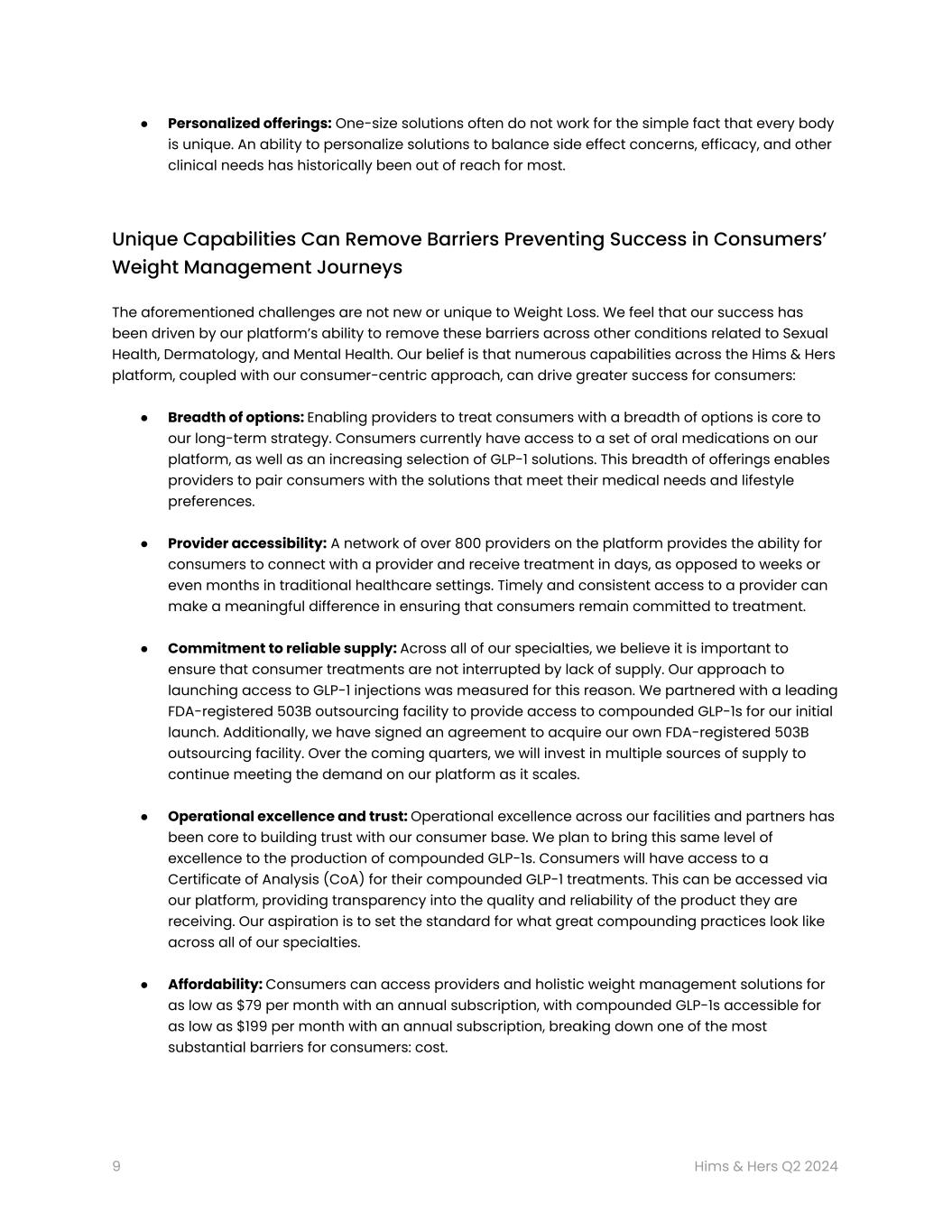 ●个性化产品:单一尺寸的解决方案通常不适用于每个身体都是独一无二的这一简单事实。个性化解决方案以平衡副作用问题、疗效和其他临床需求的能力历来对大多数人来说是遥不可及的。独特的能力可以消除阻碍消费者体重管理之旅取得成功的障碍。上述挑战对于减肥来说并不是新的或独有的。我们认为,我们的成功是由我们的平台在其他与性健康、皮肤病学和心理健康相关的情况下消除这些障碍的能力推动的。我们相信,HIMS & Hers平台上的众多能力,加上我们以消费者为中心的方法,可以为消费者带来更大的成功:●选择的广度:使供应商能够以广泛的选择对待消费者是我们长期战略的核心。消费者目前可以在我们的平台上获得一套口服药物,以及越来越多的GLP-1解决方案选择。这种广度的产品使供应商能够将消费者与满足其医疗需求和生活方式偏好的解决方案配对。●提供者无障碍:平台上由800多家提供者组成的网络为消费者提供了与提供者联系并在几天内接受治疗的能力,而不是在传统的医疗环境中的几周甚至几个月。及时和一致地接触提供者可以在确保消费者继续致力于治疗方面产生有意义的影响。●承诺可靠供应:在我们所有的专业中,我们认为确保消费者治疗不会因供应不足而中断是很重要的。出于这个原因,我们对启动GLP-1注射液准入的方法进行了衡量。我们与FDA注册的领先503B外包设施合作,为我们的首次推出提供复合GLP-1的准入。此外,我们还签署了收购我们自己的FDA注册的503B外包设施的协议。在接下来的几个季度中,我们将投资于多个供应来源,以在我们的平台扩大规模时继续满足需求。●卓越运营和信任:我们的设施和合作伙伴的卓越运营一直是与我们的消费者基础建立信任的核心。我们计划将同样水平的卓越带到复合GLP-1的生产中。消费者将可以获得其复合GLP-1治疗的分析证明(CoA)。这可以通过我们的平台访问,为他们收到的产品的质量和可靠性提供透明度。我们的愿望是为我们所有专业的伟大复合实践的样子设定标准。●可负担性:消费者可以通过年度订阅以每月低至79美元的价格获得供应商和整体体重管理解决方案,通过年度订阅以每月低至199美元的价格获得复合GLP-1,打破了消费者最大的障碍之一:成本。9 HIMS & HERS 2024年第二季度