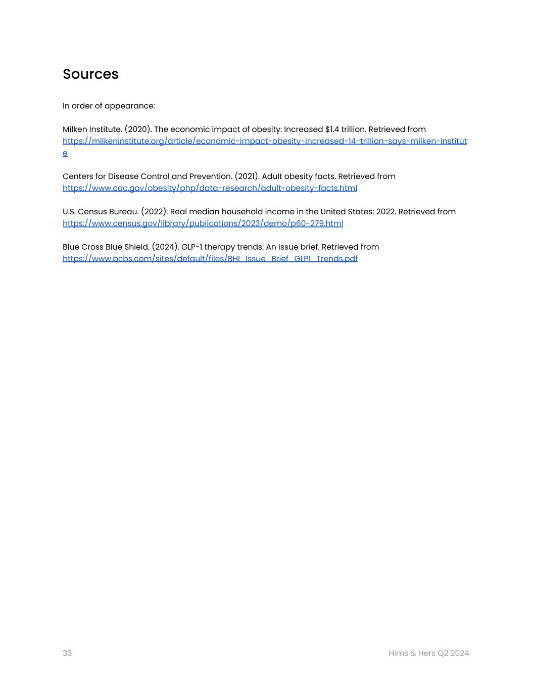 资料来源按出现顺序:米尔肯研究所。(2020).肥胖的经济影响:增加了1.4万亿美元。检索自https://milkeninstitute.org/article/economic-impact-obesity-increased-14-trillion-says-milken-institute e Centers for Disease Control and Prevention。(2021).成人肥胖事实。检索自https://www.cdc.gov/obesity/php/data-research/adult-obesity-facts.html美国人口普查局。(2022).美国实际家庭收入中位数:2022年。检索自https://www.census.gov/library/publications/2023/demo/p60-279.html蓝十字蓝盾。(2024).GLP-1治疗趋势:问题简介。检索自https://www.bcbs.com/sites/default/files/BHI_Issue_Brief_GLP1_trends.pdf 33 Hims & Hers 2024年第二季度
