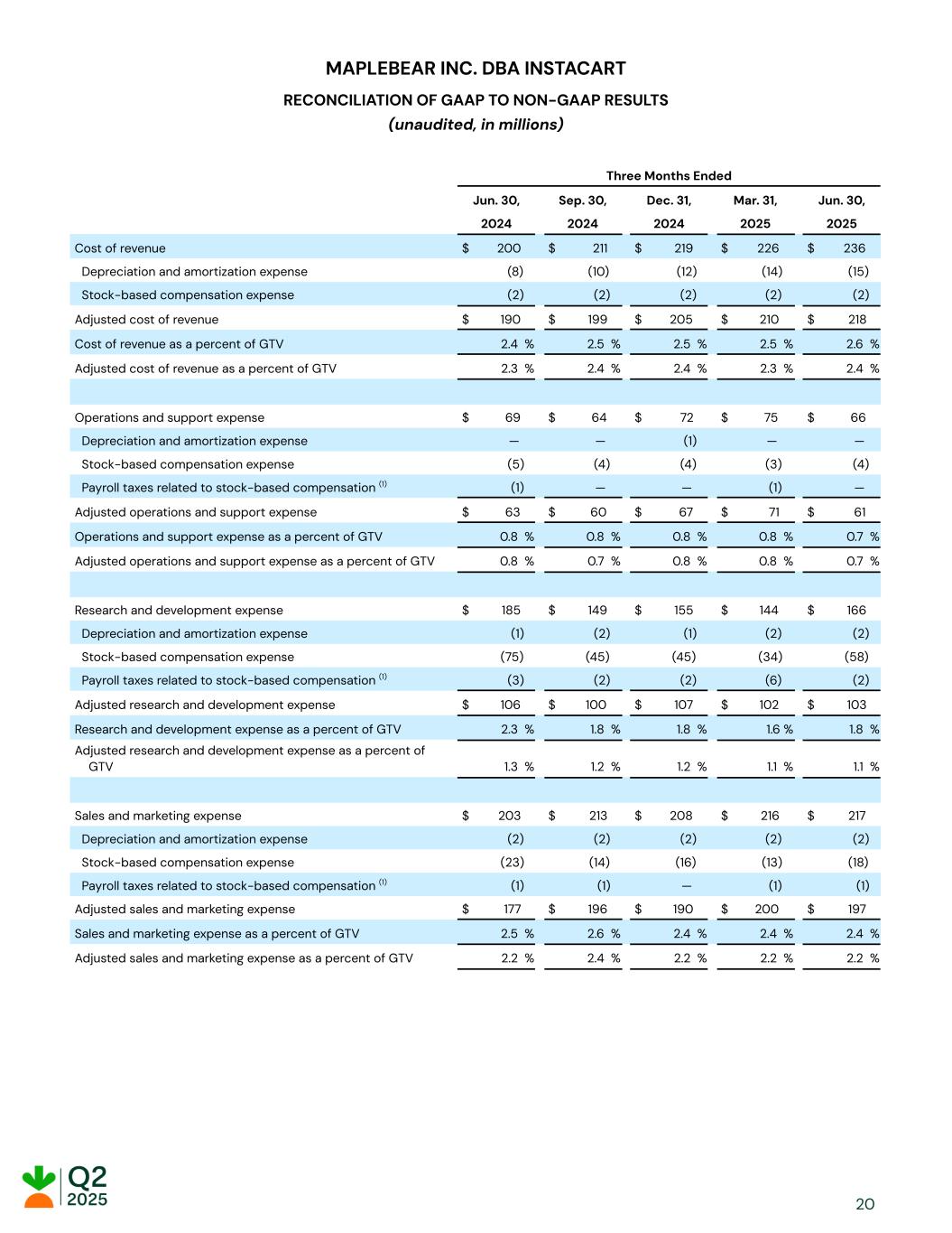 梅普尔贝尔公司。DBA INSTACART对账GAAP与NON-GAAP结果(未经审计,单位:百万)截至6月30日的三个月、9月30日、12月31日、3月31日、6月30日,20242024202420252025收入成本200美元211美元219美元226美元236美元折旧和摊销费用(8)(10)(12)(14)(15)基于股票的补偿费用(2)(2)(2)(2)(2)(2)调整后收入成本190美元199美元205美元210美元218美元收入成本占GTV的百分比2.4% 2.5% 2.5% 2.5% 2.6%调整后收入成本占GTV的百分比2.3% 2.4% 2.3% 2.3% 2.4% 2.3% 2.4%运营和支持费用69美元64美元72美元75美元66美元折旧和摊销费用——(1)——基于股票的补偿费用(5)(4)(4)(3)(4)与基于股票的补偿相关的工资税(1)(1)——(1)——调整后的运营和支持费用63美元60美元67美元71美元61美元运营和支持费用占GTV的百分比0.8% 0.8% 0.8% 0.8% 0.7%调整后的运营和支持费用占GTV的百分比0.8% 0.8% 0.8% 0.7%和开发费用$ 185 $ 149 $ 155 $ 144 $ 166折旧和摊销费用(1)(2)(1)(1)(2)(2)基于股票的补偿费用(75)(45)(45)(34)(58)与基于股票的补偿相关的工资税(1)(3)(2)(2)(6)(2)调整后的研发费用$ 106 $ 100 $ 107 $ 102 $ 103研发费用占GTV2.3 % 1.8% 1.8% 1.6% 1.8%调整后研发费用占GTV1.3 % 1.2% 1.1% 1.1%销售额和营销费用203美元213美元208美元216美元217美元折旧和摊销费用(2)(2)(2)(2)(2)(2)基于股票的补偿费用(23)(14)(16)(13)(18)与基于股票的补偿相关的工资税(1)(1)(1)—(1)(1)调整后的销售和营销费用177美元196美元190美元200美元197美元销售和营销费用占GTV2.5 % 2.6% 2.4% 2.4% 2.4% 2.4% 2.4%调整后的销售和营销费用占GTV2.2 % 2.4% 2.2% 2.2% 20