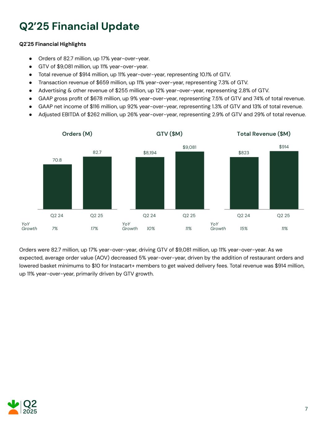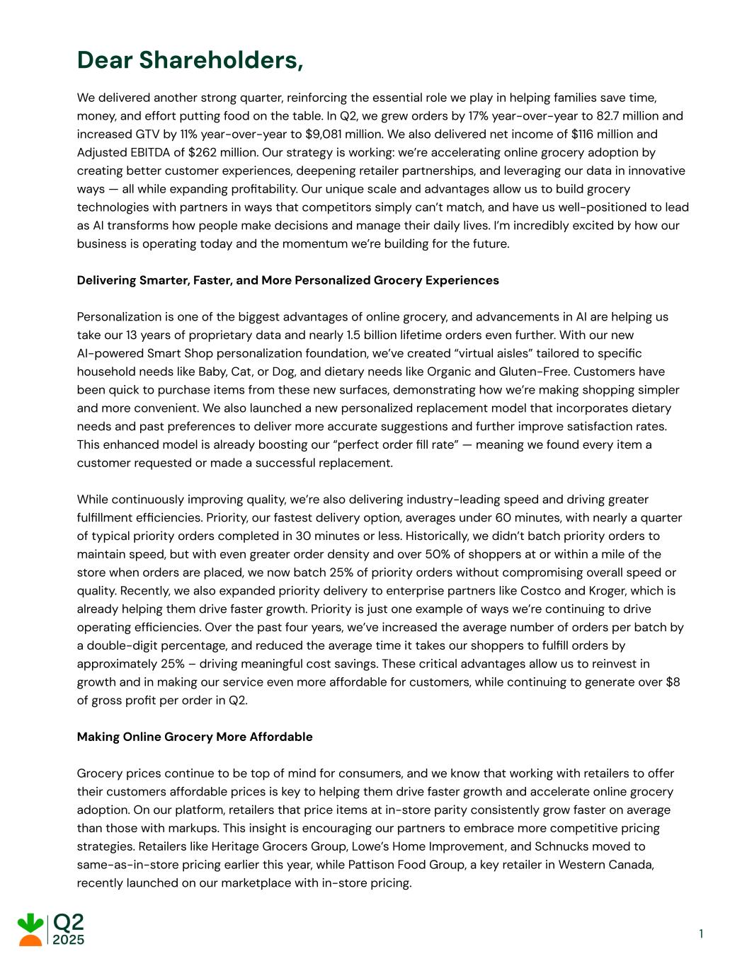 尊敬的股东,我们实现了又一个强劲的季度,加强了我们在帮助家庭节省时间、金钱和努力将食物摆上餐桌方面发挥的重要作用。第二季度,我们的订单同比增长17%至8270万,GTV同比增长11%至908.1亿美元。我们还实现了1.16亿美元的净收入和2.62亿美元的调整后EBITDA。我们的战略正在奏效:我们正在通过创造更好的客户体验、深化零售商合作伙伴关系以及以创新方式利用我们的数据来加速在线杂货的采用——所有这些都是在扩大盈利能力的同时。我们独特的规模和优势使我们能够以竞争对手根本无法比拟的方式与合作伙伴一起构建杂货技术,并让我们处于领先地位,因为人工智能改变了人们做出决策和管理日常生活的方式。我对我们今天的业务运作方式以及我们为未来建立的势头感到无比兴奋。提供更智能、更快速、更个性化的杂货体验个性化是在线杂货的最大优势之一,而人工智能的进步正在帮助我们将13年的专有数据和近15亿的终身订单更进一步。凭借我们全新的AI驱动的智能商店个性化基础,我们创建了针对特定家庭需求(如婴儿、猫或狗)以及有机和无麸质等饮食需求定制的“虚拟过道”。顾客们很快就能从这些新表面上购买商品,这表明我们正在让购物变得更简单、更方便。我们还推出了全新的个性化替代模式,融合了饮食需求和过去的偏好,以提供更准确的建议,进一步提高满意率。这种增强的模式已经在提升我们的“完美订单满足率”——这意味着我们找到了客户要求或成功更换的每一件商品。在不断提高质量的同时,我们还提供了行业领先的速度,并推动了更高的履行效率。优先,我们最快的交付选项,平均在60分钟以下,有近四分之一的典型优先订单在30分钟或更短的时间内完成。从历史上看,我们并不是为了保持速度而批量优先订单,但由于订单密度更大,并且在下订单时超过50%的购物者在商店或一英里范围内,我们现在在不影响整体速度或质量的情况下批量处理25%的优先订单。最近,我们还将优先配送扩展到了像好市多和克罗格这样的企业合作伙伴,这已经在帮助他们推动更快的增长。优先级只是我们继续推动运营效率的方式的一个例子。在过去四年中,我们将每批次的平均订单数量提高了两位数百分比,并将购物者完成订单的平均时间减少了约25% ——推动了显着的成本节约。这些关键优势使我们能够对增长进行再投资,并使我们的服务对客户来说更加实惠,同时在第二季度继续为每个订单带来超过8美元的毛利润。让在线杂货更实惠的杂货价格仍然是消费者最关心的问题,我们知道,与零售商合作,为他们的顾客提供负担得起的价格,是帮助他们推动更快增长和加速在线杂货采用的关键。在我们的平台上,以店内平价定价商品的零售商的平均增长速度始终快于那些加价的零售商。这种洞察力正在鼓励我们的合作伙伴采用更具竞争力的定价策略。Heritage Grocers Group、Lowe’s Home Improvement和Schnucks等零售商今年早些时候开始采用与店内定价相同的定价,而加拿大西部的主要零售商Pattison Food Group最近在我们的市场上推出了店内定价。1