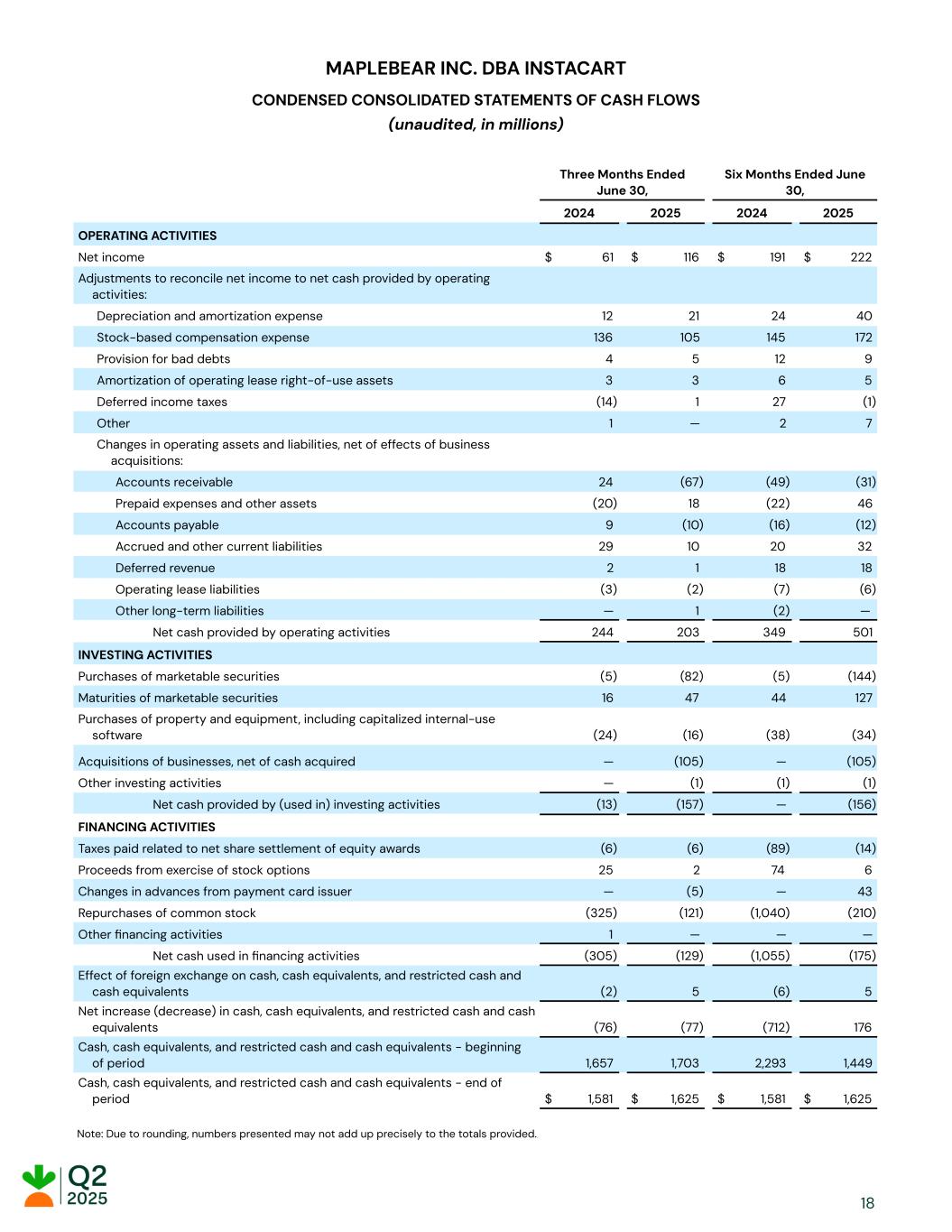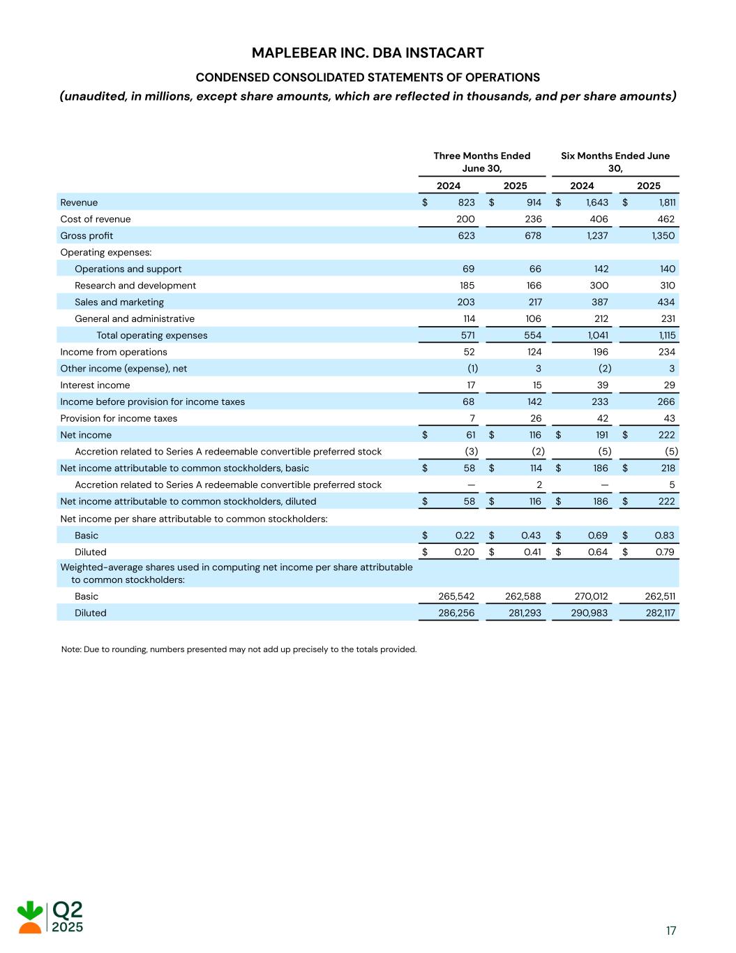 梅普尔贝尔公司。DBA INSTACART简明合并经营报表(未经审计,单位:百万,但以千为单位的股份金额和每股金额除外)截至6月30日的三个月、截至6月30日的六个月,2024202520242025收入$ 823 $ 914 $ 1,643 $ 1,811收入成本200236406462毛利润6236781,2371,350运营费用:运营和支持6966142140研发185166300310销售和营销203217387434一般和行政114106212231总运营费用5715541,115运营收入52124196234其他收入(费用),净额(1)3(2)3利息收入17153929所得税拨备前收入68142233266所得税拨备7264243净收入61美元116美元191美元222美元与A系列可赎回可转换优先股相关的增值(3)(2)(5)(5)归属于普通股股东的净收入,基本58美元114美元186美元218美元与A系列可赎回可转换优先股相关的增值— 2 — 5归属于普通股股东的净收入,稀释后58美元116美元186美元222美元归属于普通股股东的每股净收益:基本0.22美元0.43美元0.69美元0.83美元稀释后0.20美元0.41美元0.64美元0.79美元用于计算归属于普通股股东的每股净收益的加权平均股:基本265,542262,588270,012262,511稀释后286,256281,293290,983282,117注:由于四舍五入,所列数字加起来可能与所提供的总数不完全一致。17