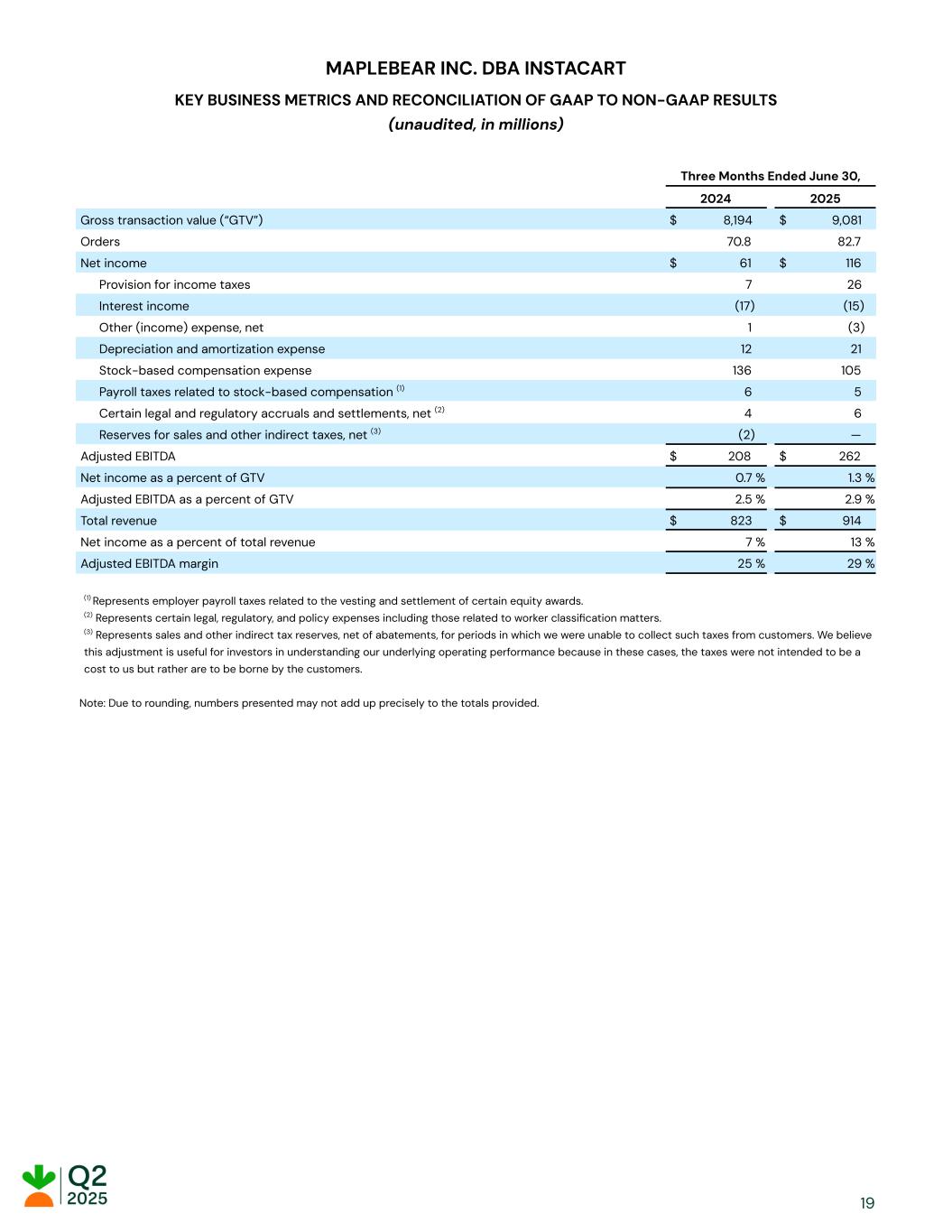 梅普尔贝尔公司。DBA Instacart关键业务指标和GAAP与NON-GAAP结果的对账(未经审计,单位:百万)截至2024年6月30日的三个月2025年总交易价值(“GTV”)8,194美元9,081美元订单70.88 2.7净收入61美元116美元所得税准备金726利息收入(17)(15)其他(收入)费用,净额1(3)折旧和摊销费用1221基于股票的补偿费用136105与基于股票的补偿相关的工资税(1)65某些法律和监管的应计和结算,净额(2)46销售准备金和其他间接税,净额(3)(2)—调整后EBITDA 208美元262美元净收入占GTV的百分比0.7% 1.3%调整后EBITDA占GTV的百分比2.5% 2.9%总收入823美元914美元净收入占总收入的百分比7% 13%调整后EBITDA利润率25% 29%(1)代表与某些股权奖励的归属和结算相关的雇主工资税。(2)代表某些法律、法规和政策费用,包括与工人分类事项有关的费用。(3)表示我们无法向客户收取此类税款的期间的销售和其他间接税项储备,扣除减免。我们认为,这一调整有助于投资者了解我们的基本经营业绩,因为在这些情况下,税收不是我们的成本,而是由客户承担。注:由于四舍五入的原因,所提供的数字可能与所提供的总数不完全相加。19