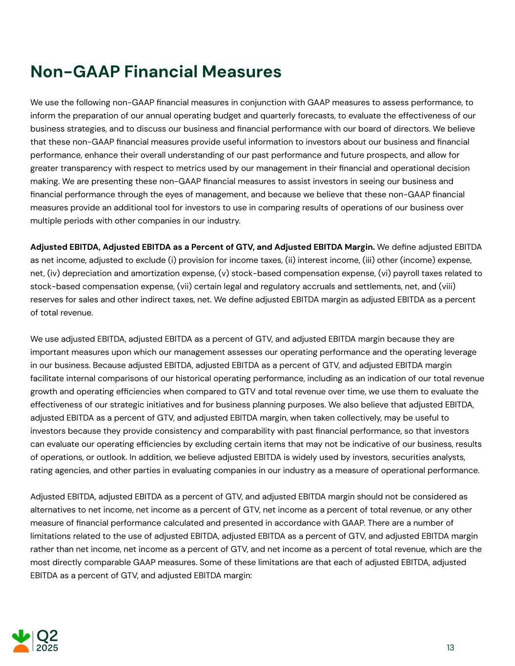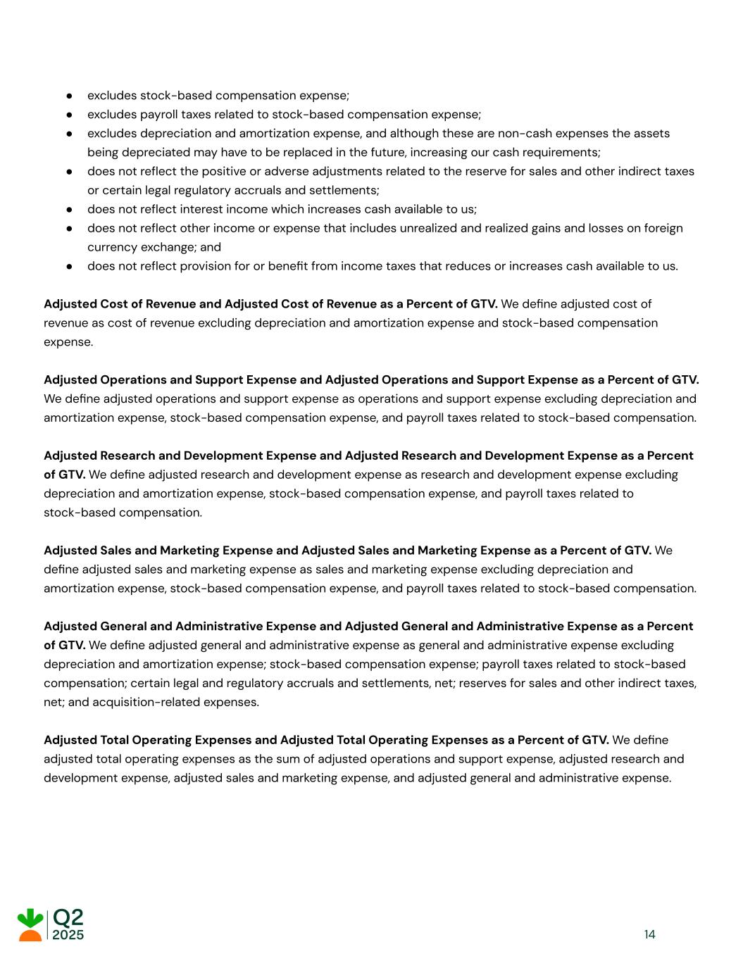 ●不包括基于股票的补偿费用;●不包括与基于股票的补偿费用相关的工资税;●不包括折旧和摊销费用,尽管这些是非现金费用,但被折旧的资产未来可能不得不更换,增加我们的现金需求;●未反映与销售准备金和其他间接税或某些法律监管应计和结算相关的正面或负面调整;●未反映增加我们可用现金的利息收入;●未反映包括未实现和已实现的外币兑换损益的其他收入或费用;●未反映减少或增加我们可用现金的所得税拨备或收益。调整后的收入成本和调整后的收入成本占GTV的百分比。我们将调整后的收入成本定义为不包括折旧和摊销费用以及基于股票的补偿费用的收入成本。调整后的运营和支持费用以及调整后的运营和支持费用占GTV的百分比。我们将调整后的运营和支持费用定义为不包括折旧和摊销费用、基于股票的薪酬费用以及与基于股票的薪酬相关的工资税的运营和支持费用。调整后的研发费用和调整后的研发费用占GTV的百分比。我们将调整后的研发费用定义为不包括折旧和摊销费用、基于股票的薪酬费用以及与基于股票的薪酬相关的工资税的研发费用。调整了销售和营销费用,调整了销售和营销费用占GTV的百分比。我们将调整后的销售和营销费用定义为不包括折旧和摊销费用、基于股票的薪酬费用以及与基于股票的薪酬相关的工资税的销售和营销费用。调整后的一般和行政费用以及调整后的一般和行政费用占GTV的百分比。我们将调整后的一般和管理费用定义为一般和管理费用,不包括折旧和摊销费用;基于股票的补偿费用;与基于股票的补偿相关的工资税;某些法律和监管的应计和结算,净额;销售和其他间接税准备金,净额;以及与收购相关的费用。调整后的总运营费用和调整后的总运营费用占GTV的百分比。我们将调整后的总运营费用定义为调整后的运营和支持费用、调整后的研发费用、调整后的销售和营销费用以及调整后的一般和管理费用之和。14