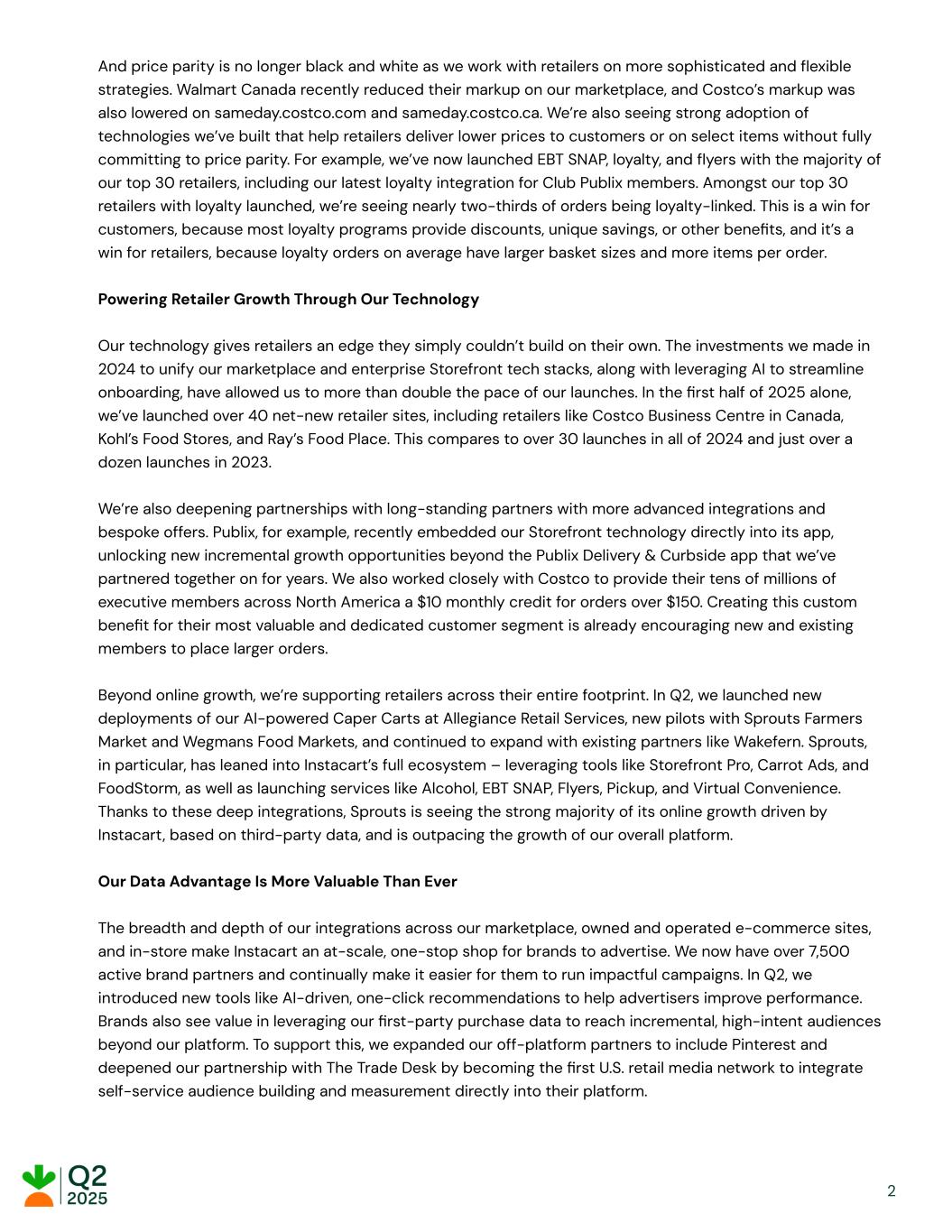 随着我们与零售商合作制定更复杂和灵活的战略,价格平价不再是非黑即白的。沃尔玛加拿大公司最近降低了他们在我们市场上的加价,好市多的加价也在sameday.costco.com和sameday.costco.ca上降低。我们还看到,我们开发的技术得到了广泛采用,这些技术可以帮助零售商在不完全致力于价格平价的情况下向客户或特定商品提供更低的价格。例如,我们现在已经与我们前30名零售商中的大多数推出了EBT SNAP、忠诚度和传单,包括我们针对Club Publix会员的最新忠诚度整合。在我们推出的忠诚度排名前30位的零售商中,我们看到近三分之二的订单与忠诚度相关。这对顾客来说是一场胜利,因为大多数忠诚度计划提供折扣、独特的节省或其他好处,对零售商来说也是一场胜利,因为忠诚度订单的平均购物篮尺寸更大,每单商品更多。通过我们的技术推动零售商增长我们的技术为零售商提供了他们根本无法靠自己建立的优势。我们在2024年为统一我们的市场和企业店面技术堆栈所做的投资,以及利用人工智能简化入职流程,使我们能够将发布速度提高一倍以上。仅在2025年上半年,我们就推出了超过40个净新零售商网站,其中包括加拿大好市多商务中心、Kohl’s Food Stores和Ray's Food Place等零售商。相比之下,2024年全年发射次数超过30次,2023年发射次数刚刚超过12次。我们还通过更先进的集成和定制优惠,深化与长期合作伙伴的合作伙伴关系。例如,Publix最近将我们的店面技术直接嵌入其应用程序中,在我们合作多年的Publix Delivery & Curbside应用程序之外,释放了新的增量增长机会。我们还与好市多密切合作,为他们遍布北美的数千万执行会员提供每月超过150美元订单的10美元信用额度。为他们最有价值和最专注的客户群创造这种定制福利已经在鼓励新的和现有的会员下更大的订单。除了线上增长,我们还在为零售商的整个足迹提供支持。在第二季度,我们在Allegiance Retail Services推出了由人工智能驱动的Caper Carts的新部署,在豆芽农贸市场和Wegmans Food Markets进行了新的试点,并与Wakefern等现有合作伙伴继续扩展。特别是Sprouts,已经倾向于Instacart的完整生态系统——利用Storefront Pro、Carrot Ads和FoodStorm等工具,以及推出Alcohol、EBT SNAP、Flyers、Pickup和Virtual Convenience等服务。由于这些深度整合,Sprouts看到了基于第三方数据的Instacart推动的大部分在线增长,并且超过了我们整体平台的增长。我们的数据优势比以往任何时候都更有价值我们在整个市场、拥有和运营的电子商务网站以及店内整合的广度和深度使Instacart成为品牌投放广告的大规模、一站式商店。我们现在有超过7,500个活跃的品牌合作伙伴,并不断让他们更容易开展有影响力的活动。在第二季度,我们推出了人工智能驱动、一键推荐等新工具,以帮助广告商提高业绩。品牌也看到了利用我们的第一方购买数据覆盖我们平台之外的增量、高意向受众的价值。为了支持这一点,我们扩大了平台外合作伙伴,将Pinterest纳入其中,并加深了我们与The Trade Desk的合作伙伴关系,成为美国首家将自助受众构建和测量直接集成到其平台中的零售媒体网络。2