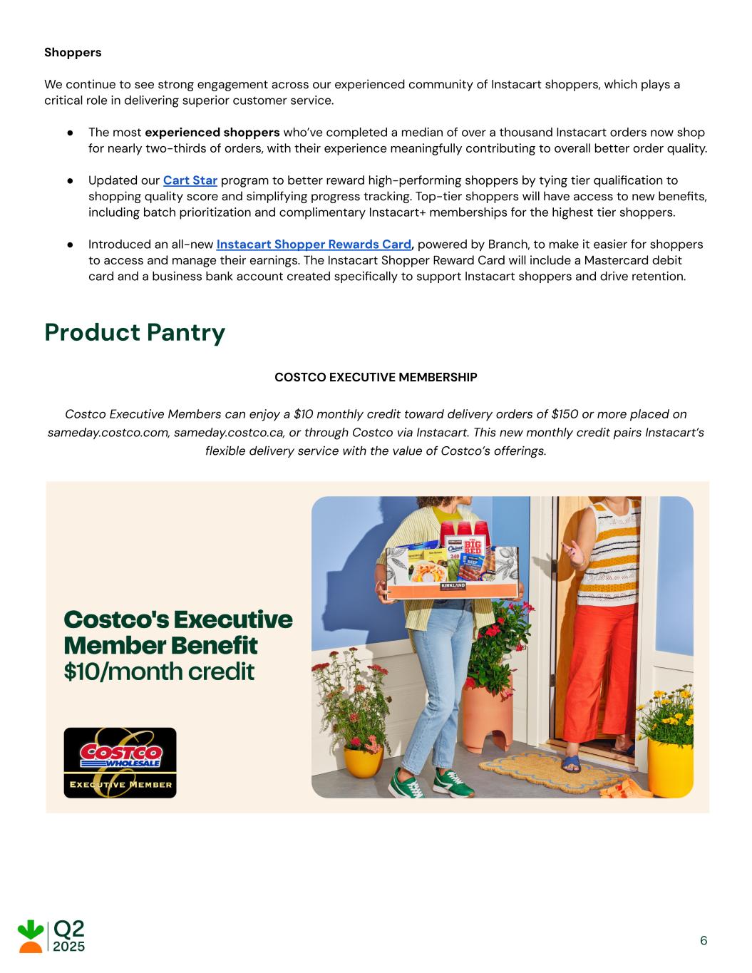 购物者我们继续在我们经验丰富的Instacart购物者社区中看到强大的参与度,这在提供卓越的客户服务方面发挥着关键作用。●最有经验的购物者完成了超过一千个Instacart订单的中位数,现在他们购买了近三分之二的订单,他们的经验对整体更好的订单质量做出了有意义的贡献。●更新了我们的Cart Star计划,通过将等级资格与购物质量评分挂钩并简化进度跟踪,更好地奖励表现出色的购物者。顶级购物者将获得新的福利,包括批量优先排序和最高级别购物者的免费Instacart +会员资格。●推出全新的Instacart购物者奖励卡,由Branch提供支持,让购物者更容易访问和管理他们的收入。Instacart购物者奖励卡将包括一张万事达借记卡和一个专门为支持Instacart购物者和提高留存率而创建的商业银行账户。Product Pantry COSTCO执行会员好市多执行会员在sameday.costco.com、sameday.costco.ca或通过Instacart通过好市多下单购买150美元或以上的配送订单时,可享受每月10美元的信用额度。这种新的每月信用额度将Instacart的灵活配送服务与好市多产品的价值相结合。6