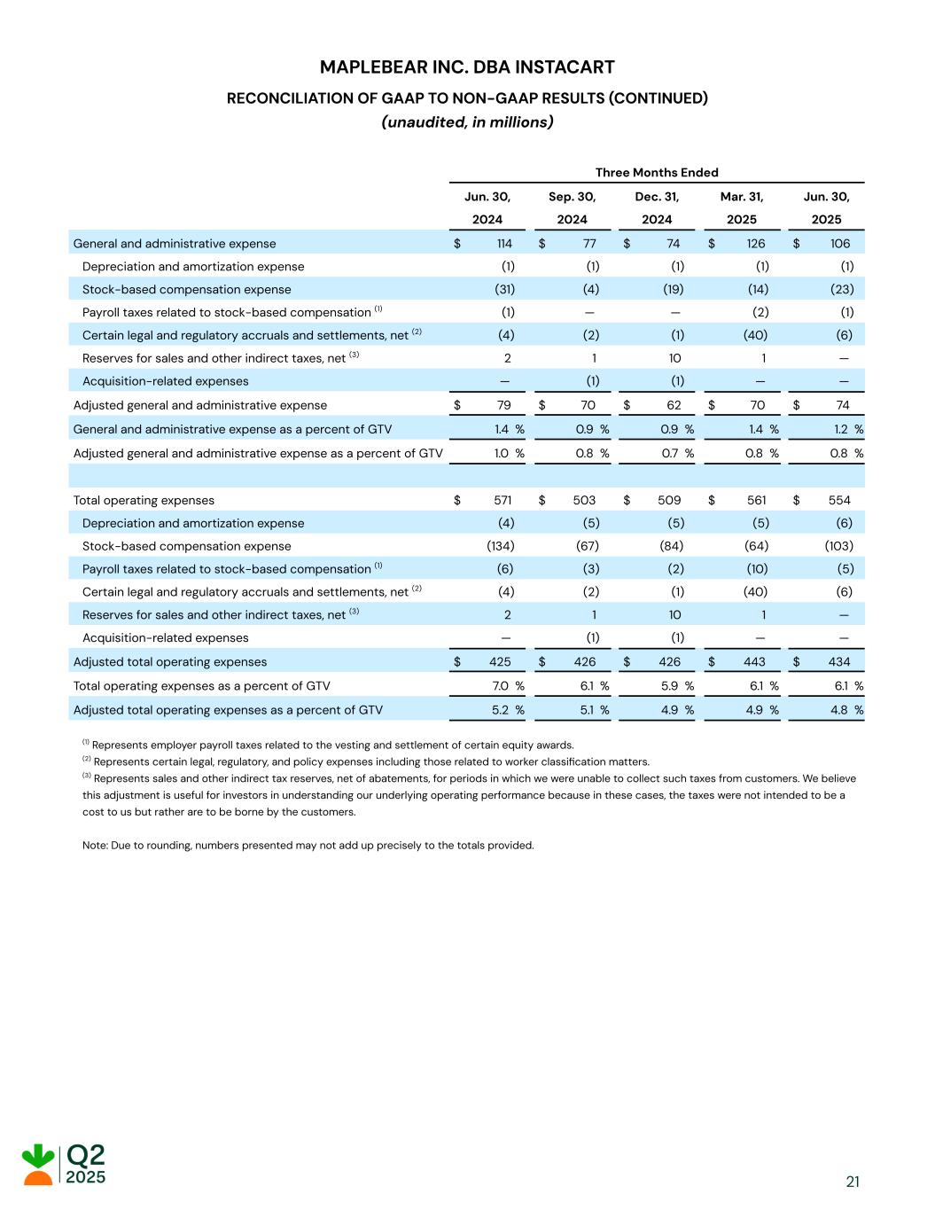 梅普尔贝尔公司。DBA INSTACART将GAAP与NON-GAAP结果对账(续)(未经审计,单位:百万)截至6月30日的三个月、9月30日、12月31日、3月31日、6月30日,2024202420252025一般和管理费用$ 114 $ 77 $ 74 $ 126 $ 106折旧和摊销费用(1)(1)(1)(1)(1)基于股票的补偿费用(31)(4)(19)(14)(23)与基于股票的补偿相关的工资税(1)(1)——(2)(1)某些法律法规的应计和结算,净额(2)(4)(2)(1)(40)(6)销售准备金和其他间接税,净额(3)21101 —购置相关费用——(1)(1)——调整后的一般和行政费用79美元70美元62美元70美元74美元一般和行政费用占GTV的百分比1.4% 0.9% 0.9% 1.4% 1.2%调整后的一般和行政费用占GTV的百分比1.0% 0.8% 0.7% 0.8% 0.8%营业费用总额571美元503美元509美元561美元554美元折旧和摊销费用(4)(5)(5)(5)(6)基于股票的补偿费用(134)(67)(84)(64)(103)与基于股票的补偿相关的工资税(1)(6)(3)(2)(10)(5)某些法律法规的应计和结算,净额(2)(4)(2)(1)(40)(6)销售准备金和其他间接税,净额(3)21101 —收购相关费用——(1)(1)——调整后的总运营费用425美元426美元426美元443美元434美元总运营费用占GTV7.0 % 6.1% 5.9% 6.1% 6.1%调整后的总运营费用占GTV5.2 % 5.1% 4.9% 4.9% 4.8%(1)代表与某些股权奖励的归属和结算相关的雇主工资税。(2)代表某些法律、法规和政策费用,包括与工人分类事项有关的费用。(3)表示我们无法向客户收取此类税款的期间的销售和其他间接税收储备,扣除减免。我们认为,这一调整有助于投资者了解我们的基本经营业绩,因为在这些情况下,税收并不是我们的成本,而是由客户承担。注:由于四舍五入的原因,所提供的数字可能与所提供的总数不完全相加。21