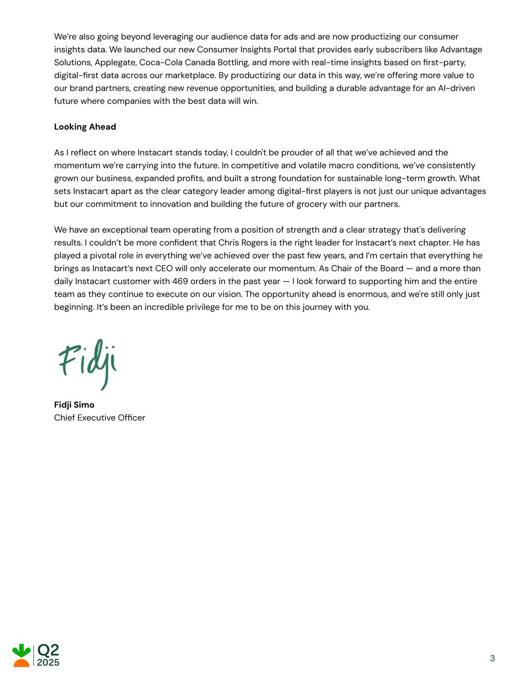 我们还超越了利用我们的受众数据来投放广告,现在正在将我们的消费者洞察数据产品化。我们推出了新的Consumer Insights门户,该门户基于我们整个市场的第一方、数字优先的数据,为Advantage Solutions、Applegate、可口可乐 Canada Bottling等早期订阅者提供实时洞察。通过以这种方式将我们的数据产品化,我们正在为我们的品牌合作伙伴提供更多价值,创造新的收入机会,并为人工智能驱动的未来建立持久优势,在这个未来,拥有最佳数据的公司将获胜。展望未来,当我反思Instacart今天所处的位置时,我为我们所取得的一切以及我们向未来传递的势头感到无比自豪。在竞争激烈和波动的宏观环境中,我们不断发展业务,扩大利润,为可持续的长期增长奠定了坚实的基础。Instacart作为数字优先参与者中明显的品类领导者的与众不同之处,不仅在于我们的独特优势,还在于我们致力于创新并与我们的合作伙伴一起建设杂货的未来。我们有一支出色的团队,他们在实力雄厚的位置上运作,并制定了清晰的战略,正在交付成果。我非常有信心,Chris Rogers是Instacart下一章的合适领导者。他在我们过去几年取得的一切成就中发挥了关键作用,我敢肯定,他作为Instacart下一任CEO所带来的一切只会加速我们的势头。作为董事会主席——以及在过去一年里拥有469个订单的Instacart客户,我期待着支持他和整个团队继续执行我们的愿景。未来的机会是巨大的,我们还只是刚刚开始。能和你一起踏上这段旅程,对我来说是一种难以置信的荣幸。Fidji Simo首席执行官3