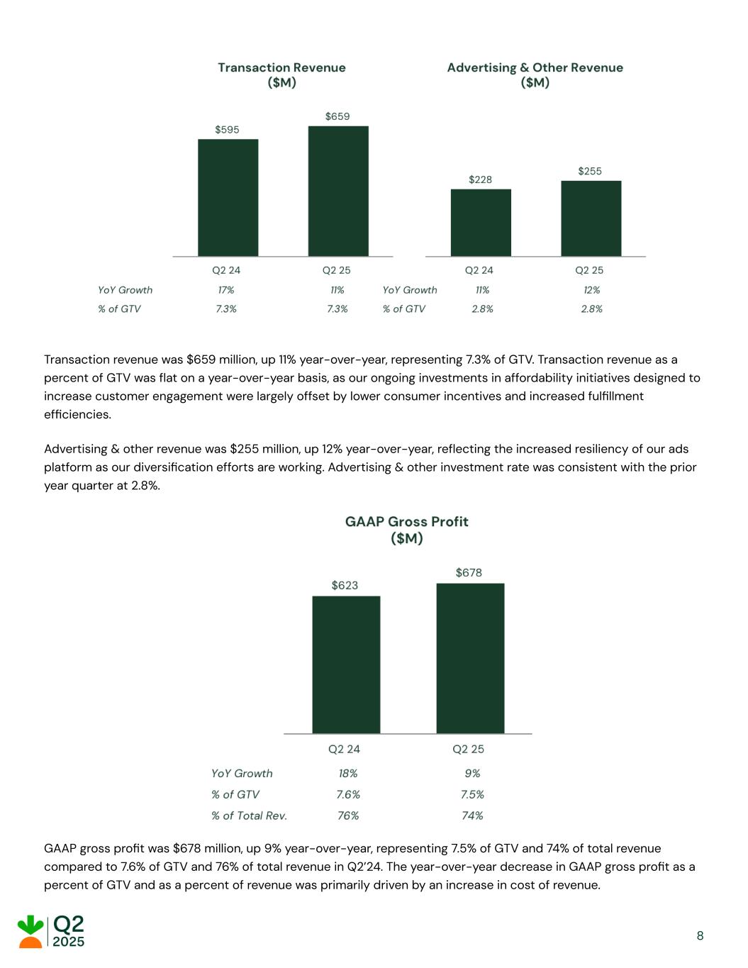 交易收入6.59亿美元,同比增长11%,占GTV的7.3%。交易收入占GTV的百分比与去年同期持平,因为我们正在进行的旨在提高客户参与度的可负担性举措的投资在很大程度上被较低的消费者激励措施和提高的履行效率所抵消。广告及其他收入为2.55亿美元,同比增长12%,反映出随着我们的多元化努力奏效,我们的广告平台的弹性有所增强。广告和其他投资率与去年同期一致,为2.8%。GAAP毛利润为6.78亿美元,同比增长9%,占GTV的7.5%,占总收入的74%,而24年Q2占GTV的7.6%,占总收入的76%。GAAP毛利润在GTV中所占百分比和在收入中所占百分比的同比下降主要是由于收入成本的增加。8