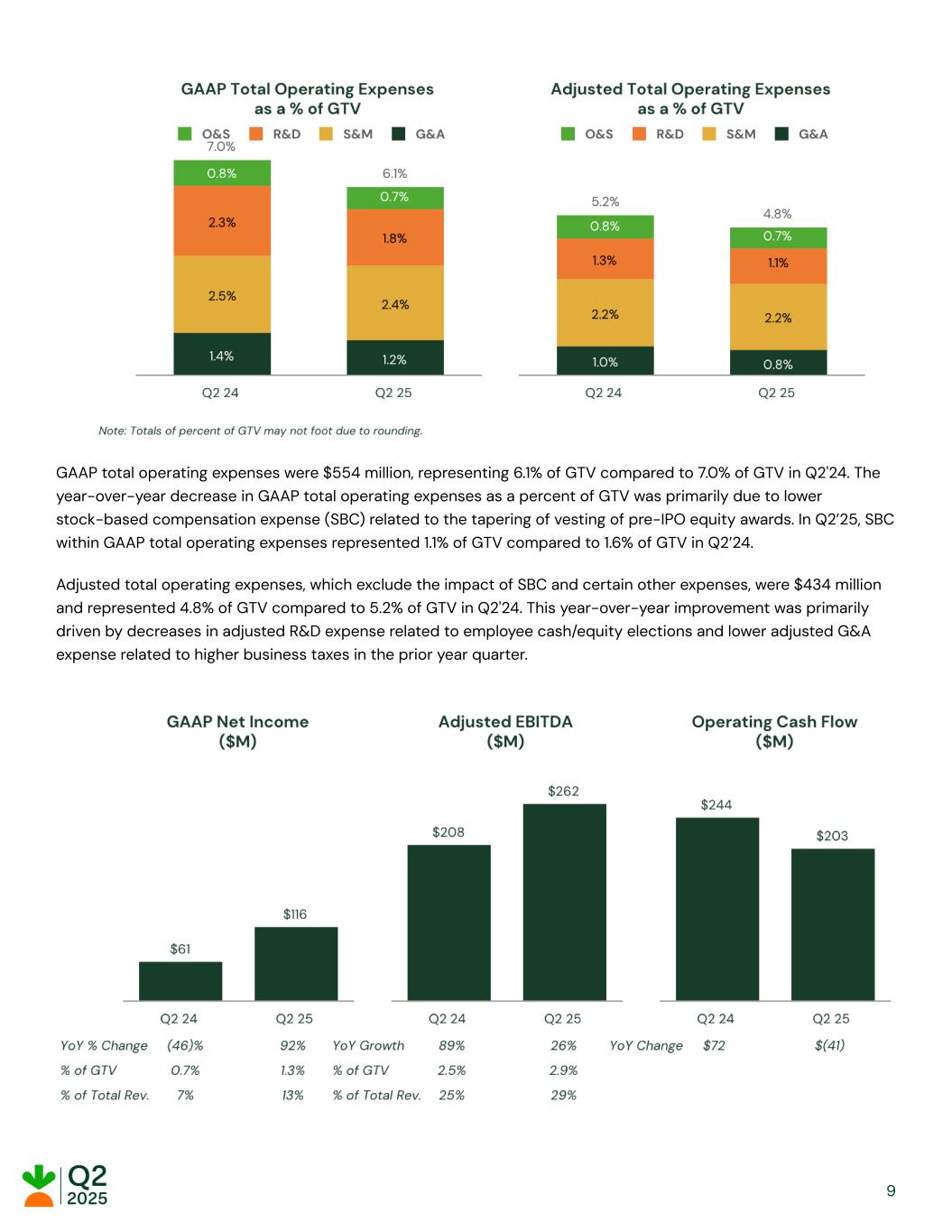 GAAP总运营费用为5.54亿美元,占GTV的6.1%,而24年Q2占GTV的7.0%。GAAP总运营费用占GTV的百分比同比下降主要是由于与IPO前股权奖励的逐渐归属相关的基于股票的薪酬费用(SBC)减少。25年第二季度,SBC在GAAP范围内的总运营费用占GTV的1.1%,而24年第二季度占GTV的1.6%。不包括SBC和某些其他费用的影响的调整后总运营费用为4.34亿美元,占GTV的4.8%,而24年第二季度占GTV的5.2%。同比改善的主要原因是与员工现金/股权选举相关的调整后研发费用减少,以及与上一季度较高的营业税相关的调整后G & A费用减少。9