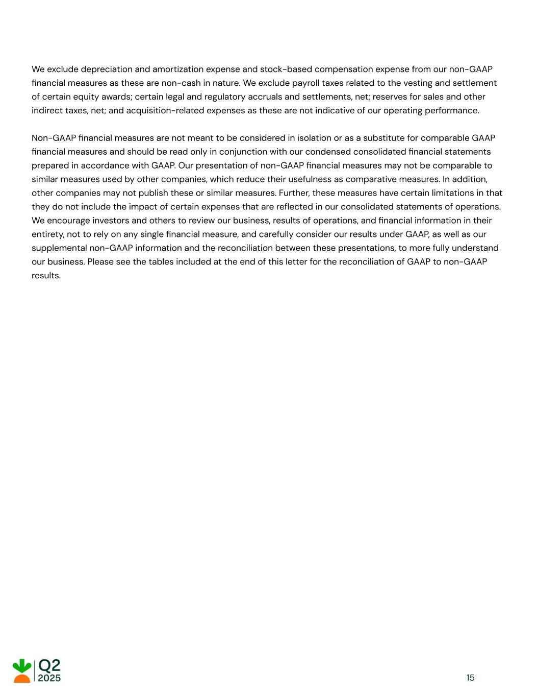 我们将折旧和摊销费用以及基于股票的补偿费用排除在我们的非公认会计准则财务指标之外,因为这些都是非现金性质的。我们不包括与某些股权奖励的归属和结算相关的工资税;某些法律和监管的应计和结算,净额;销售和其他间接税准备金,净额;以及与收购相关的费用,因为这些并不代表我们的经营业绩。非GAAP财务指标不应被孤立地考虑或替代可比的GAAP财务指标,应仅与我们根据GAAP编制的简明合并财务报表一起阅读。我们对非GAAP财务指标的表述可能无法与其他公司使用的类似指标进行比较,这降低了它们作为比较指标的有用性。此外,其他公司不得发布这些或类似措施。此外,这些措施有一定的局限性,因为它们不包括反映在我们的综合经营报表中的某些费用的影响。我们鼓励投资者和其他人全面审查我们的业务、运营结果和财务信息,而不是依赖任何单一的财务指标,并仔细考虑我们在GAAP下的结果,以及我们补充的非GAAP信息和这些演示之间的调节,以更全面地了解我们的业务。关于GAAP与非GAAP结果的对账,请参阅本信末尾的表格。15
