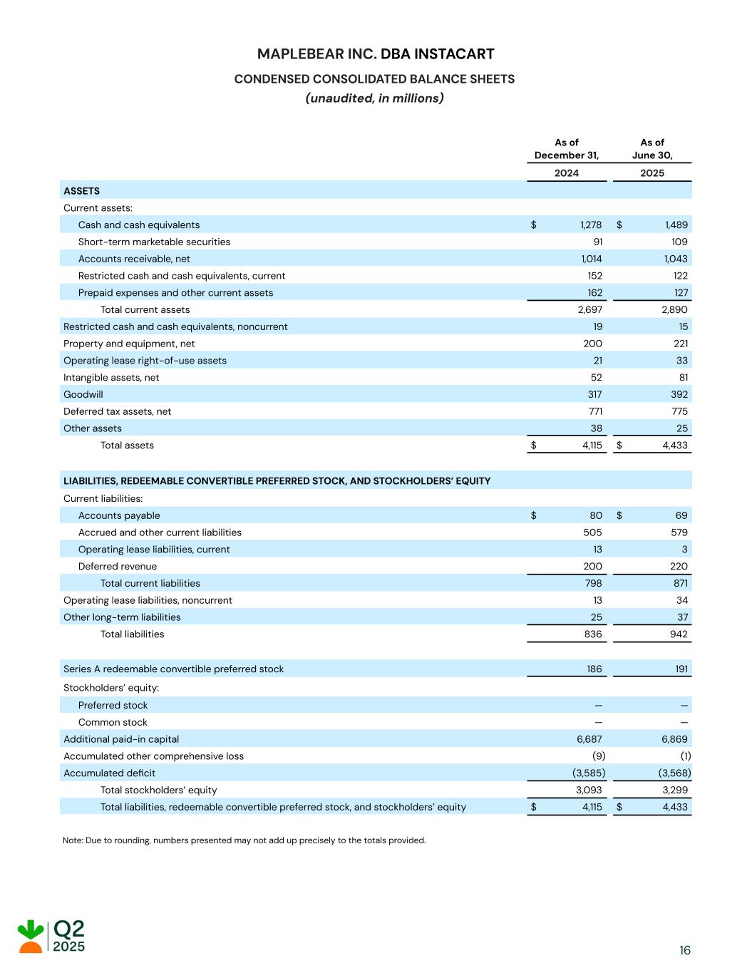 梅普尔贝尔公司。DBA INSTACART截至12月31日的简明合并资产负债表(未经审计,单位:百万),截至2024年6月30日2025资产流动资产:现金及现金等价物$ 1,278 $ 1,489短期有价证券91109应收账款净额1,0141,043受限制的现金及现金等价物、流动152122预付费用和其他流动资产162127流动资产总额2,6972,890受限制的现金及现金等价物、非流动1915财产和设备净额200221经营租赁使用权资产2133丨无形资产,净额丨5281商誉317392递延所得税资产,净额771775其他资产3825总资产4115美元4433美元负债、可赎回可转换优先股和股东权益流动负债:应付账款80美元69美元应计和其他流动负债505579经营租赁负债,流动133递延收入200220流动负债总额798871经营租赁负债,非流动1334其他长期负债2537负债总额836942 A系列可赎回可转换优先股186191股东权益:优先股——普通股—— 额外实收资本 6,6876,869累计其他综合损失(9)(1)累计亏损(3,585)(3,568)股东权益总额3,0933,299负债总额、可赎回可转换优先股、股东权益$ 4,115 $ 4,433注:由于四舍五入,所列数字加起来可能与所提供的总数不完全一致。16