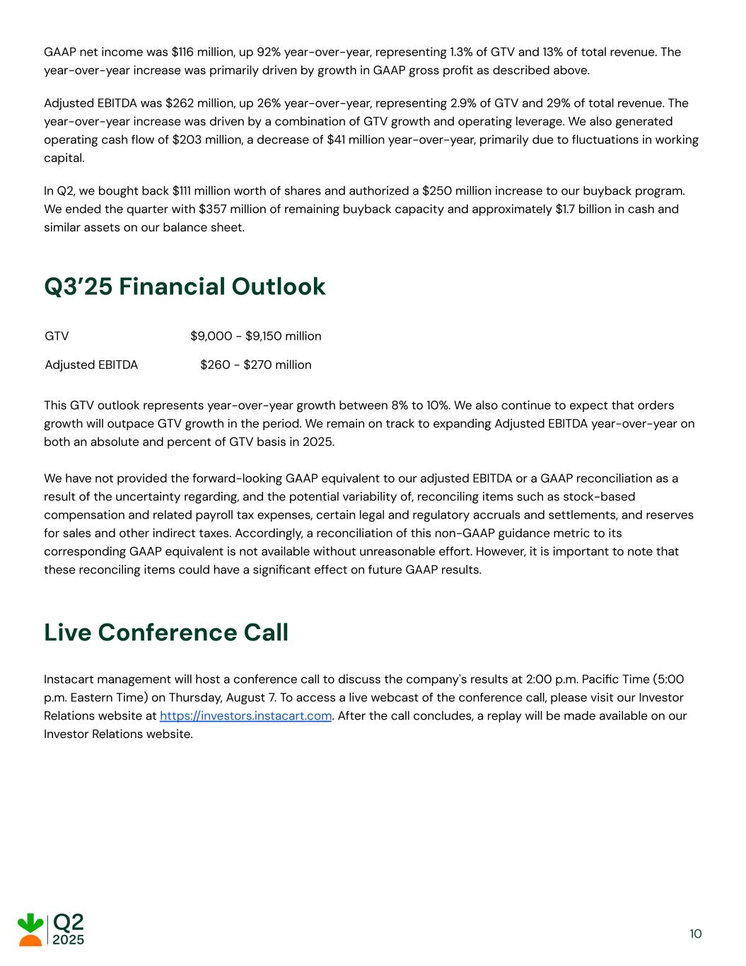 GAAP净利润1.16亿美元,同比增长92%,占GTV的1.3%,占总营收的13%。同比增长主要是由如上所述的GAAP毛利润增长推动的。调整后EBITDA为2.62亿美元,同比增长26%,占GTV的2.9%,占总收入的29%。同比增长是由GTV增长和经营杠杆共同推动的。我们还产生了2.03亿美元的运营现金流,同比减少了4100万美元,这主要是由于营运资金的波动。在第二季度,我们回购了价值1.11亿美元的股票,并授权增加2.5亿美元的回购计划。本季度末,我们的资产负债表上有3.57亿美元的剩余回购能力和大约17亿美元的现金和类似资产。25年第三季度财务展望GTV 9000美元至91.5亿美元调整后EBITDA 260美元至2.7亿美元这一GTV前景代表着8%至10%的同比增长。我们还继续预计,期内订单增长将超过GTV增长。我们仍有望在2025年在绝对和占GTV百分比的基础上同比扩大调整后EBITDA。由于基于股票的薪酬和相关的工资税费用、某些法律和监管的应计和结算以及销售准备金和其他间接税等调节项目的不确定性以及潜在的可变性,我们没有提供与我们调整后EBITDA或GAAP调节相当的前瞻性GAAP调节。因此,如果不做出不合理的努力,就无法将这一非GAAP指导指标与其相应的GAAP等效指标进行对账。然而,需要注意的是,这些调节项目可能会对未来的GAAP结果产生重大影响。现场电话会议Instacart管理层将于太平洋时间8月7日(星期四)下午2:00(美国东部时间下午5:00)召开电话会议,讨论公司业绩。要观看电话会议的网络直播,请访问我们的投资者关系网站:https://investors.instacart.com。电话会议结束后,我们的投资者关系网站将提供重播。10