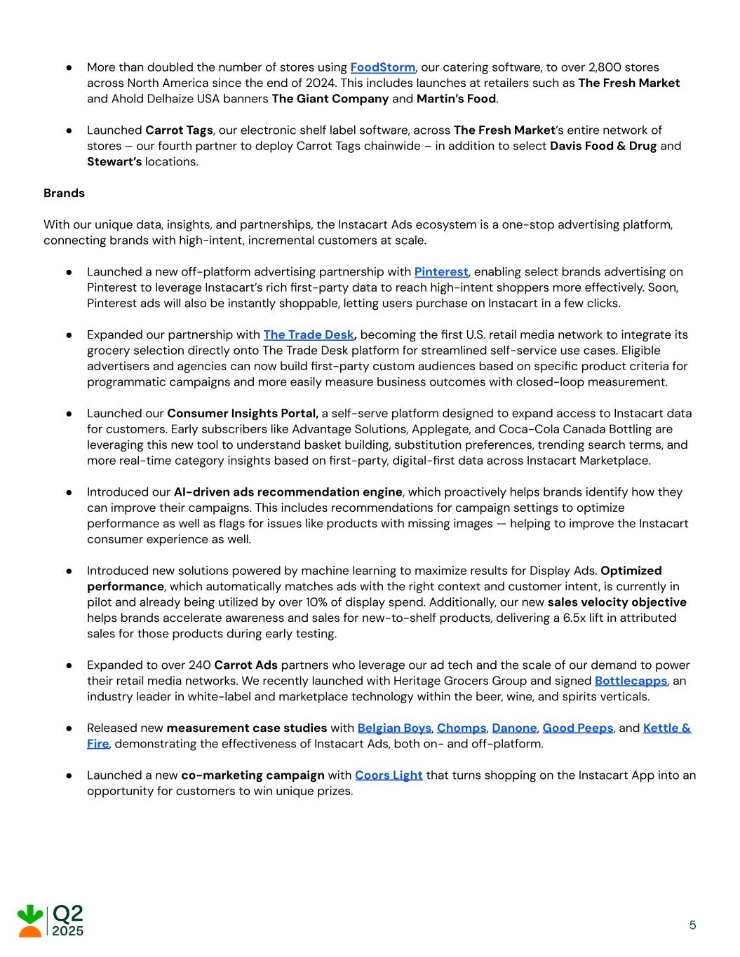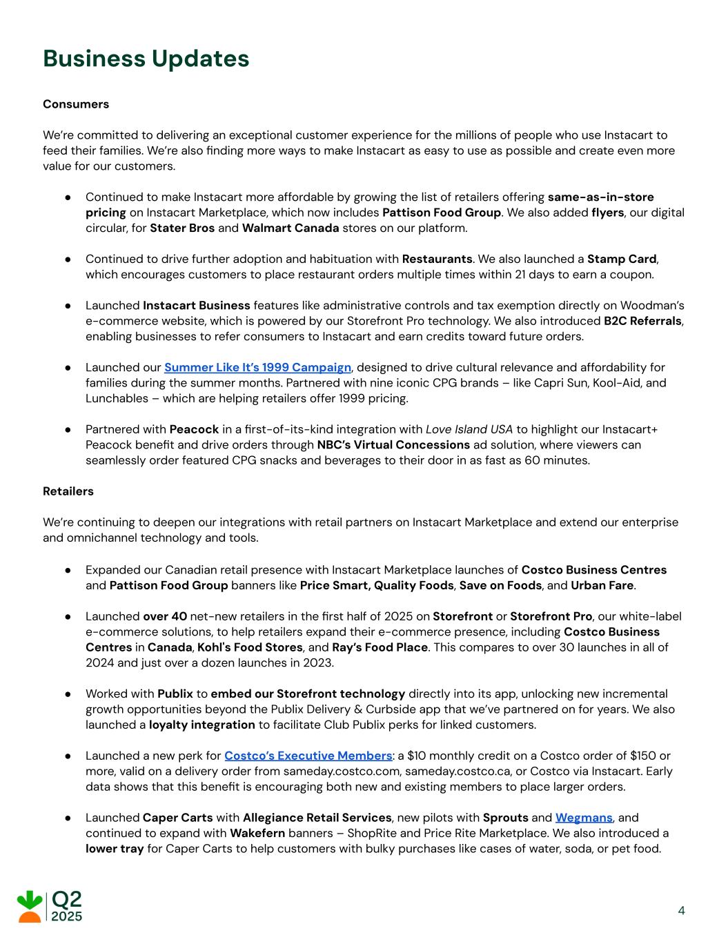 业务更新消费者我们致力于为数百万使用Instacart养家糊口的人提供卓越的客户体验。我们还在寻找更多方法,让Instacart尽可能易于使用,并为我们的客户创造更多价值。●通过增加在Instacart Marketplace上提供与店内价格相同的零售商名单,继续让Instacart更实惠,该市场现在包括Pattison Food Group。我们还在我们的平台上为Stater Bros和Walmart Canada商店添加了传单,即我们的数字通告。●继续推动进一步采用和习惯餐厅。我们还推出了邮票卡,鼓励顾客在21天内多次下单餐厅赚取优惠券。●直接在Woodman的电子商务网站上推出行政控制和免税等Instacart Business功能,该网站由我们的Storefront Pro技术提供支持。我们还引入了B2C推荐,使企业能够将消费者推荐给Instacart,并为未来的订单赚取积分。●发起了我们的Summer Like IT's 1999活动,旨在推动夏季月份的文化相关性和家庭负担能力。与九个标志性的CPG品牌——如Capri Sun、Kool-Aid和Lunchables ——合作,这些品牌正在帮助零售商提供1999年的定价。●与Peacock合作,与Love Island USA进行首次整合,突出我们的Instacart + Peacock福利,并通过NBC的虚拟优惠广告解决方案推动订单,观众可以在60分钟内无缝订购特色CPG零食和饮料到家门口。零售商我们将继续深化与Instacart Marketplace上的零售合作伙伴的整合,并扩展我们的企业和全渠道技术和工具。●扩大了我们在加拿大的零售业务,Instacart Marketplace推出了好市多商务中心和Pattison Food Group横幅,如Price Smart、Quality Foods、Save on Foods和Urban Fare。●在2025年上半年,在我们的白牌电子商务解决方案Storefront或Storefront Pro上推出了超过40家净新零售商,以帮助零售商扩大其电子商务影响力,包括加拿大的好市多商务中心、Kohl‘s Food Stores和Ray’s Food Place。相比之下,2024年全年发射次数超过30次,2023年发射次数刚刚超过12次。●与Publix合作,将我们的店面技术直接嵌入其应用程序,在我们合作多年的Publix Delivery & Curbside应用程序之外释放新的增量增长机会。我们还推出了忠诚度整合,以促进Club Publix为关联客户提供福利。●为好市多的执行会员推出一项新福利:购买好市多订单满150美元每月可获赠10美元信用额度,有效期适用于通过Instacart从sameday.costco.com、sameday.costco.ca或好市多发出的送货订单。早期数据显示,这一利好正在鼓励新老会员下更大的订单。●推出带有Allegiance零售服务的Caper Carts,带有Sprouts和Wegmans的新试点,并继续扩展Wakefern Banners – ShopRite和Price Rite Marketplace。我们还推出了一种用于Caper推车的下托盘,以帮助客户进行大件购买,例如水、苏打水或宠物食品的案例。4