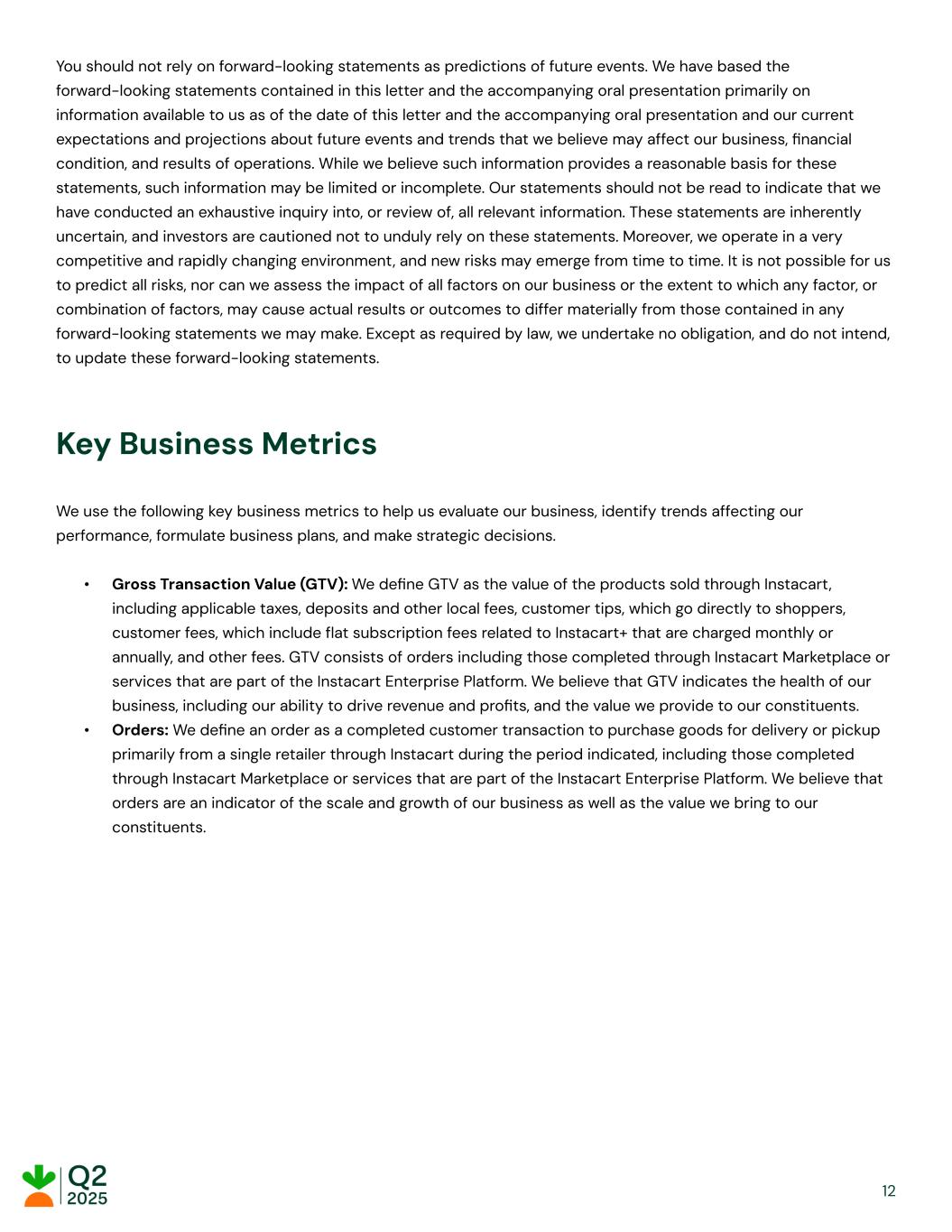 你不应该依赖前瞻性陈述作为对未来事件的预测。我们在本函和随附口头陈述中所载的前瞻性陈述主要基于截至本函和随附口头陈述之日我们可获得的信息以及我们目前对未来事件和趋势的预期和预测,我们认为这些事件和趋势可能会影响我们的业务、财务状况和经营业绩。虽然我们认为这些信息为这些声明提供了合理的基础,但这些信息可能是有限的或不完整的。我们的声明不应被解读为表明我们对所有相关信息进行了详尽的调查或审查。这些声明本质上是不确定的,告诫投资者不要过度依赖这些声明。而且,我们在竞争非常激烈和瞬息万变的环境中运营,新的风险可能会不时出现。我们无法预测所有风险,也无法评估所有因素对我们业务的影响或任何因素或因素组合可能导致实际结果或结果与我们可能做出的任何前瞻性陈述中包含的结果或结果存在重大差异的程度。除法律要求外,我们不承担任何义务,也不打算更新这些前瞻性陈述。关键业务指标我们使用以下关键业务指标来帮助我们评估我们的业务,确定影响我们业绩的趋势,制定业务计划,并做出战略决策。•总交易价值(GTV):我们将GTV定义为通过Instacart销售的产品的价值,包括适用的税收、押金和其他当地费用、直接支付给购物者的客户提示、客户费用,其中包括按月或按年收取的与Instacart +相关的固定订阅费用,以及其他费用。GTV包含的订单包括通过Instacart Marketplace完成的订单或属于Instacart Enterprise Platform的服务。我们认为,GTV表明了我们业务的健康状况,包括我们推动收入和利润的能力,以及我们为选民提供的价值。•订单:我们将订单定义为在所示期间内主要通过Instacart从单个零售商购买商品以交付或提货的已完成客户交易,包括通过Instacart Marketplace或属于Instacart Enterprise Platform的服务完成的交易。我们认为,订单是我们业务规模和增长的一个指标,也是我们为选民带来的价值。12