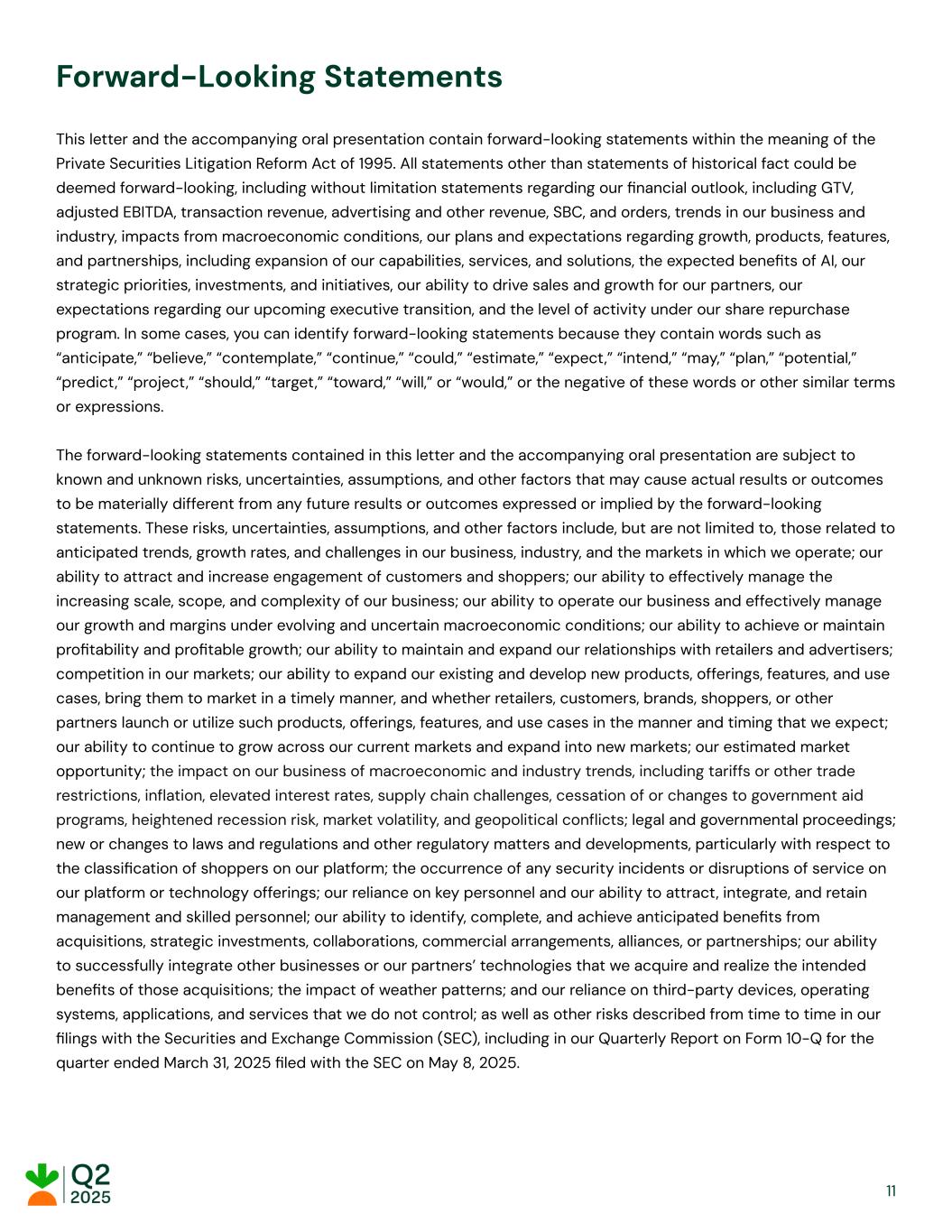 前瞻性陈述本信及随附的口头陈述包含1995年《私人证券诉讼改革法案》含义内的前瞻性陈述。除历史事实陈述之外的所有陈述都可被视为前瞻性陈述,包括但不限于关于我们财务前景的陈述,包括GTV、调整后EBITDA、交易收入、广告和其他收入、SBC,以及订单、我们的业务和行业趋势、宏观经济条件的影响、我们关于增长、产品、功能和合作伙伴关系的计划和预期,包括扩展我们的能力、服务和解决方案、人工智能的预期收益、我们的战略优先事项、投资和举措、我们为合作伙伴推动销售和增长的能力、我们对即将到来的高管过渡的预期,以及我们股票回购计划下的活动水平。在某些情况下,您可以识别前瞻性陈述,因为它们包含诸如“预期”、“相信”、“考虑”、“继续”、“可能”、“估计”、“预期”、“打算”、“可能”、“计划”、“潜在”、“预测”、“项目”、“应该”、“目标”、“走向”、“将”或“将”等词语,或这些词语或其他类似术语或表达的否定。本函和随附的口头陈述中包含的前瞻性陈述受已知和未知风险、不确定性、假设和其他因素的影响,这些因素可能导致实际结果或结果与前瞻性陈述明示或暗示的任何未来结果或结果存在重大差异。这些风险、不确定性、假设和其他因素包括但不限于与我们的业务、行业和经营所在市场的预期趋势、增长率和挑战相关的风险、不确定性、假设和其他因素;我们吸引和提高客户和购物者参与度的能力;我们有效管理不断扩大的规模、范围的能力,以及我们业务的复杂性;我们在不断变化和不确定的宏观经济条件下经营业务和有效管理增长和利润率的能力;我们实现或保持盈利和盈利增长的能力;我们维持和扩大与零售商和广告商关系的能力;我们市场的竞争;我们扩展现有产品和开发新产品、产品、功能和用例的能力,并将其及时推向市场,以及零售商、客户、品牌、购物者或其他合作伙伴是否推出或使用此类产品、产品、功能,以我们期望的方式和时机使用案例;我们在当前市场继续增长并扩展到新市场的能力;我们估计的市场机会;宏观经济和行业趋势对我们业务的影响,包括关税或其他贸易限制、通货膨胀、利率上升、供应链挑战、政府援助计划的停止或变化、衰退风险加剧、市场波动和地缘政治冲突;法律和政府诉讼;法律法规和其他监管事项和发展的新的或变化,特别是关于我们平台上购物者的分类;在我们的平台或技术产品上发生任何安全事件或服务中断;我们对关键人员的依赖以及我们吸引、整合和留住管理和技术人员的能力;我们识别、完成并从收购、战略投资、合作、商业安排、联盟或伙伴关系中实现预期收益的能力;我们成功整合我们获得的其他业务或合作伙伴的技术并实现这些收购的预期收益的能力;天气模式的影响;以及我们对第三方设备、操作系统、应用程序的依赖,和我们无法控制的服务;以及我们向美国证券交易委员会(SEC)提交的文件中不时描述的其他风险,包括我们于2025年5月8日向SEC提交的截至2025年3月31日的季度的10-Q表格季度报告中。11