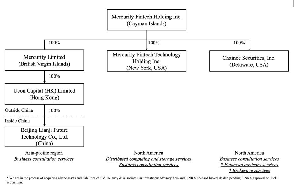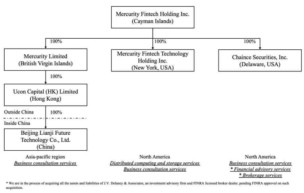 | ● | “我们”、“我们”、“公司”、“我们的公司”或“我们的”指Mercurity Fintech控股公司及其合并附属公司,包括(i)Mercurity Fintech科技控股公司,(ii)Mercurity Limited,(iii)Ucon Capital(HK)Limited,(iv)北京链基未来科技有限公司及(v)Chaince Securities; | |