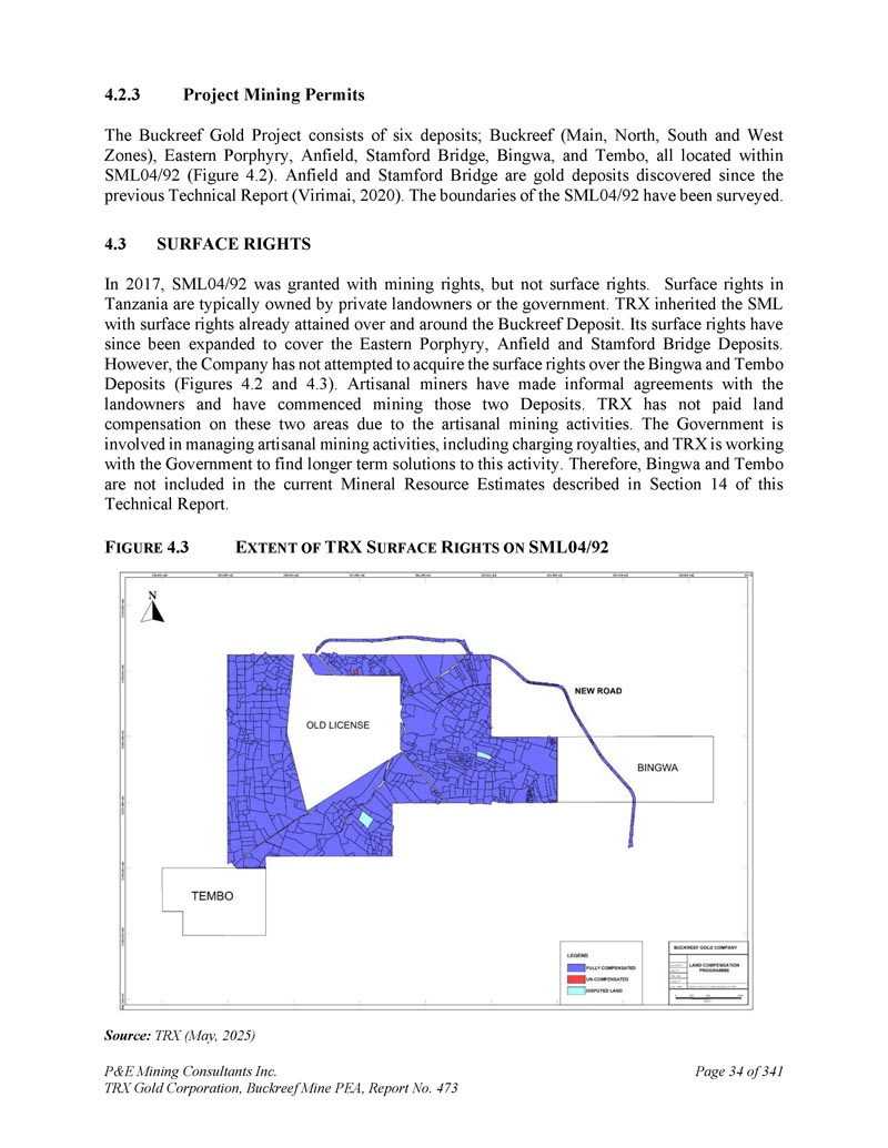 4.2.3项目采矿许可Buckreef黄金项目由六个矿床组成;Buckreef(主要、北部、南部和西部区域)、东部斑岩、安菲尔德、斯坦福桥、Bingwa和Tembo,均位于SML 04/92范围内(图4。2 ) .安菲尔德和斯坦福桥是自上一份技术报告(Virimai,2020)以来发现的金矿。SML 04/92的边界已完成勘测。4.32017年的地表权,SML 04/92被授予采矿权,但不是地表权。坦桑尼亚的地面权通常由私人土地所有者或政府拥有。TRX继承了SML,其表面权利已经在Buckreef矿床上方和周围获得。此后,其地表权利已扩大到涵盖东部斑岩、安菲尔德和斯坦福桥矿床。然而,公司并未尝试收购Bingwa和Tembo矿床的地表权利(图4。2和4。3 ) .手工采矿者已与土地所有者达成非正式协议,并已开始开采这两个矿床。由于存在手工采矿活动,TRX尚未就这两个区域支付土地补偿款。政府参与管理手工采矿活动,包括收取特许权使用费,而TRX正与政府合作,为这项活动寻找更长期的解决方案。因此,Bingwa和Tembo不包括在本技术报告第14节所述的当前矿产资源估算中。F IGUR4。SML 04/92上TRX URFACE R IGHTS的3个EXNT来源:TRX(2025年5月)P & E Mining Consultants Inc. TRX Gold Corporation,Buckreef Mine PEA,第473号报告,共341页第34页
