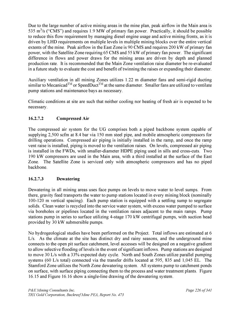 P & E Mining Consultants Inc. TRX Gold Corporation,Buckreef Mine PEA,报告第473期,共341页第226页由于矿山计划中有大量活跃矿区,主要区域的峰值气流为535 m3/s(“CMS”),要求1。一次风机功率9兆瓦。实际上,应该可以通过管理柴油发动机的使用和积极的采矿前沿来减少这种流量需求,因为它是由矿山整个垂直范围内多个采矿区块的多个级别的LHD需求驱动的。东区峰值气流为90CMS,需要200kW的一次风机功率,卫星区需要65CMS和55kW的一次风机功率。矿区的流量和电力消耗的显着差异是由深度和计划生产速率驱动的。建议在未来的研究中重新评估主区通风提升直径,以评估与提升成对或扩大其直径的成本和收益。所有矿区的辅助通风利用1。直径22米的风机和与Mecanicad TM或SpeedDuct TM相似的半刚性管道在相同直径下。必要时使用较小的风机对泵站和维修舱进行通风。现场的气候条件是这样的,预计既不需要冷却也不需要加热新鲜空气。2.压缩空气用于UG的压缩空气系统既包括一个能够在8点供应2,500 SCFM的管道主干系统。4 bar via 150 mm钢管,以及用于钻井作业的移动式常压压缩机。匝道内最初安装压缩空气管道,一旦安装了匝道通风口提升,管道被移至通风提升。在水平上,压缩空气管道安装在FWD中,更小直径的HDPE管道用于门槛和横切。主区使用两台190千瓦压缩机,东区地面安装第三台。卫星区仅使用常压压缩机进行服务,没有管道主干。3.所有矿区的脱水脱水都在水平面上使用面泵将水输送到水平面坑。从那里,重力馈送将水输送到位于每个采矿区块的泵站(标称100-120米垂直间距)。每个泵站都配有沉降池,用于分离固体。干净的水被回收到服务用水系统中,多余的水通过位于主坡道附近通风隆起的钻孔或管道被泵送到地面。泵站采用4级170千瓦离心泵串联泵至地面,吸头由30千瓦潜水泵提供。没有对该项目进行水文地质研究。总流入量估计为6 L/s。由于现场的气候有明显的旱季和雨季,而地下矿山连接到露天矿坑表面集水区,将在负梯度上设计水平通道,以便在出现大量流入时有选择地淹没水平。泵站设计为以33%的预期工作周期移动30 L/s。北部和南部区域使用平行泵送系统(共60 L/s),通过位于595、835和1,045 EL的转移漂移连接。斯坦福区利用北区脱水系统。所有系统都泵送到地表的集水塘,表面管道将它们连接到工艺和水处理厂。图16。15和图16。16日展示了脱水系统的单线绘图。