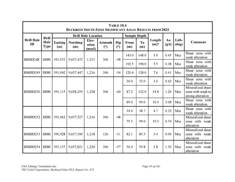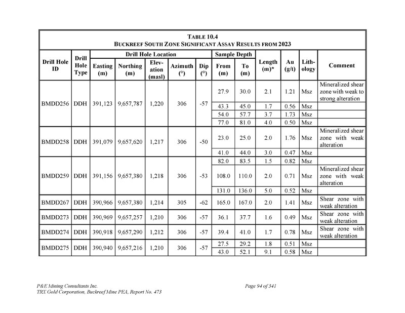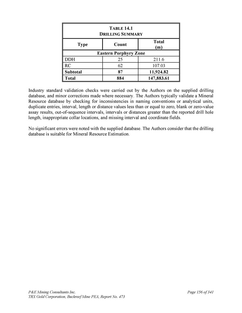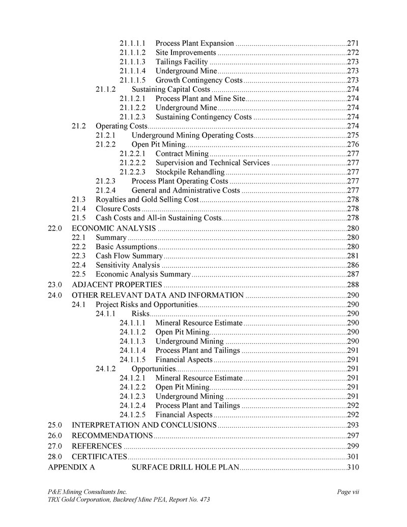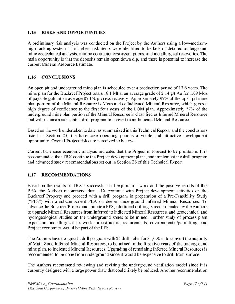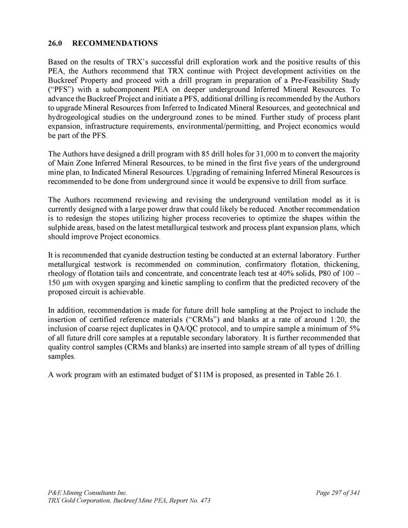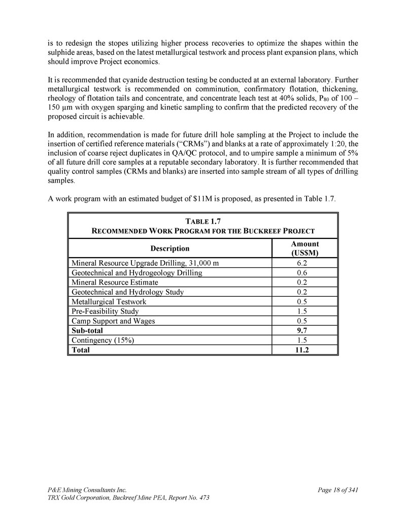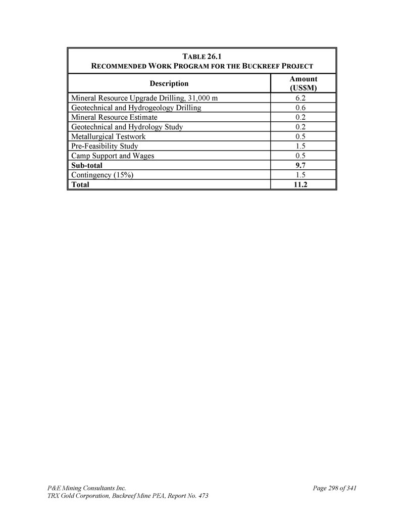 P & E Mining Consultants Inc. TRX Gold Corporation,Buckreef Mine PEA,Report No. 473 page 298 of 341 t ABLE 26.1 R ECOMMENDED W ORK P ROGRAM for the B UCKREEF P ROJECT amount(US $ m)Description 6.2 Mineral Resource Upgrade Drilling,31,000 m0.6 Geotechnical and Hydrogeology Drilling 0.2 Mineral Resource Estimate 0.2 Geotechnical and Hydroology Study 0.5 Metallurgical Testwork 1.5 Pre-Feasibility Study 0.5 Camp Support and Wages 9.7Sub-total 1.5 contingency(15%)11.2 Total