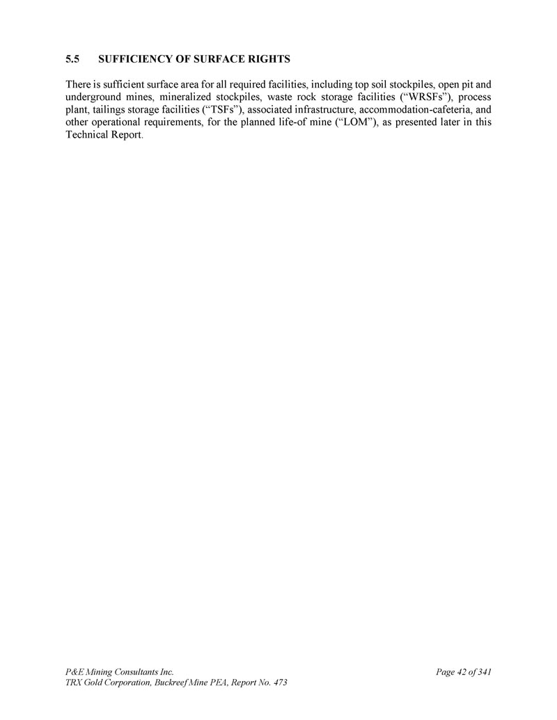 P & E Mining Consultants Inc. TRX Gold Corporation,Buckreef Mine PEA,第473号报告,3415.5地表权的充足性有足够的表面积用于所有所需设施,包括顶土库存、露天矿和地下矿山、矿化库存、废石储存设施(“WRSF”)、加工厂、尾矿储存设施(“TSF”)、相关基础设施、住宿-自助餐厅和其他运营要求,以满足本技术报告后面部分介绍的矿山计划寿命(“LOM”)。