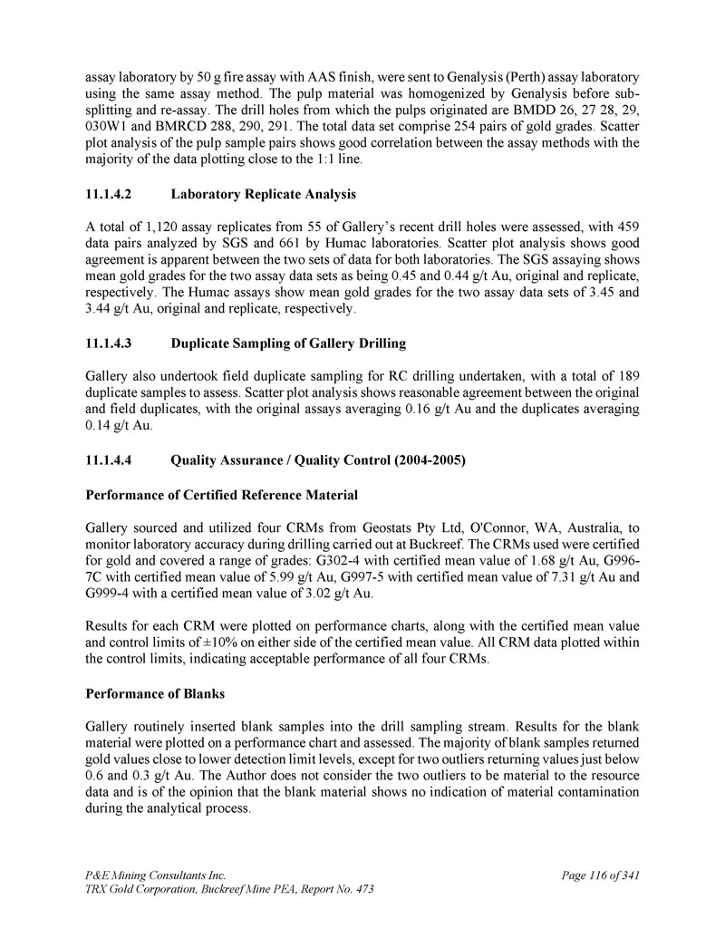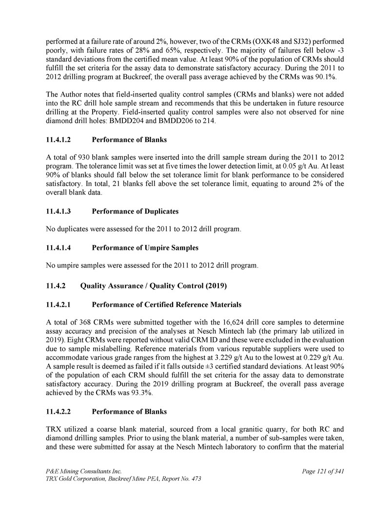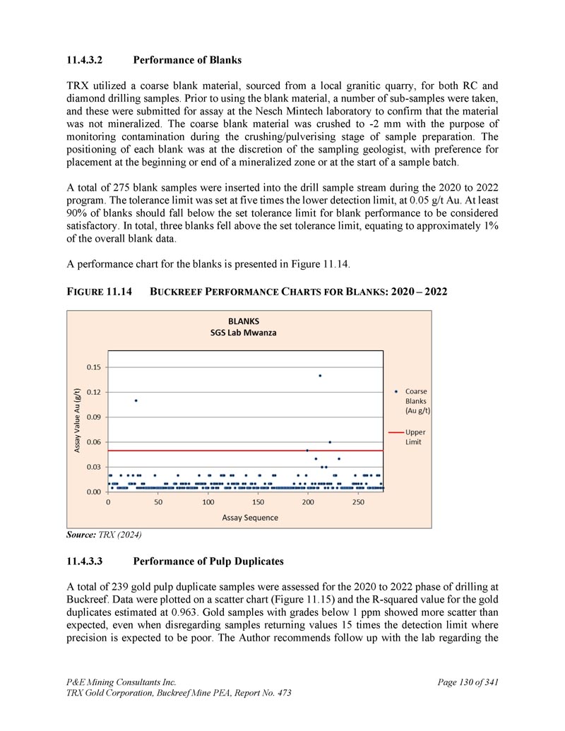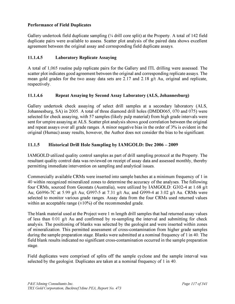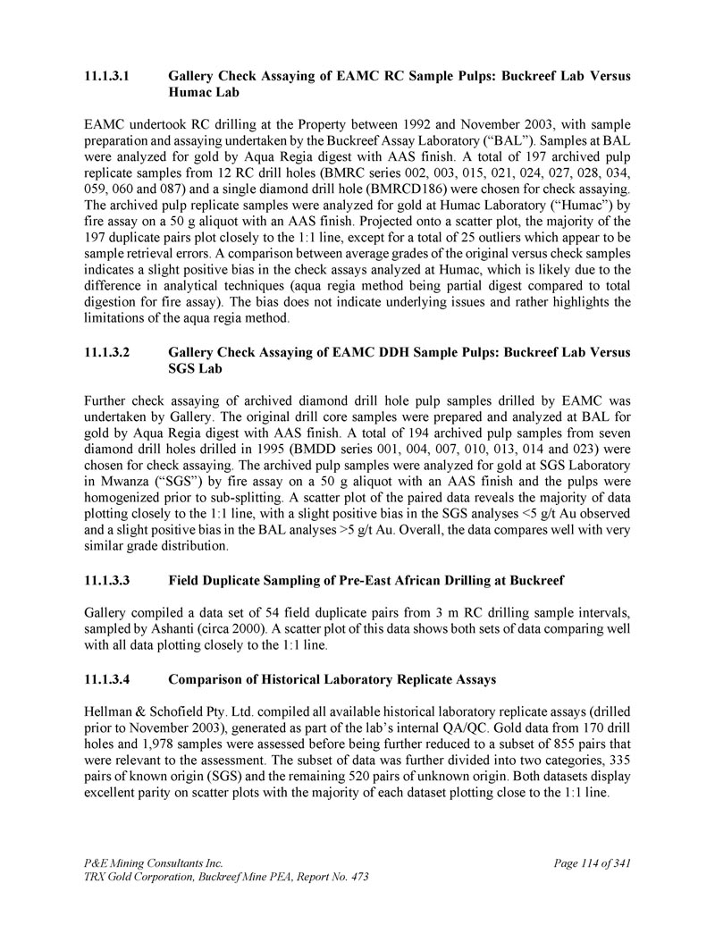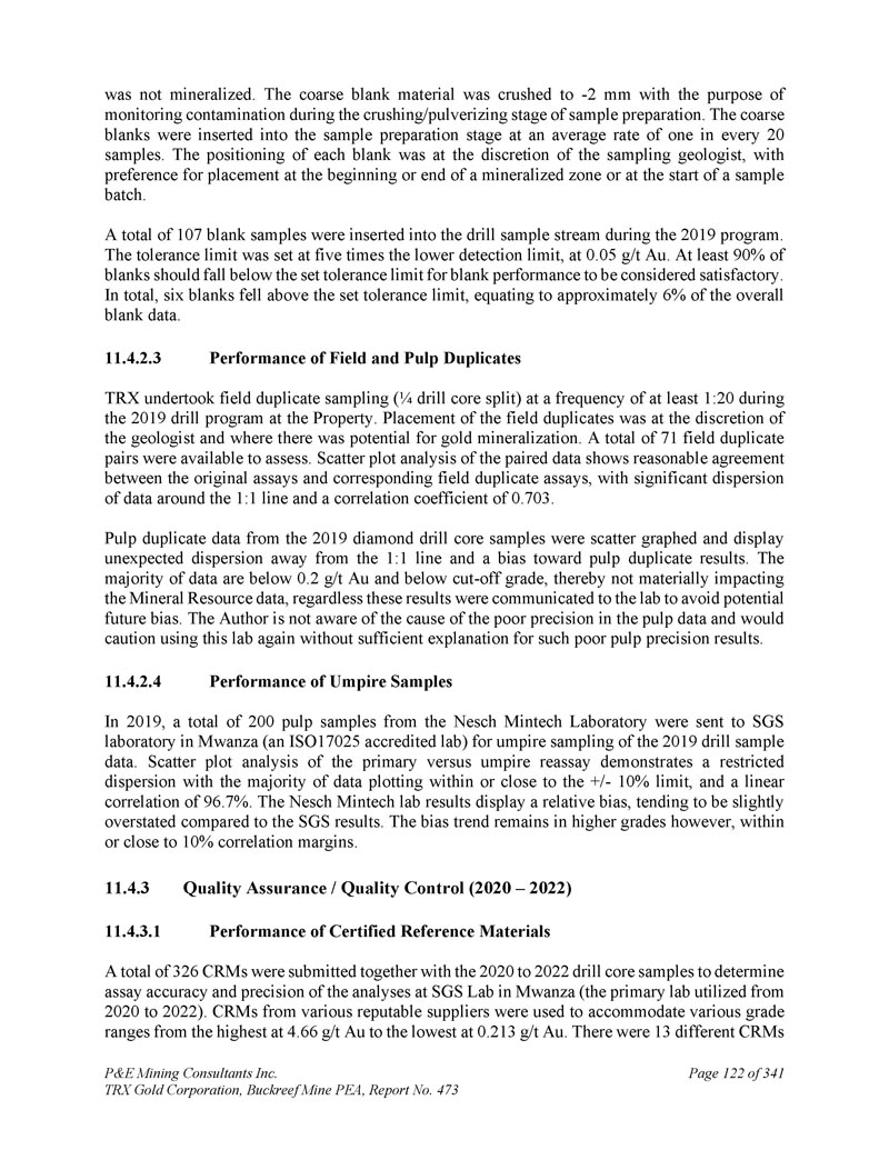 P & E Mining Consultants Inc. TRX Gold Corporation,Buckreef Mine PEA,报告第473页iii. 10.7对钻探段的评论.................................................................................... 1101。样本准备、分析和安全性......................................................1122。Buckreef的历史钻孔采样......................................................................1 1211.1.11 1.21 1.1.3历史样品制备、分析和安全......................1 12 2历史质量保证/质量控制......................11 3历史钻孔采样:2003年12月前EAMC-Gallery Gold合并......................................................................1 131。EAMC RC样品浆的图库检查检测:Buckreef Lab对Humac Lab..................................................1 142。EAMC DDH样品浆的图库检查检测:Buckreef Lab与SGS Lab......................................................1 143。Buckreef东非前钻探现场重复采样......................................................................................1 144。历史实验室复制分析的比较........ 1145。历史RC钻孔的Gallery孪生程序...........1 1511.1.4 Gallery Gold的历史钻孔采样:2003年12月– 2005年..1 151。Genalysis(Perth)Lab对SGS(Mwanza)Lab制备的样品纸浆的再测定.......................................................1 152。实验室复制品分析.......................................................1 163。巷道钻孔重复采样......................................1 164。质量保证/质量控制(2004-2005年).................1 165。实验室复制检测......................................................1 176。第二化验实验室(ALS,约翰内斯堡)的重复化验......................................................................1 1711.1.5 IAMGOLD的历史钻孔采样:2006年12月– 2009年....1 172。体积密度的测定.................................................................................... 1183。Buckreef最近的TRX钻孔采样(2011 – 2022)........................ 1111。样品制备、分析和安全性......................................................1 181。钻芯取样方法......................................................1 182。RC/RAB采样方法.................................................... 1193。样品制备与分析..................................................1 204。最近的质量保证/质量控制(TRX:2011 – 2022)......................1 201。质量保证/质量控制(2011 – 2012)..................................1 201。认证参考资料的性能......................1202。毛坯的性能...................................................................12 13。复制品的性能.....................................................................12 14。公断人样品的性能...................................................12 111.4.2质量保证/质量控制(2019)....................................12111.4. 2.21 1.4. 2.21 1.4. 2.31 1.4. 2.31 1.4. 2.4认证参比材料的性能....................12 1空白件性能....................................................12 1现场和纸浆复制品的性能....................................12 2公断人样品的性能....................................12 211.4.3质量保证/质量控制(2020 – 2022)....................12 211.4. 3.21 1.4. 3.3认证参比材料的性能....................12 2空白件性能....................................................130纸浆复制品的性能....................................................13011.4.4质量保证/质量控制(斯坦福桥2025)....................13 1