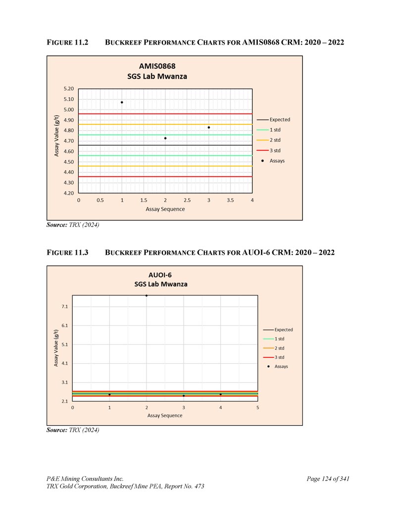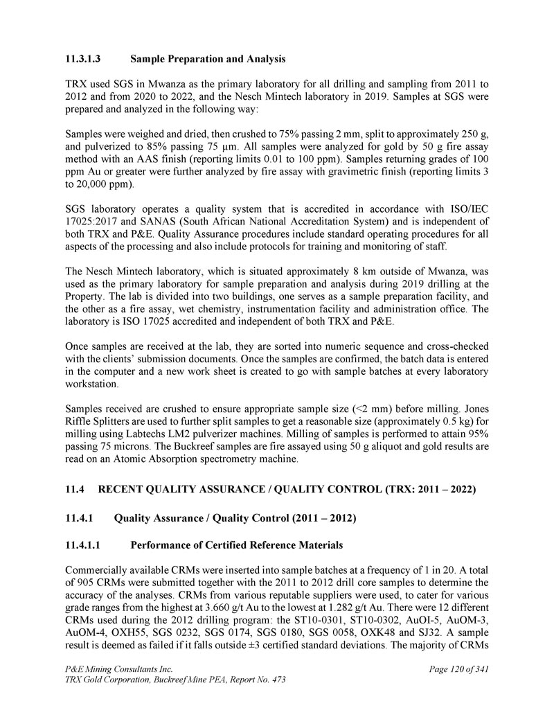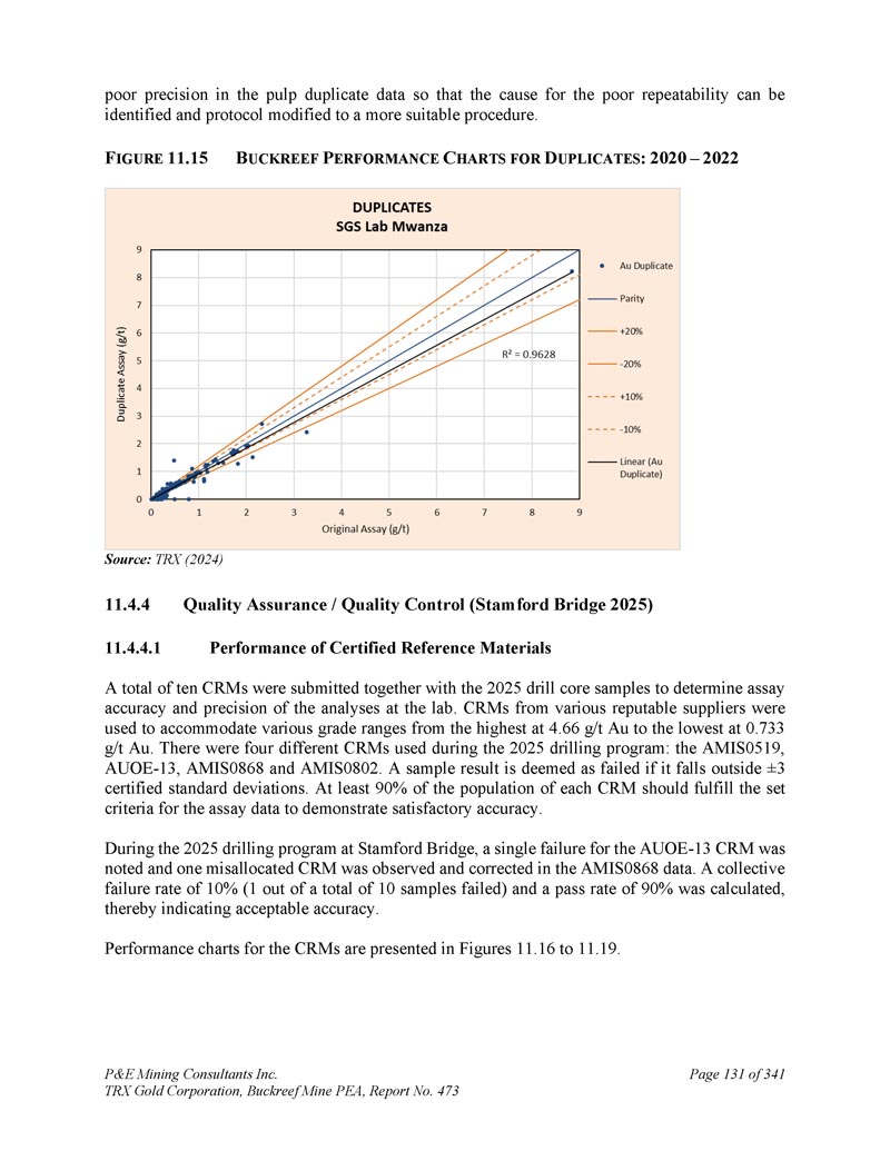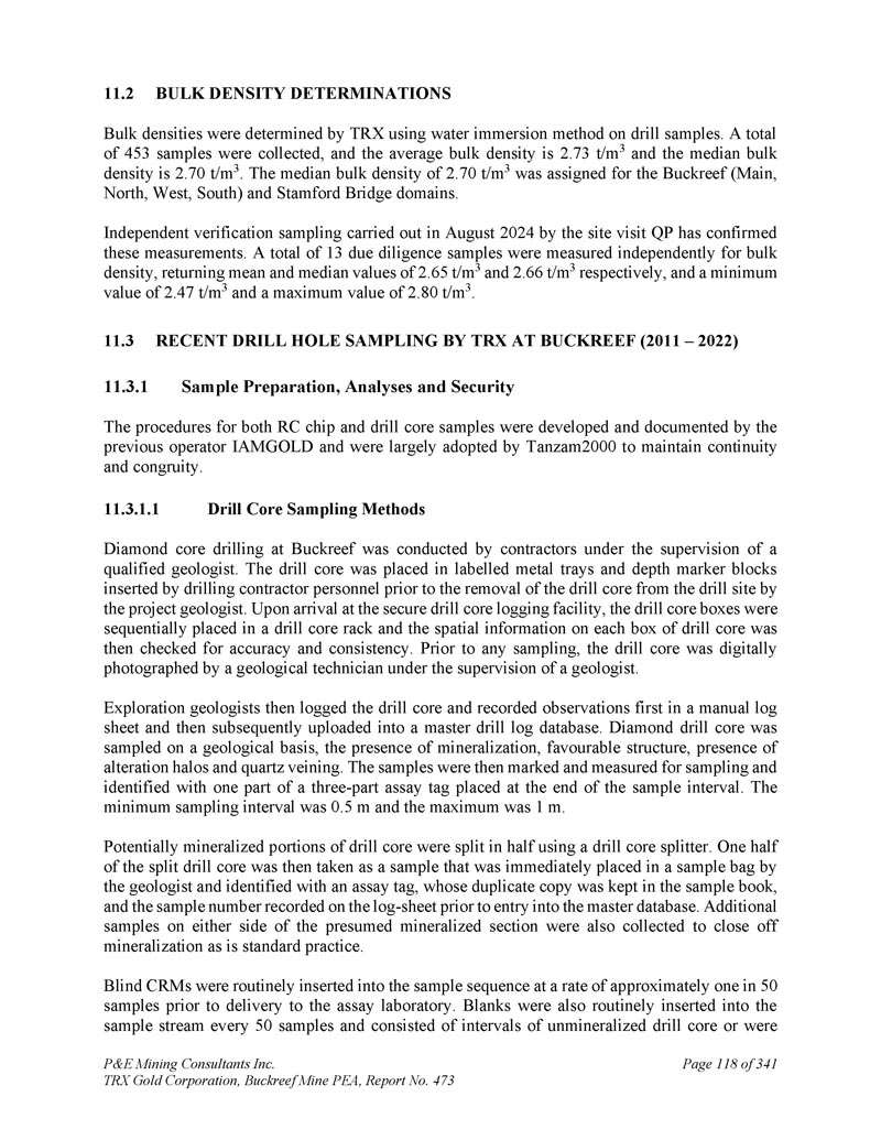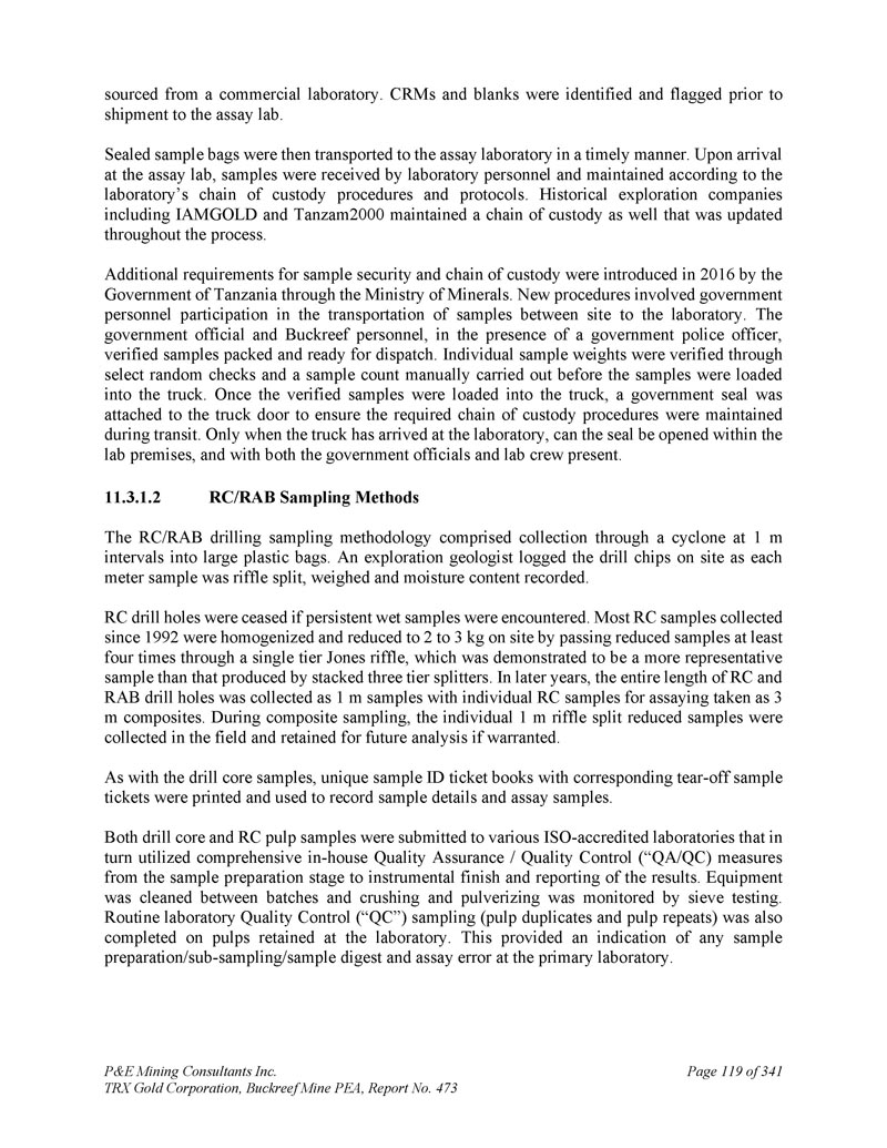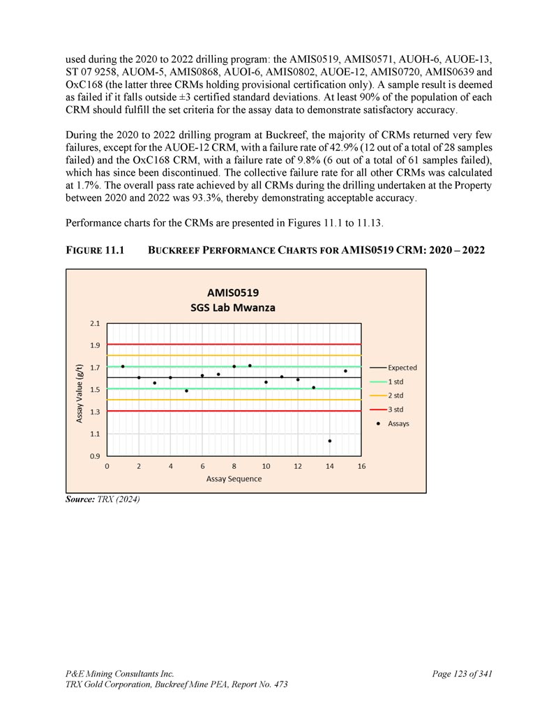 P & E Mining Consultants Inc. TRX Gold Corporation,Buckreef Mine PEA,报告第473页iii. 10.7对钻探段的评论.................................................................................... 1101。样本准备、分析和安全性......................................................1122。Buckreef的历史钻孔采样......................................................................1 1211.1.11 1.21 1.1.3历史样品制备、分析和安全......................1 12 2历史质量保证/质量控制......................11 3历史钻孔采样:2003年12月前EAMC-Gallery Gold合并......................................................................1 131。EAMC RC样品浆的图库检查检测:Buckreef Lab对Humac Lab..................................................1 142。EAMC DDH样品浆的图库检查检测:Buckreef Lab与SGS Lab......................................................1 143。Buckreef东非前钻探现场重复采样......................................................................................1 144。历史实验室复制分析的比较........ 1145。历史RC钻孔的Gallery孪生程序...........1 1511.1.4 Gallery Gold的历史钻孔采样:2003年12月– 2005年..1 151。Genalysis(Perth)Lab对SGS(Mwanza)Lab制备的样品纸浆的再测定.......................................................1 152。实验室复制品分析.......................................................1 163。巷道钻孔重复采样......................................1 164。质量保证/质量控制(2004-2005年).................1 165。实验室复制检测......................................................1 176。第二化验实验室(ALS,约翰内斯堡)的重复化验......................................................................1 1711.1.5 IAMGOLD的历史钻孔采样:2006年12月– 2009年....1 172。体积密度的测定.................................................................................... 1183。Buckreef最近的TRX钻孔采样(2011 – 2022)........................ 1111。样品制备、分析和安全性......................................................1 181。钻芯取样方法......................................................1 182。RC/RAB采样方法.................................................... 1193。样品制备与分析..................................................1 204。最近的质量保证/质量控制(TRX:2011 – 2022)......................1 201。质量保证/质量控制(2011 – 2012)..................................1 201。认证参考资料的性能......................1202。毛坯的性能...................................................................12 13。复制品的性能.....................................................................12 14。公断人样品的性能...................................................12 111.4.2质量保证/质量控制(2019)....................................12111.4. 2.21 1.4. 2.21 1.4. 2.31 1.4. 2.31 1.4. 2.4认证参比材料的性能....................12 1空白件性能....................................................12 1现场和纸浆复制品的性能....................................12 2公断人样品的性能....................................12 211.4.3质量保证/质量控制(2020 – 2022)....................12 211.4. 3.21 1.4. 3.3认证参比材料的性能....................12 2空白件性能....................................................130纸浆复制品的性能....................................................13011.4.4质量保证/质量控制(斯坦福桥2025)....................13 1