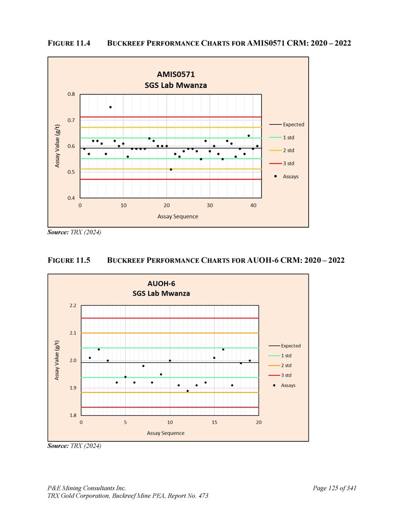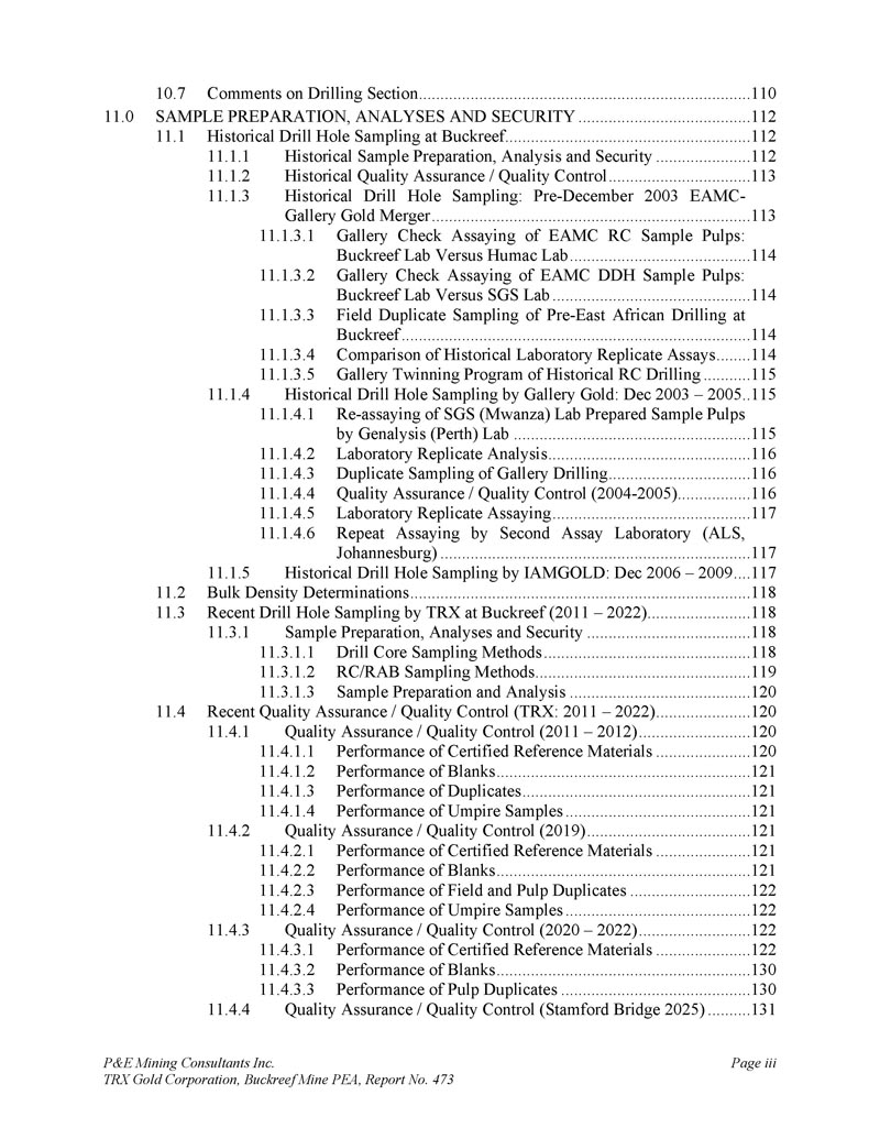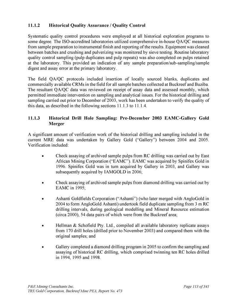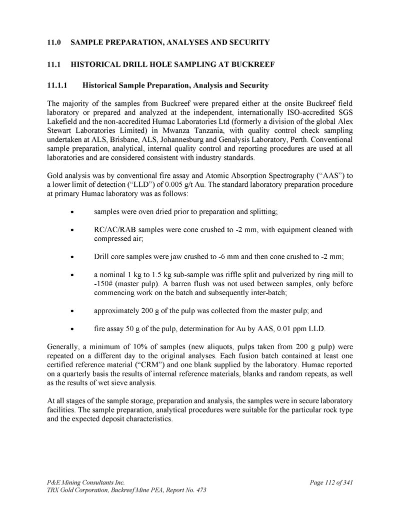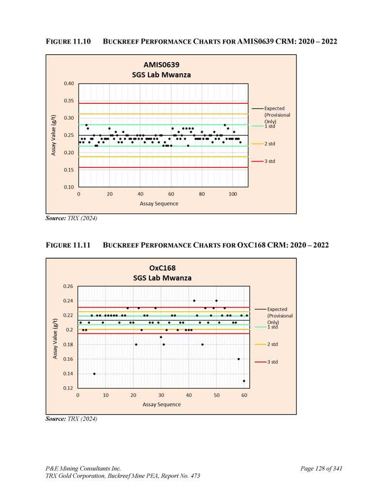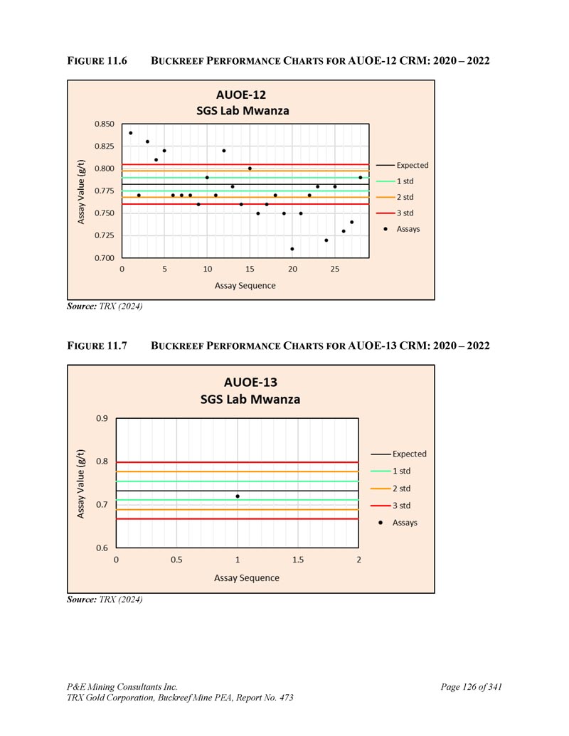 P & E Mining Consultants Inc. TRX Gold Corporation,Buckreef Mine PEA,报告第473页iii. 10.7对钻探段的评论.................................................................................... 1101。样本准备、分析和安全性......................................................1122。Buckreef的历史钻孔采样......................................................................1 1211.1.11 1.21 1.1.3历史样品制备、分析和安全......................1 12 2历史质量保证/质量控制......................11 3历史钻孔采样:2003年12月前EAMC-Gallery Gold合并......................................................................1 131。EAMC RC样品浆的图库检查检测:Buckreef Lab对Humac Lab..................................................1 142。EAMC DDH样品浆的图库检查检测:Buckreef Lab与SGS Lab......................................................1 143。Buckreef东非前钻探现场重复采样......................................................................................1 144。历史实验室复制分析的比较........ 1145。历史RC钻孔的Gallery孪生程序...........1 1511.1.4 Gallery Gold的历史钻孔采样:2003年12月– 2005年..1 151。Genalysis(Perth)Lab对SGS(Mwanza)Lab制备的样品纸浆的再测定.......................................................1 152。实验室复制品分析.......................................................1 163。巷道钻孔重复采样......................................1 164。质量保证/质量控制(2004-2005年).................1 165。实验室复制检测......................................................1 176。第二化验实验室(ALS,约翰内斯堡)的重复化验......................................................................1 1711.1.5 IAMGOLD的历史钻孔采样:2006年12月– 2009年....1 172。体积密度的测定.................................................................................... 1183。Buckreef最近的TRX钻孔采样(2011 – 2022)........................ 1111。样品制备、分析和安全性......................................................1 181。钻芯取样方法......................................................1 182。RC/RAB采样方法.................................................... 1193。样品制备与分析..................................................1 204。最近的质量保证/质量控制(TRX:2011 – 2022)......................1 201。质量保证/质量控制(2011 – 2012)..................................1 201。认证参考资料的性能......................1202。毛坯的性能...................................................................12 13。复制品的性能.....................................................................12 14。公断人样品的性能...................................................12 111.4.2质量保证/质量控制(2019)....................................12111.4. 2.21 1.4. 2.21 1.4. 2.31 1.4. 2.31 1.4. 2.4认证参比材料的性能....................12 1空白件性能....................................................12 1现场和纸浆复制品的性能....................................12 2公断人样品的性能....................................12 211.4.3质量保证/质量控制(2020 – 2022)....................12 211.4. 3.21 1.4. 3.3认证参比材料的性能....................12 2空白件性能....................................................130纸浆复制品的性能....................................................13011.4.4质量保证/质量控制(斯坦福桥2025)....................13 1