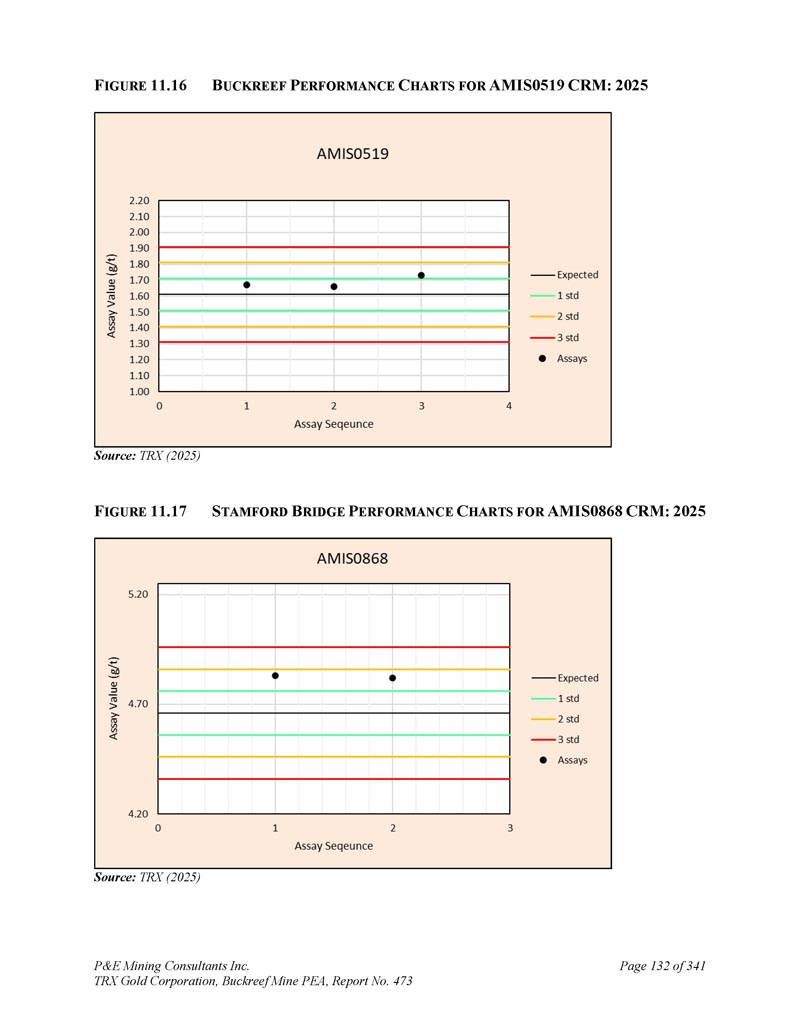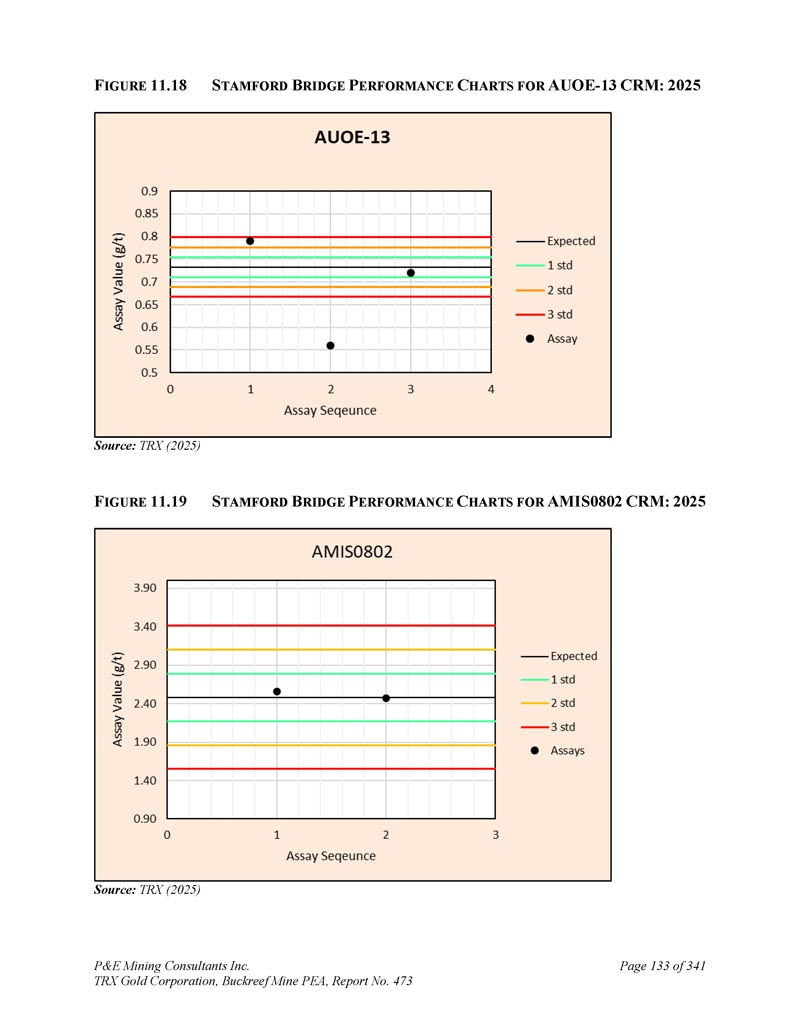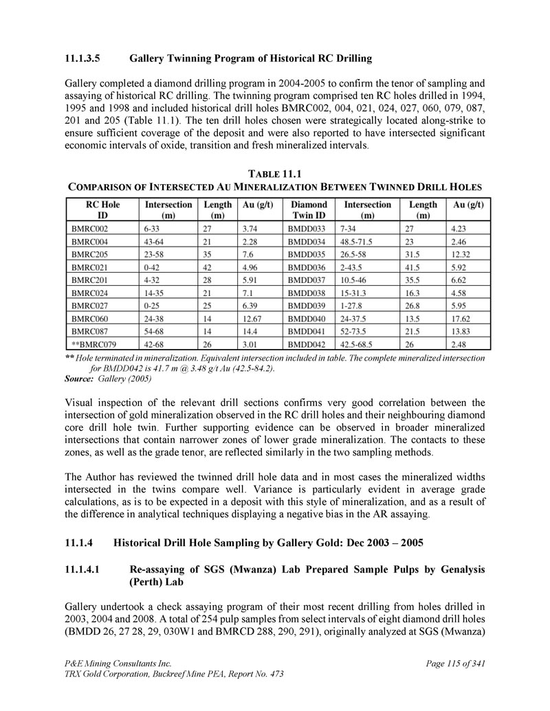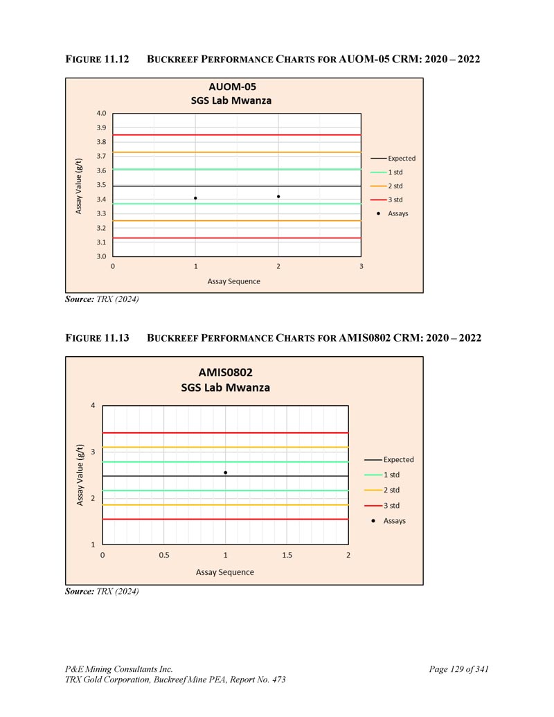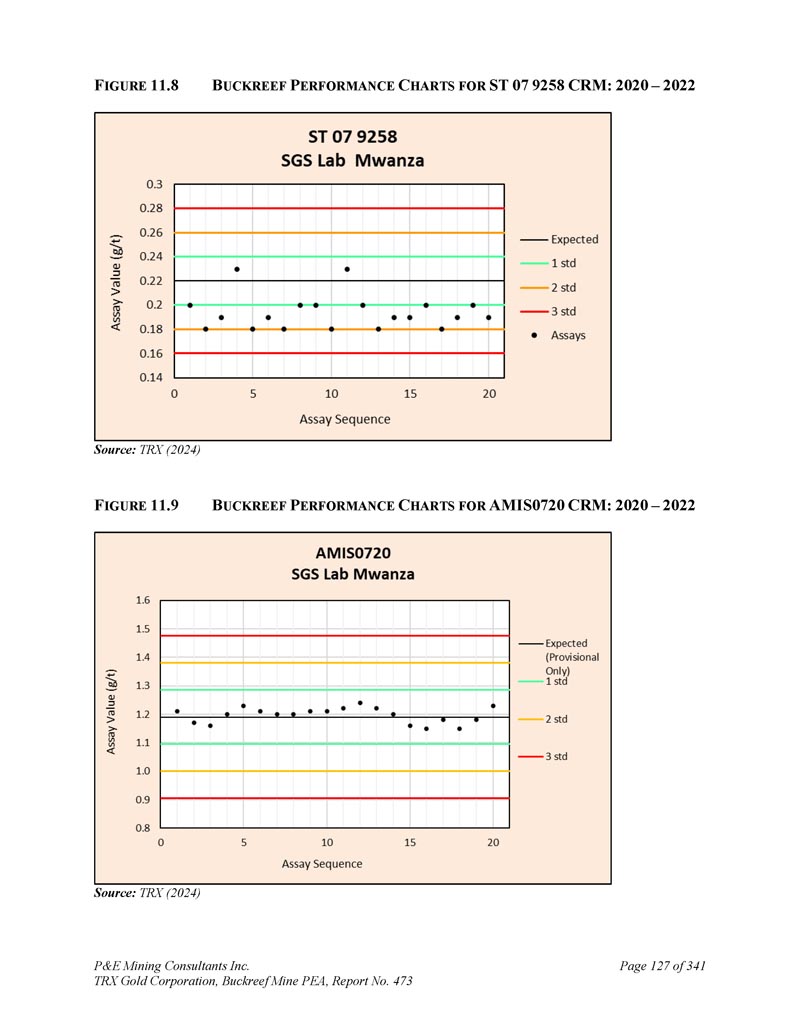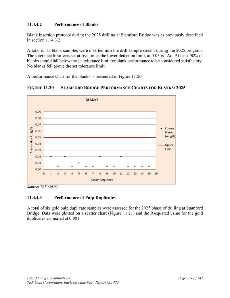 P & E Mining Consultants Inc. TRX Gold Corporation,Buckreef Mine PEA,报告第473页iii. 10.7对钻探段的评论.................................................................................... 1101。样本准备、分析和安全性......................................................1122。Buckreef的历史钻孔采样......................................................................1 1211.1.11 1.21 1.1.3历史样品制备、分析和安全......................1 12 2历史质量保证/质量控制......................11 3历史钻孔采样:2003年12月前EAMC-Gallery Gold合并......................................................................1 131。EAMC RC样品浆的图库检查检测:Buckreef Lab对Humac Lab..................................................1 142。EAMC DDH样品浆的图库检查检测:Buckreef Lab与SGS Lab......................................................1 143。Buckreef东非前钻探现场重复采样......................................................................................1 144。历史实验室复制分析的比较........ 1145。历史RC钻孔的Gallery孪生程序...........1 1511.1.4 Gallery Gold的历史钻孔采样:2003年12月– 2005年..1 151。Genalysis(Perth)Lab对SGS(Mwanza)Lab制备的样品纸浆的再测定.......................................................1 152。实验室复制品分析.......................................................1 163。巷道钻孔重复采样......................................1 164。质量保证/质量控制(2004-2005年).................1 165。实验室复制检测......................................................1 176。第二化验实验室(ALS,约翰内斯堡)的重复化验......................................................................1 1711.1.5 IAMGOLD的历史钻孔采样:2006年12月– 2009年....1 172。体积密度的测定.................................................................................... 1183。Buckreef最近的TRX钻孔采样(2011 – 2022)........................ 1111。样品制备、分析和安全性......................................................1 181。钻芯取样方法......................................................1 182。RC/RAB采样方法.................................................... 1193。样品制备与分析..................................................1 204。最近的质量保证/质量控制(TRX:2011 – 2022)......................1 201。质量保证/质量控制(2011 – 2012)..................................1 201。认证参考资料的性能......................1202。毛坯的性能...................................................................12 13。复制品的性能.....................................................................12 14。公断人样品的性能...................................................12 111.4.2质量保证/质量控制(2019)....................................12111.4. 2.21 1.4. 2.21 1.4. 2.31 1.4. 2.31 1.4. 2.4认证参比材料的性能....................12 1空白件性能....................................................12 1现场和纸浆复制品的性能....................................12 2公断人样品的性能....................................12 211.4.3质量保证/质量控制(2020 – 2022)....................12 211.4. 3.21 1.4. 3.3认证参比材料的性能....................12 2空白件性能....................................................130纸浆复制品的性能....................................................13011.4.4质量保证/质量控制(斯坦福桥2025)....................13 1